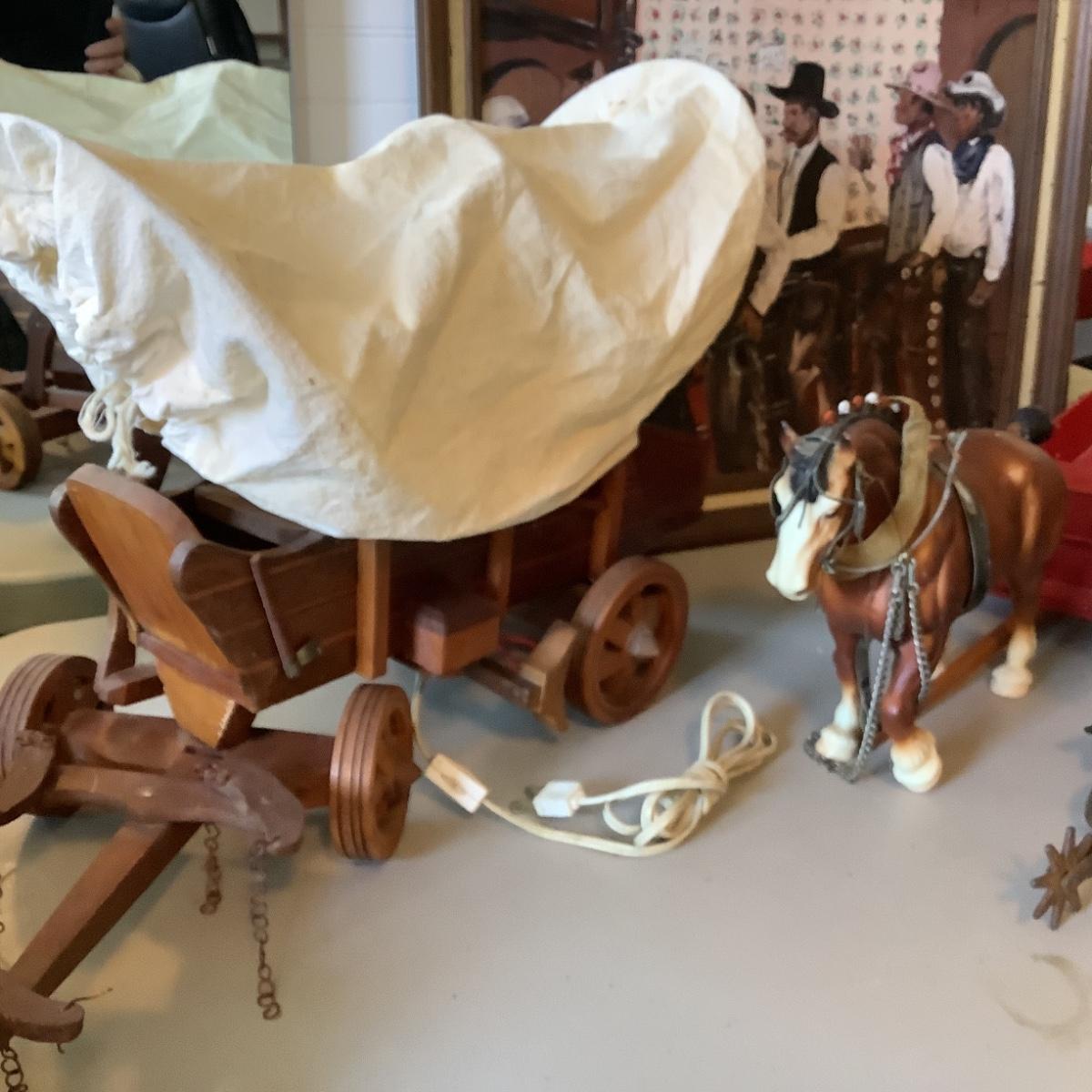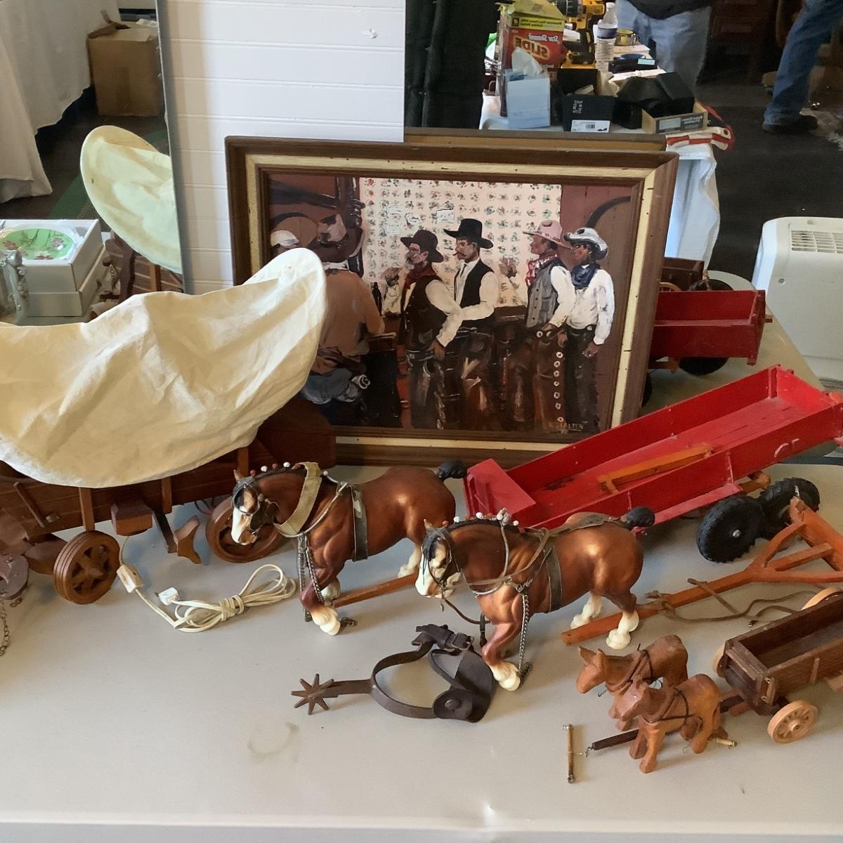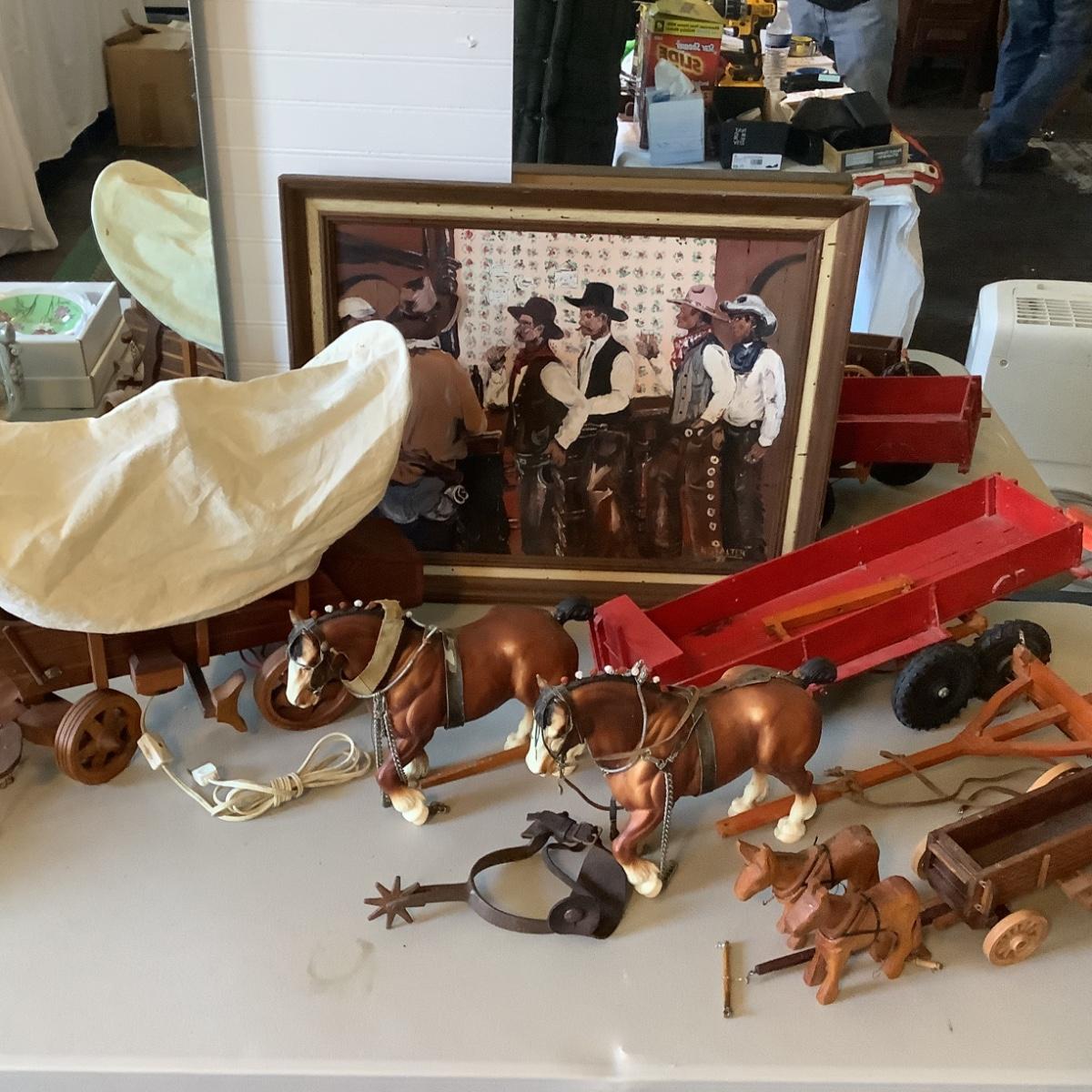 The lot contains horses, wagons, spur, and a wagon lamp.
