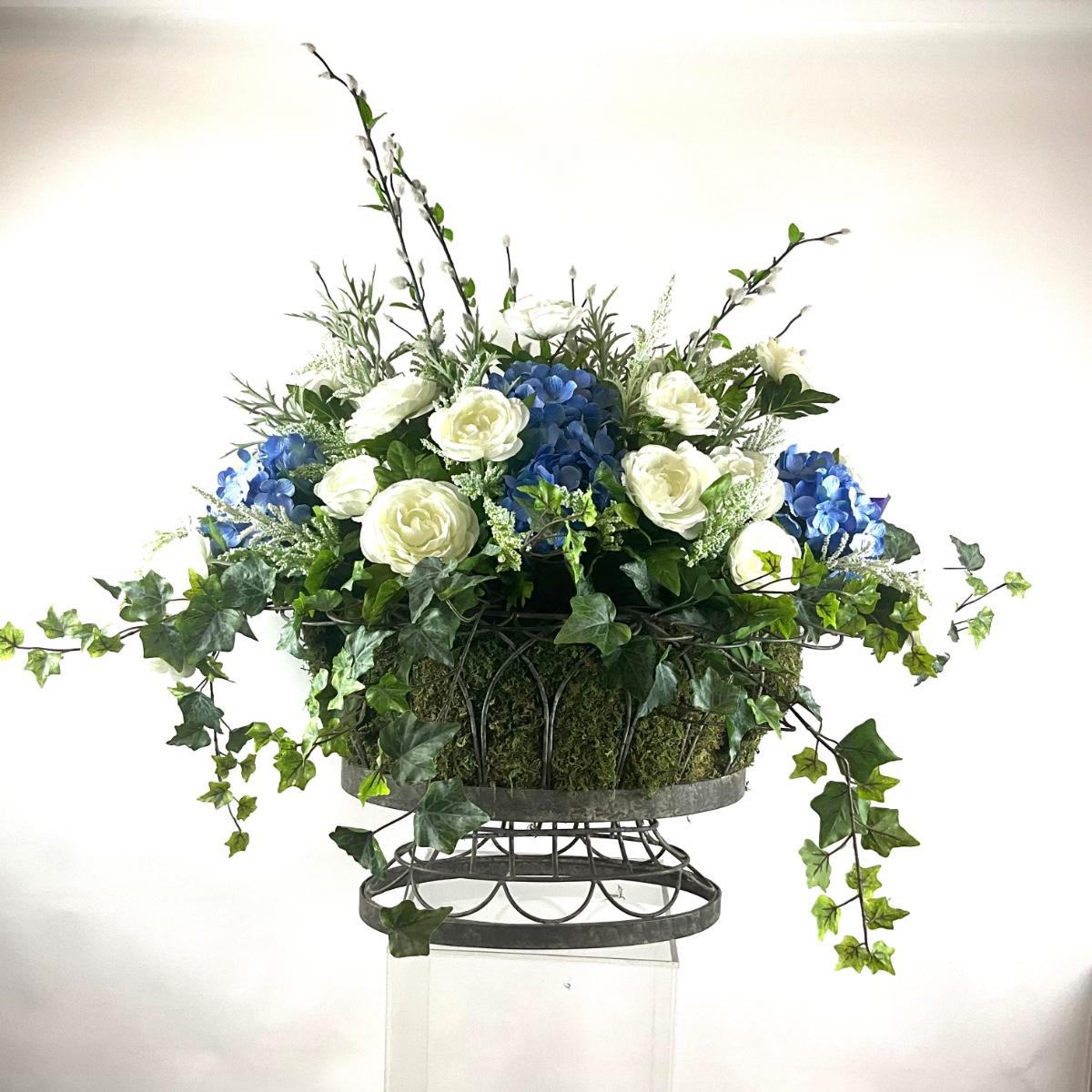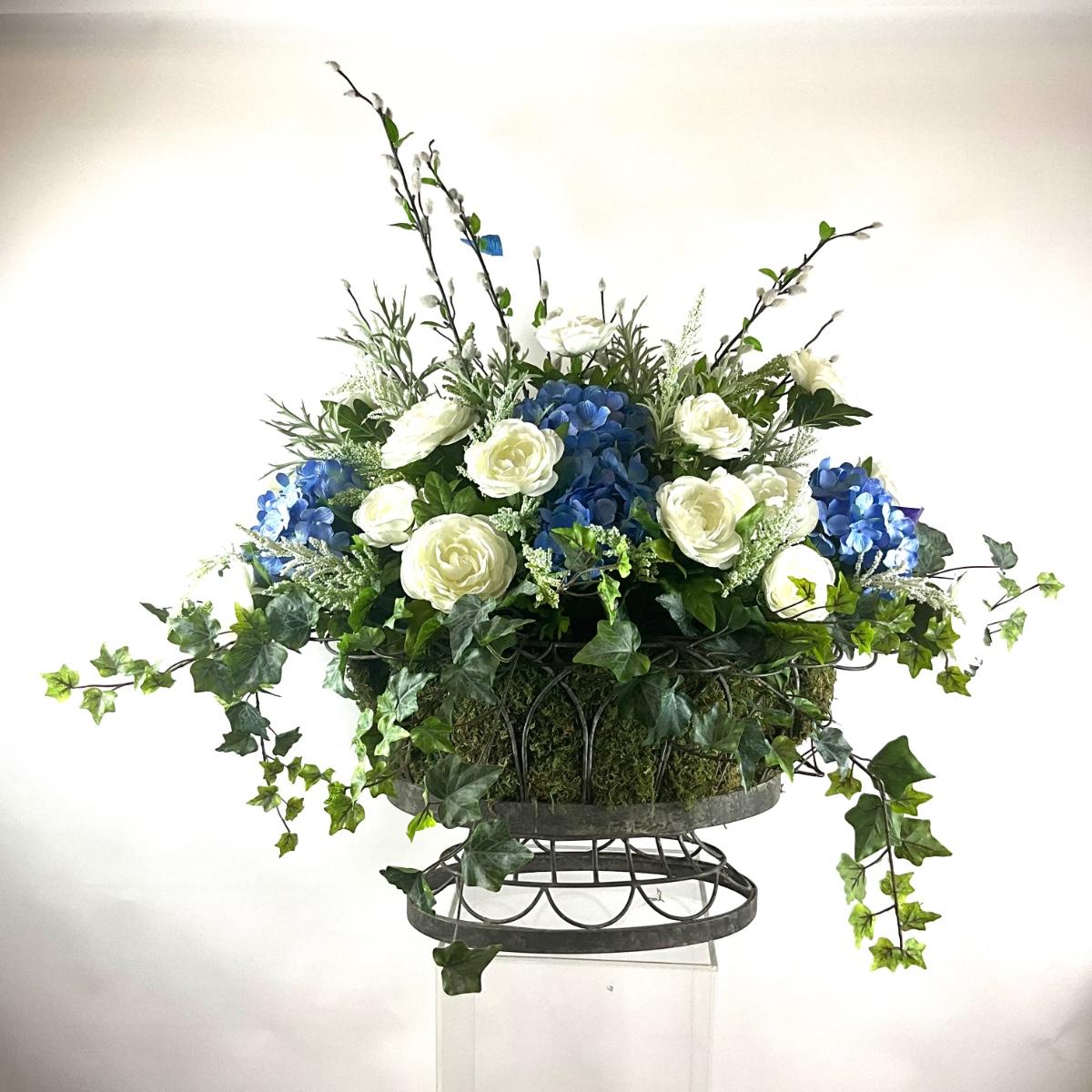 Consisting of Spanish moss inside metal base , white silk roses, blue hydrangea, and variegated ivy