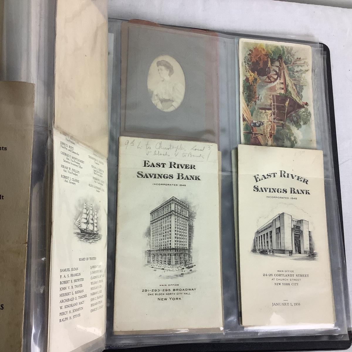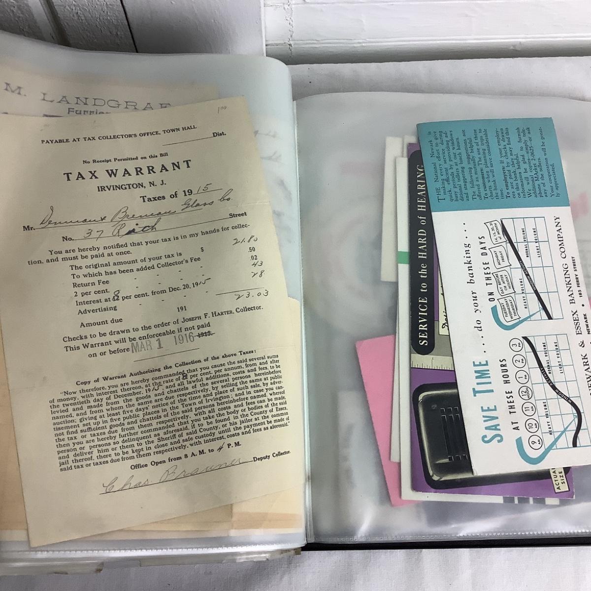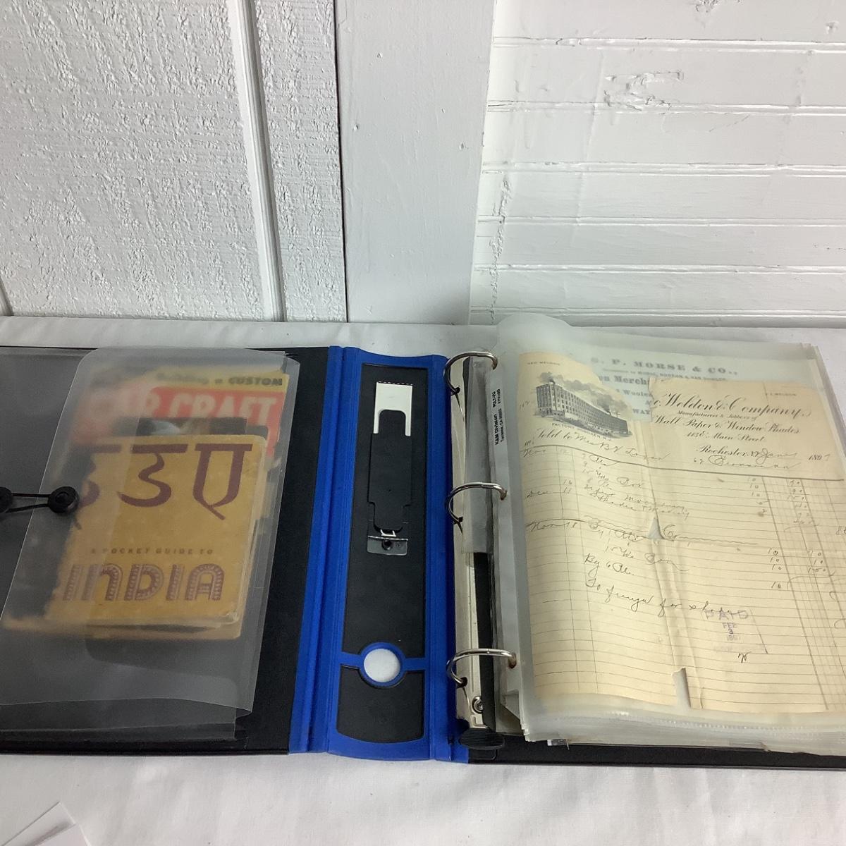Binder containing pages of collectible paper items such as receipts, cards and more.