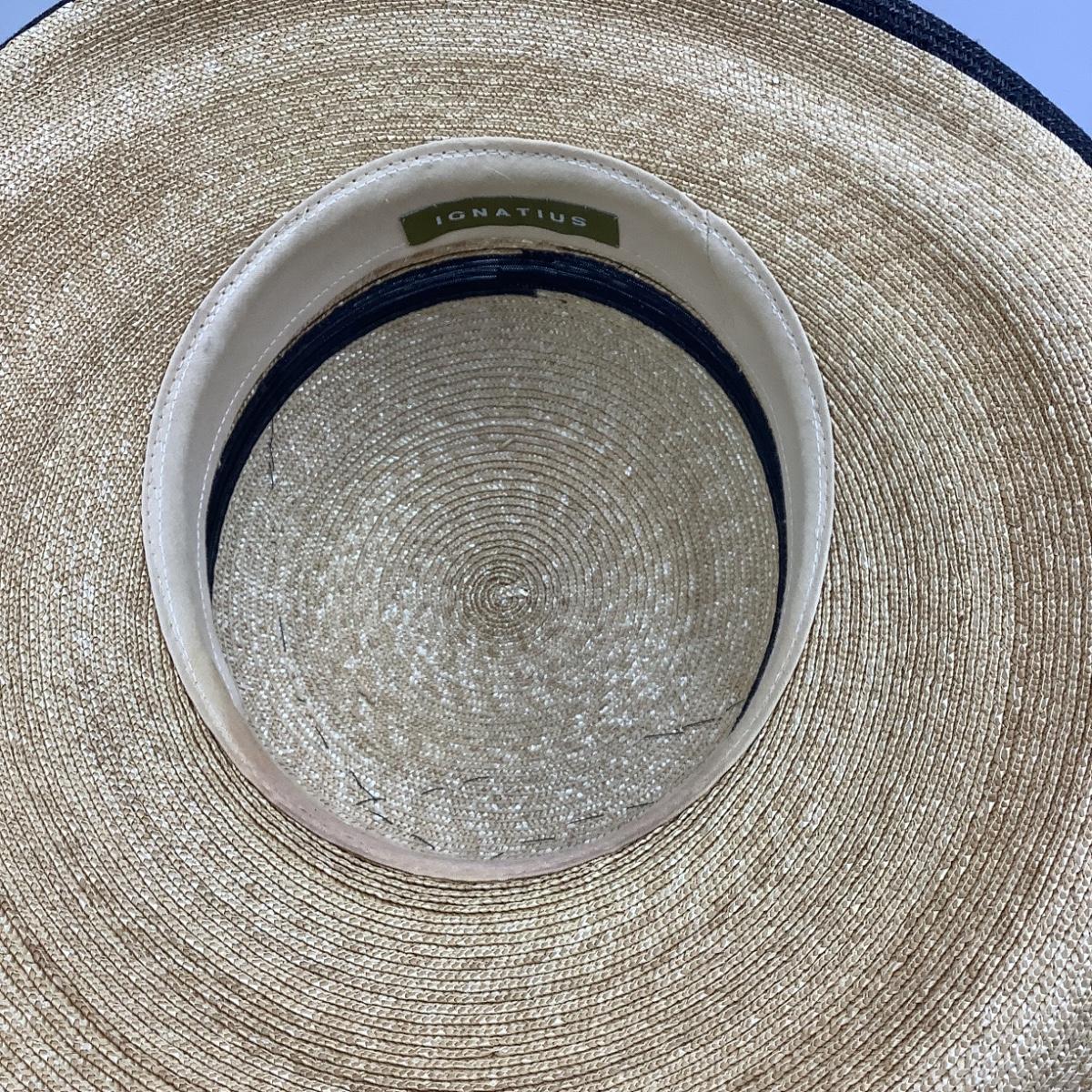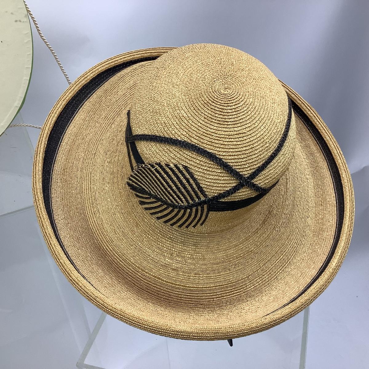 Hat is a size small, handmade straw/raffia, black and tan in color. The hat internal measurement is 7.25" and the diameter from brim to brim is 14".