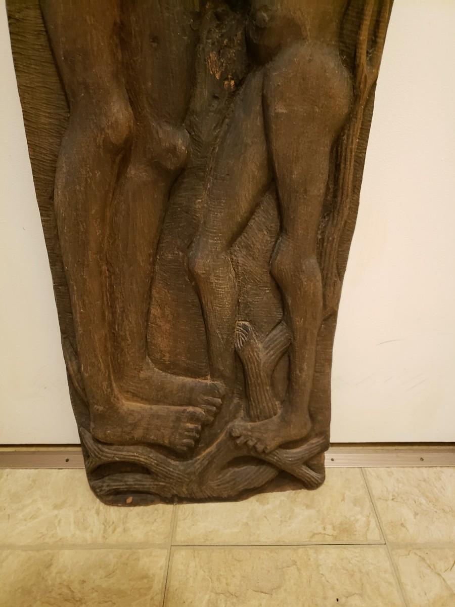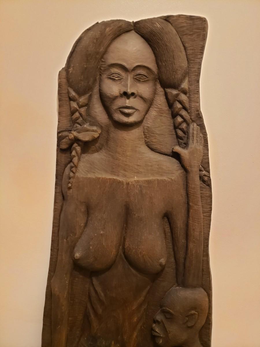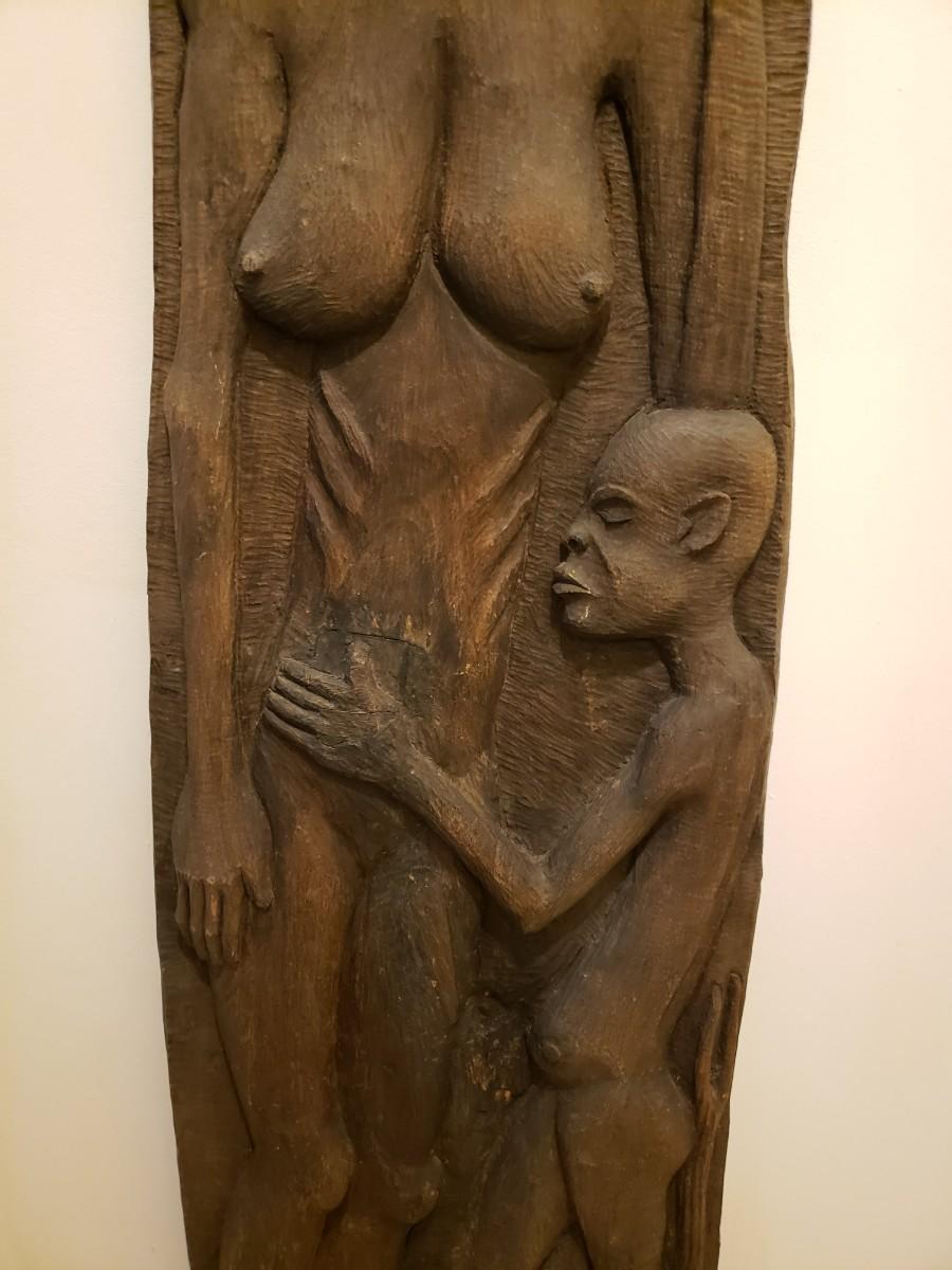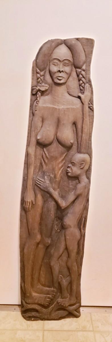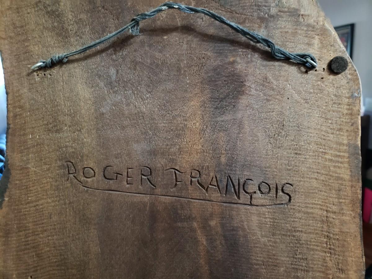 Mother with child statue. Possible water damage visible on the back only. 65"x15" signed on the back. Roger Francois is the artist and is world renowned for his work.