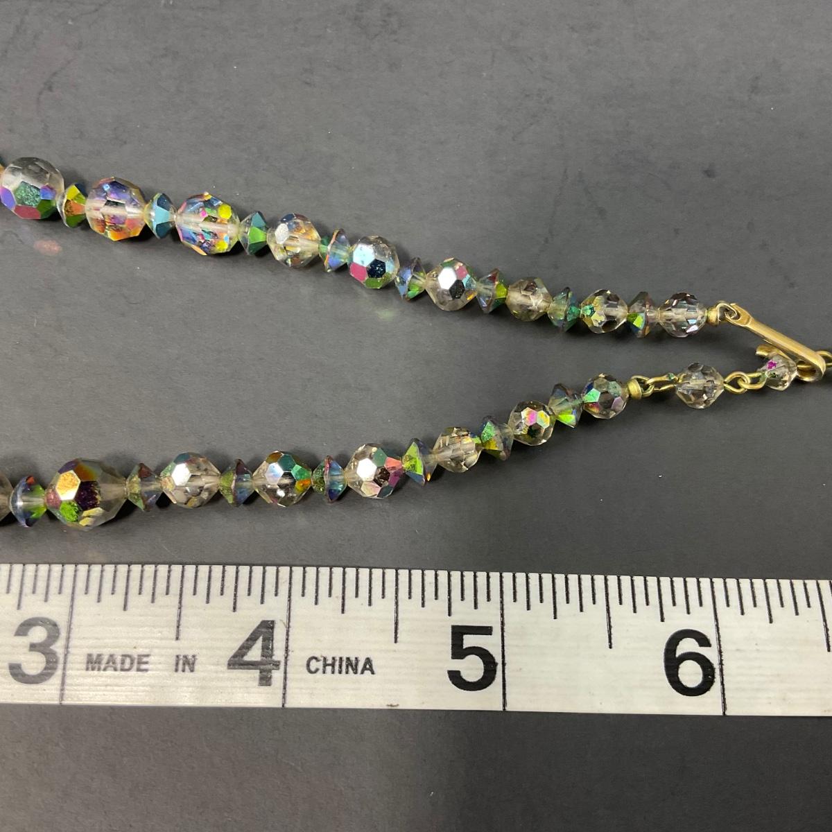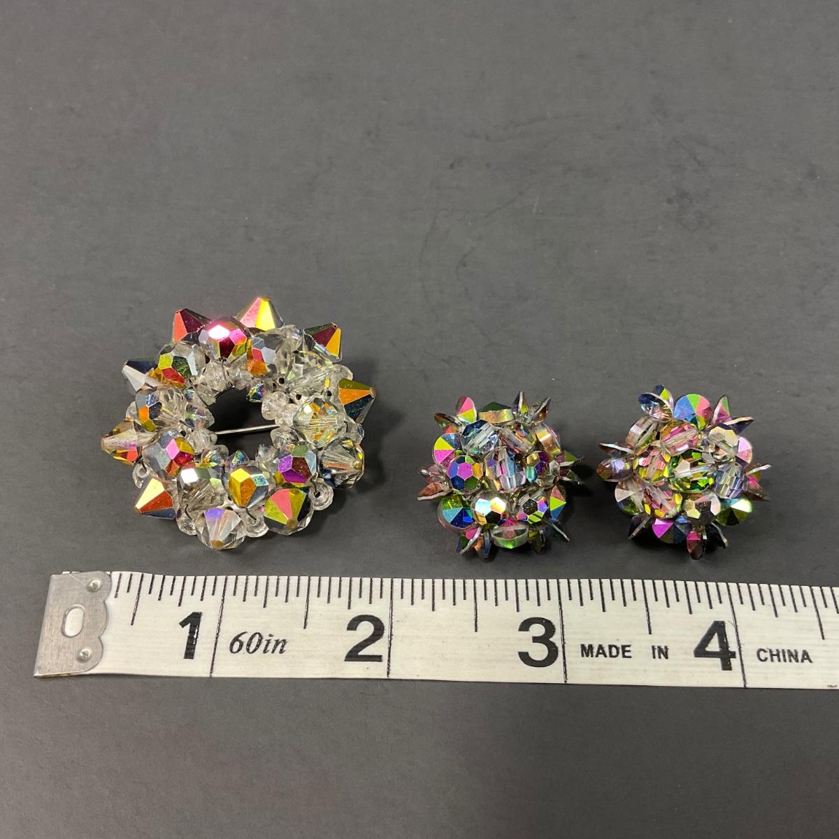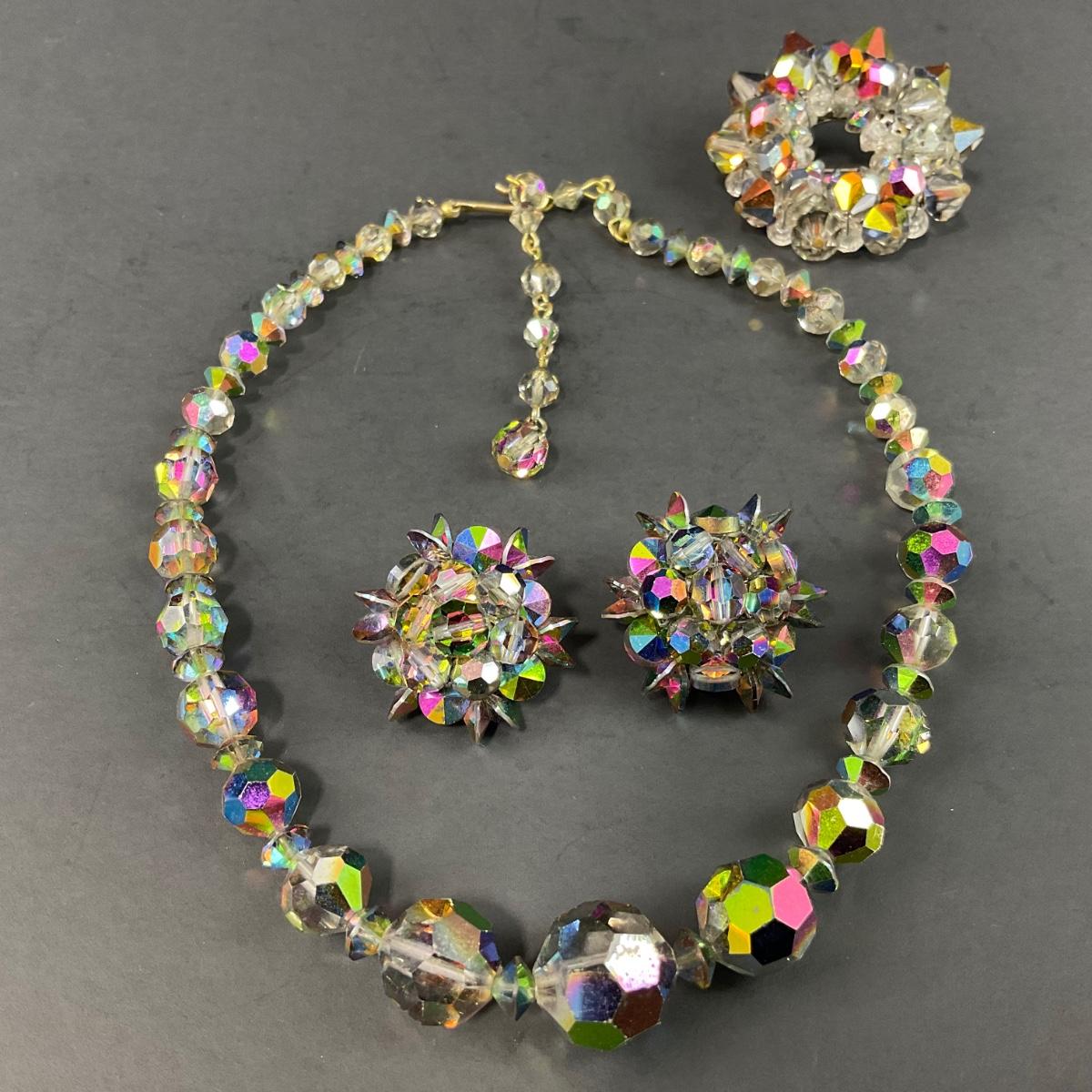 One vintage Smokey Aurora set including one necklace, one pair of clip earrings, and one brooch. Please see photos for details and condition. Any condition statement is given as a courtesy to a client, is an opinion, and should not be treated as a statement of fact. Reference to condition written, oral or within a condition report shall not be regarded as a full account of condition and may not include all defects, alterations, or restorations. Absence of a condition report does not imply a lot is flawless or lacking imperfections or damage. Katherine’s Auction & Appraisal Service shall have no responsibility for any error or omission. Returns shall not be accepted on the basis of condition. ::: Shipping is available on this lot. If you require shipping you must let us know at the close of the auction. We will coordinate with you after the item has been won. Shipping fees will include insurance up to or exceeding the value of all items being mailed. If you have any questions regarding this lot please contact the auctioneer either via this website, by direct email or by phone. PICK UP TIMES and other important information can be found in the TERMS and DESCRIPTION of the auction. Please take a look for pertinent information. Thanks!