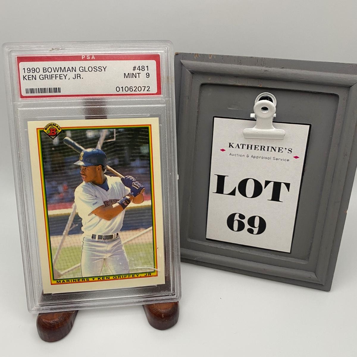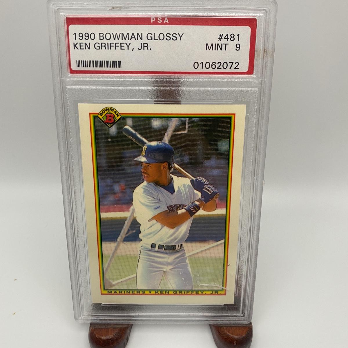 1990 Bowman glossy Ken Griffey Jr. Graded Mint 9 card. Please see photos for details and condition. ::: Shipping is available on this lot. If you require shipping you must let us know at the close of the auction. We will coordinate with you after the item has been won. Shipping fees will include insurance up to or exceeding the value of all items being mailed. If you have any questions regarding this lot please contact the auctioneer either via this website, by direct email or by phone. PICK UP TIMES and other important information can be found in the TERMS and DESCRIPTION of the auction. Please take a look for pertinent information. Thanks!