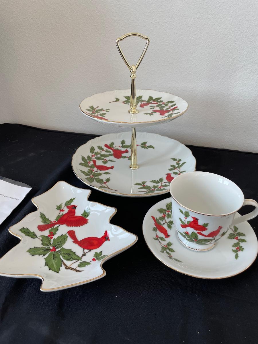 69- Lefton Red Cardinal 10 cups/saucers, tiered plate, Candy dish