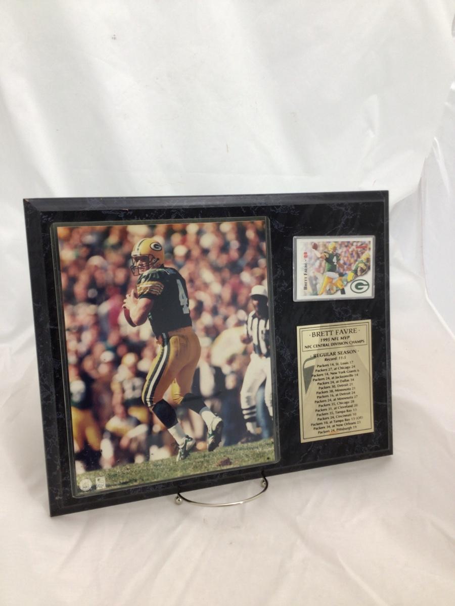 1995 Brett Farve Wall plaque with card. 12 inches by 15 inches. Please see photos for details and condition. ::: Shipping is available on this lot. If you require shipping you must let us know at the close of the auction. We will coordinate with you after the item has been won. Shipping fees will include insurance up to or exceeding the value of all items being mailed. If you have any questions regarding this lot please contact the auctioneer either via this website, by direct email or by phone. PICK UP TIMES and other important information can be found in the TERMS and DESCRIPTION of the auction. Please take a look for pertinent information. Thanks!