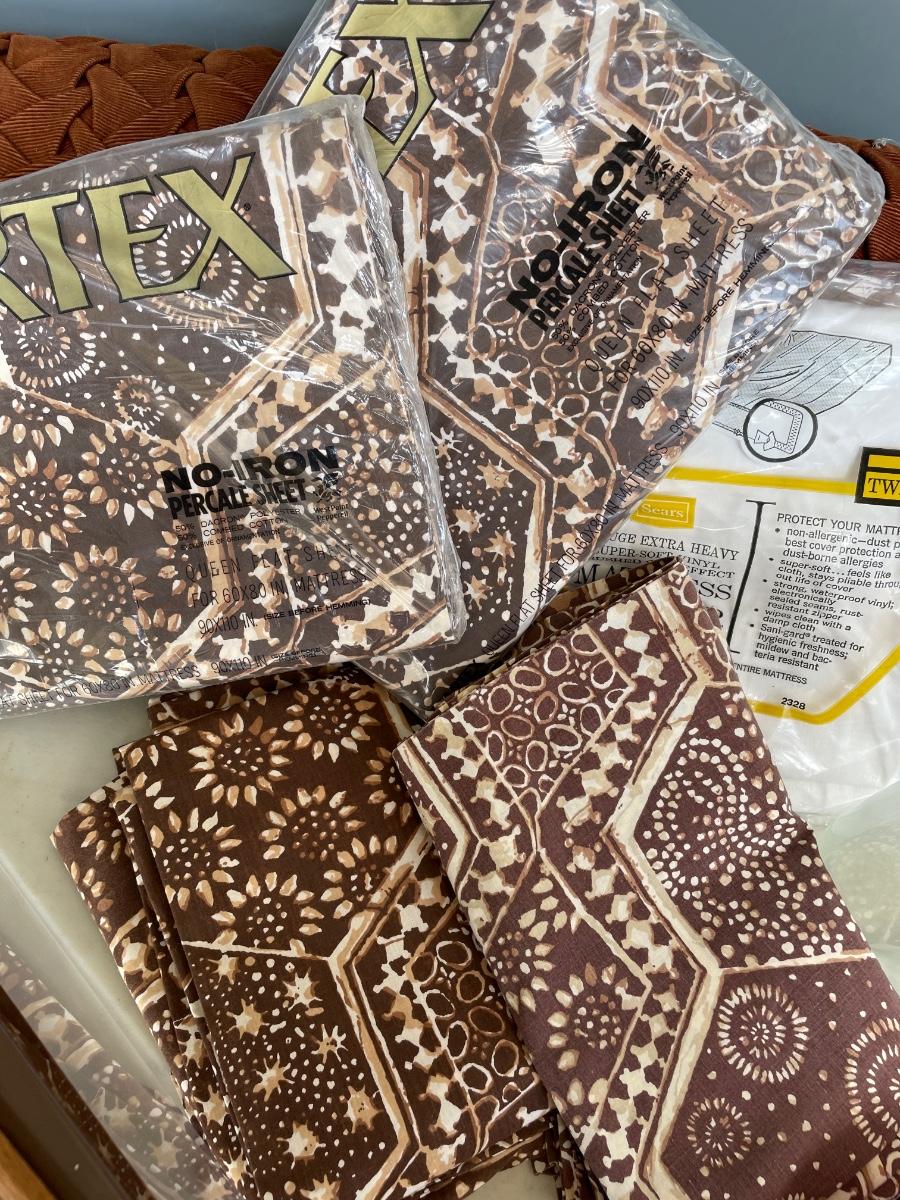 69- Queen flat sheets (2), pillowcases, mattress cover, pillow, more