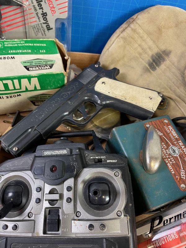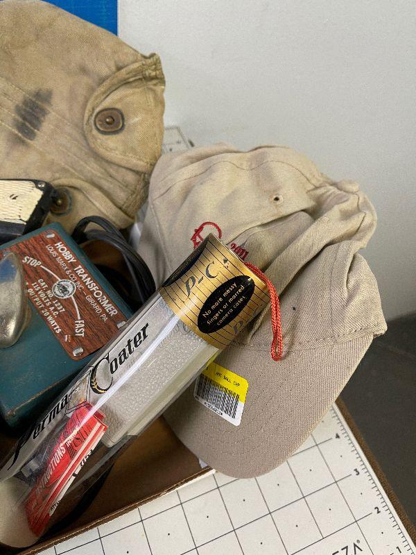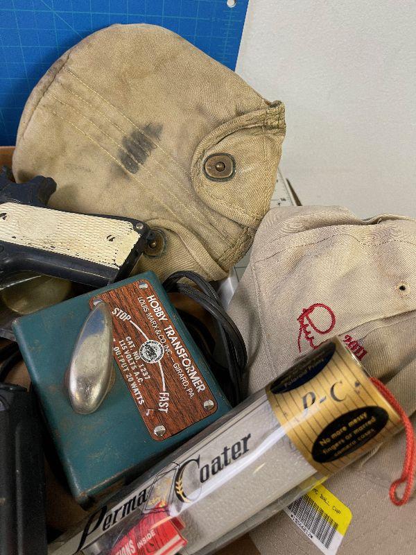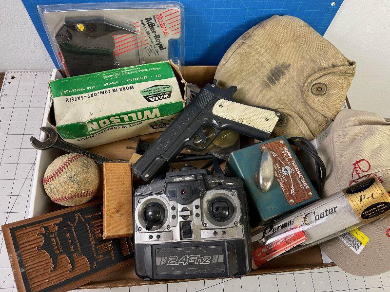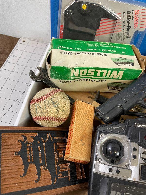 #69 Tray of Vintage Collectible Items: Toys, Hat, baseball.