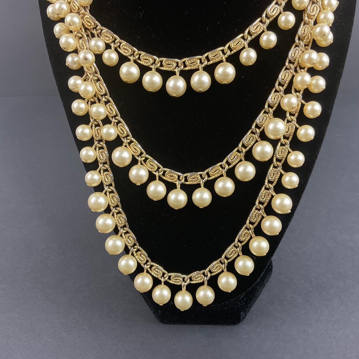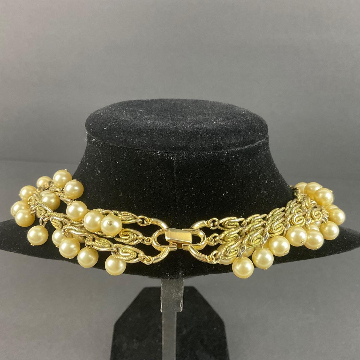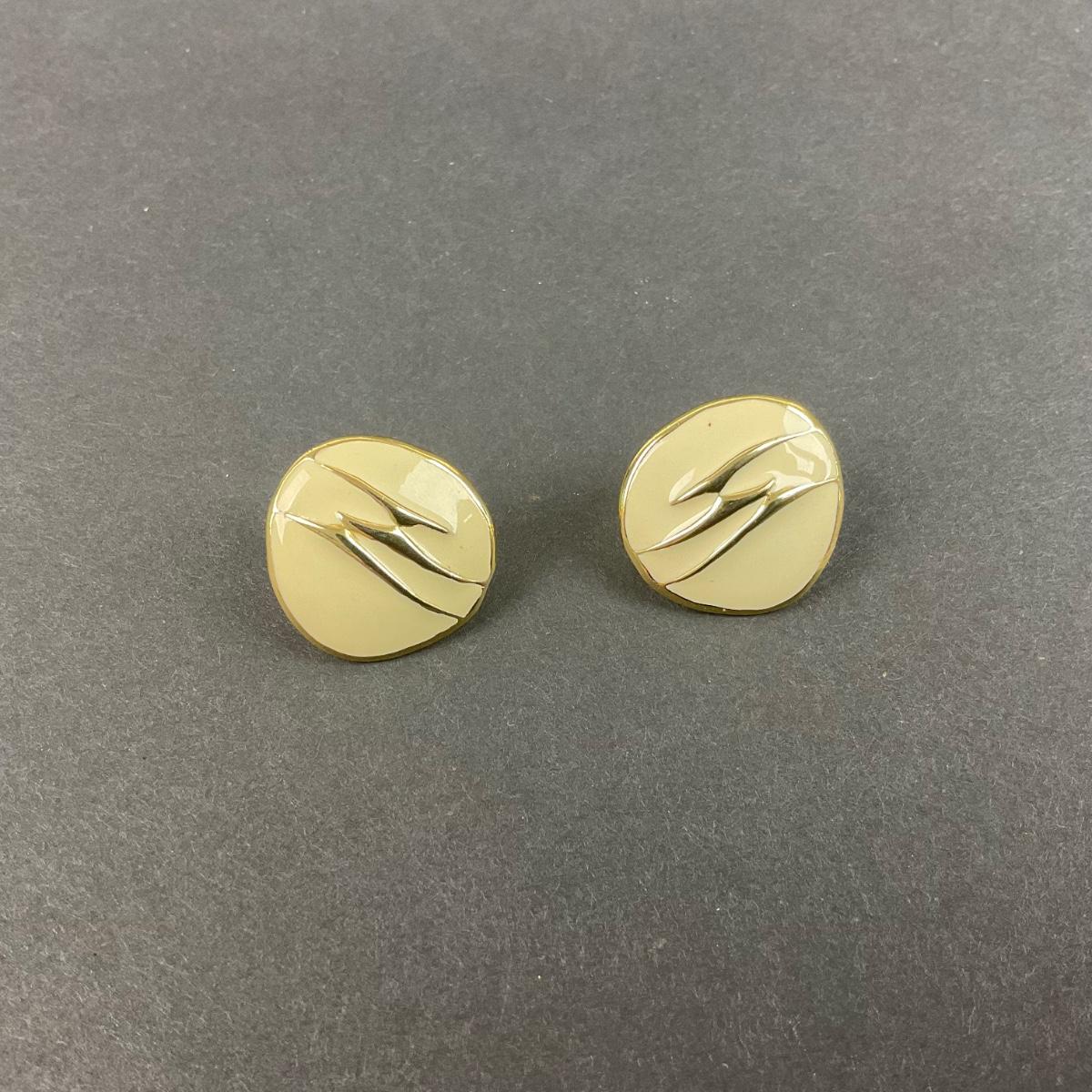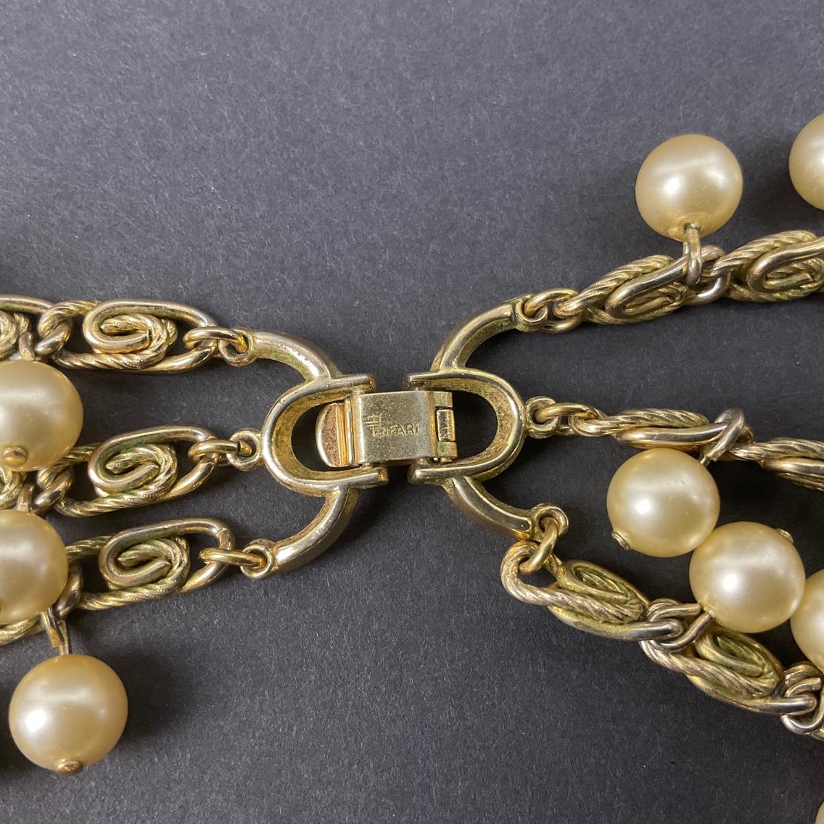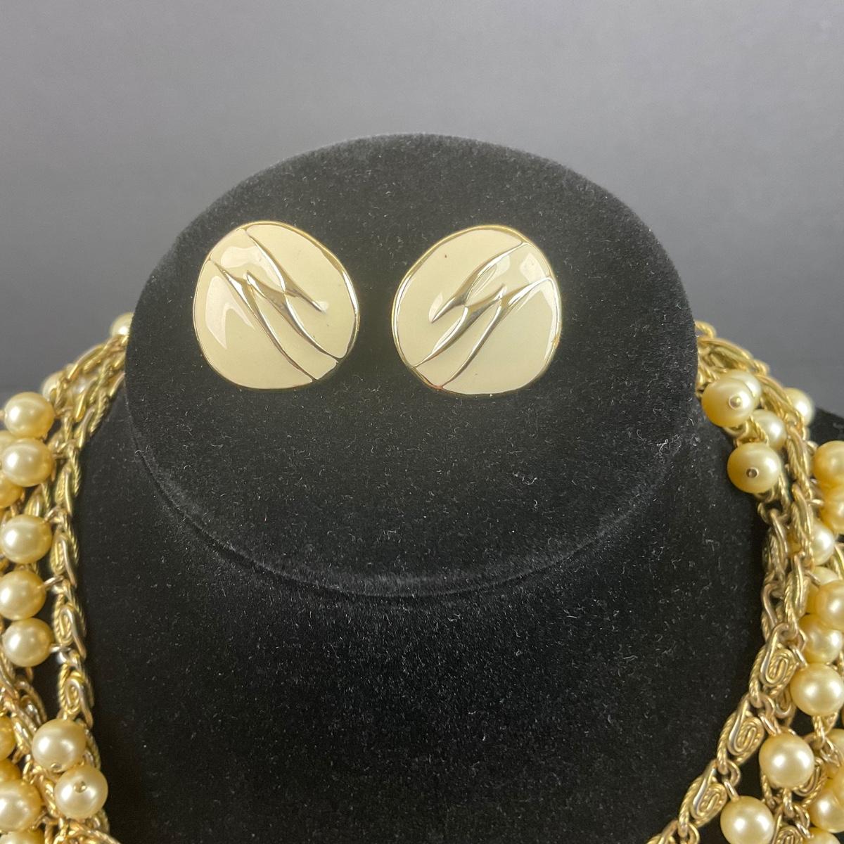 One vintage Trifari gold tone necklace and Trifari clip earrings. Both pieces are marked. Please see photos for details and condition. Any condition statement is given as a courtesy to a client, is an opinion, and should not be treated as a statement of fact. Reference to condition written, oral or within a condition report shall not be regarded as a full account of condition and may not include all defects, alterations, or restorations. Absence of a condition report does not imply a lot is flawless or lacking imperfections or damage. Katherine’s Auction & Appraisal Service shall have no responsibility for any error or omission. Returns shall not be accepted on the basis of condition. ::: Shipping is available on this lot. If you require shipping you must let us know at the close of the auction. We will coordinate with you after the item has been won. Shipping fees will include insurance up to or exceeding the value of all items being mailed. If you have any questions regarding this lot please contact the auctioneer either via this website, by direct email or by phone. PICK UP TIMES and other important information can be found in the TERMS and DESCRIPTION of the auction. Please take a look for pertinent information. Thanks!