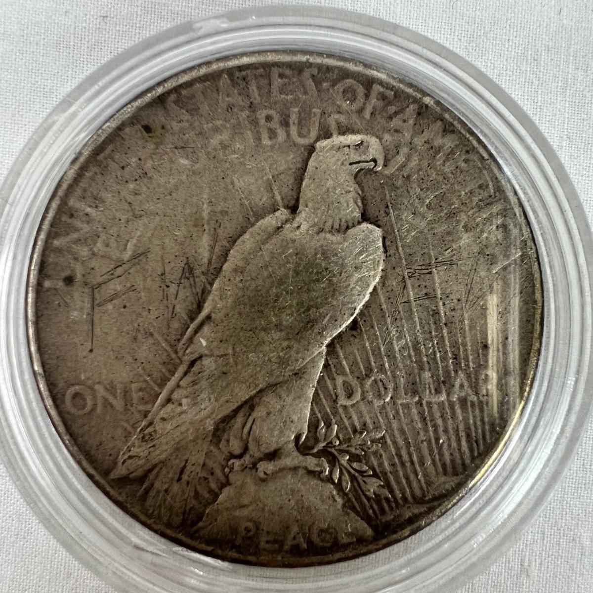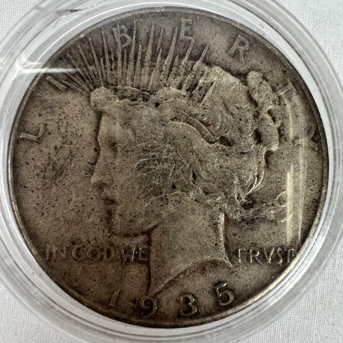 1935 Silver Peace Dollar reverse side scratched "FWFW"