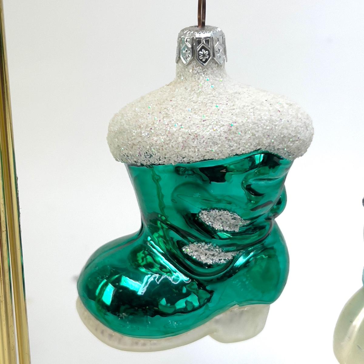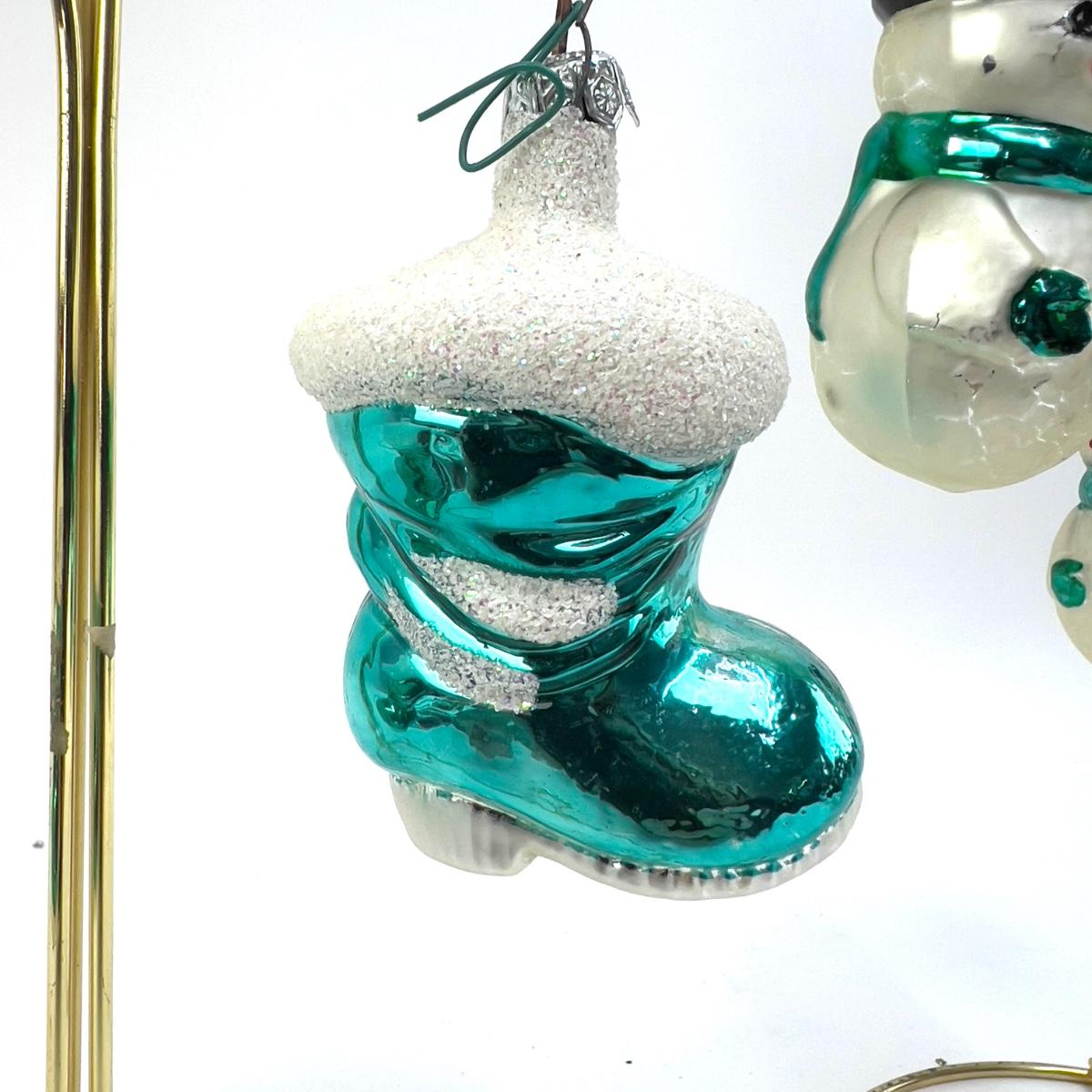 Lot of two turquoise santa boot ornaments with three black white turquoise snowmen ornaments