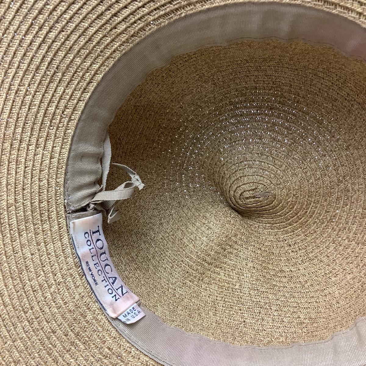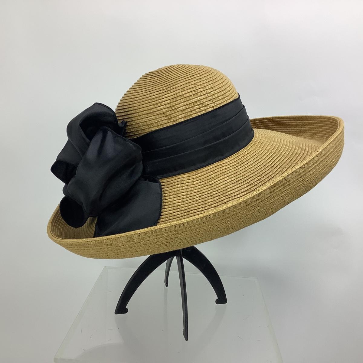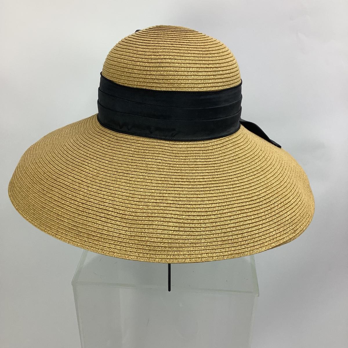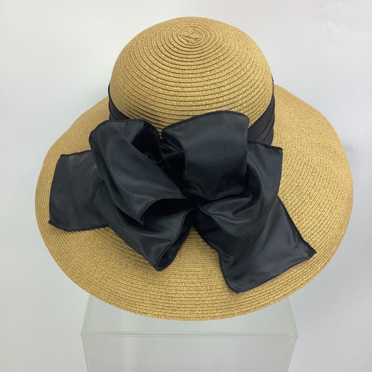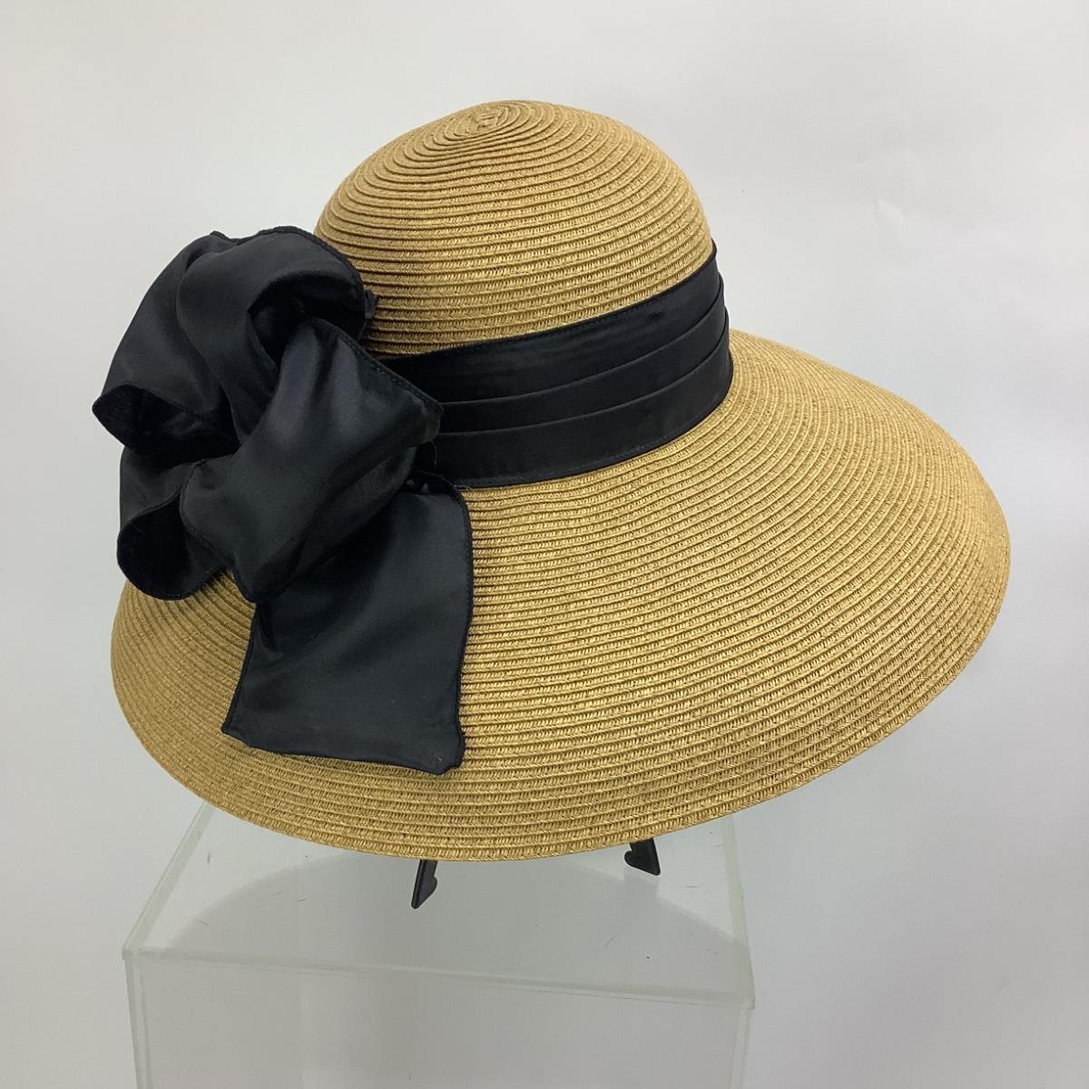 Hat is straw/raffia with black ribbon bow. The diameter of the hat is 7" and 16" diameter from brim to brim.
