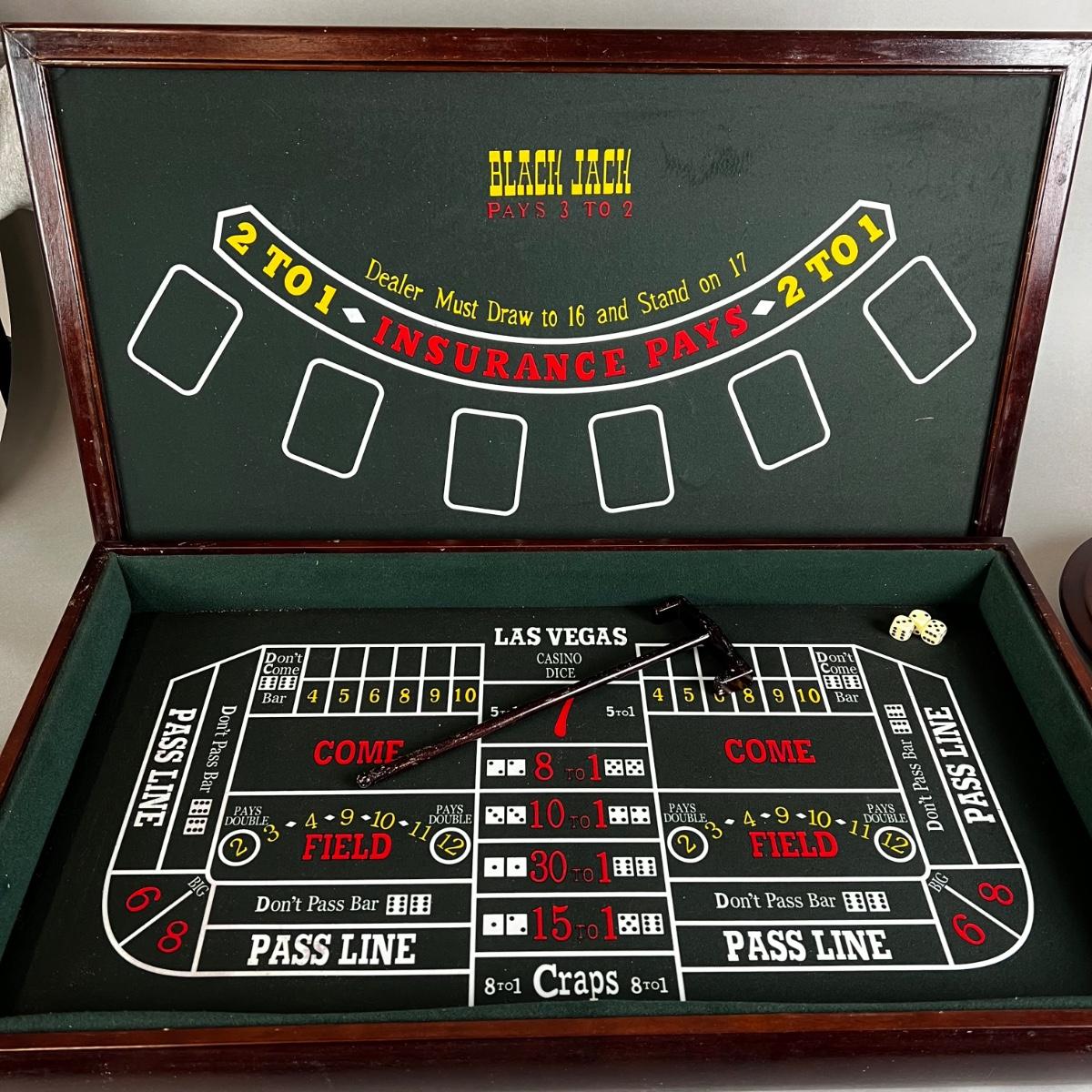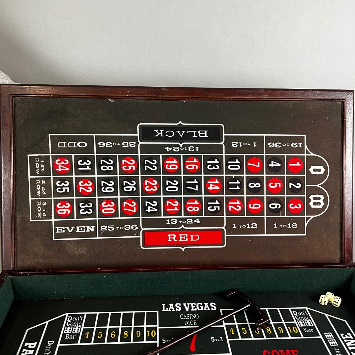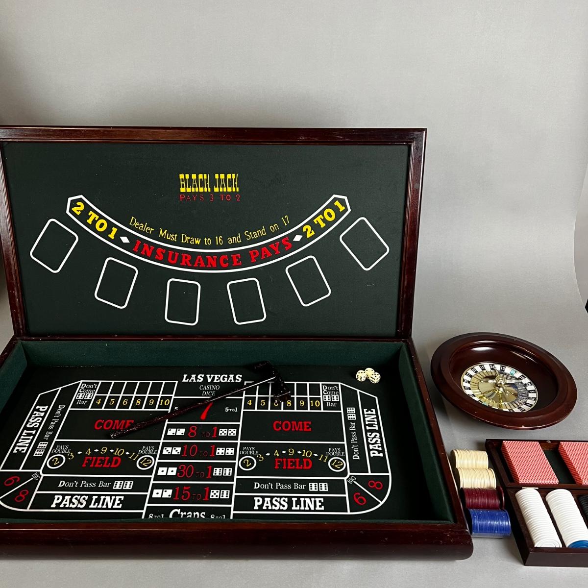 Comes with roulette, blackjack, casino dice, two decks of cards, 3 packs gambling chips.