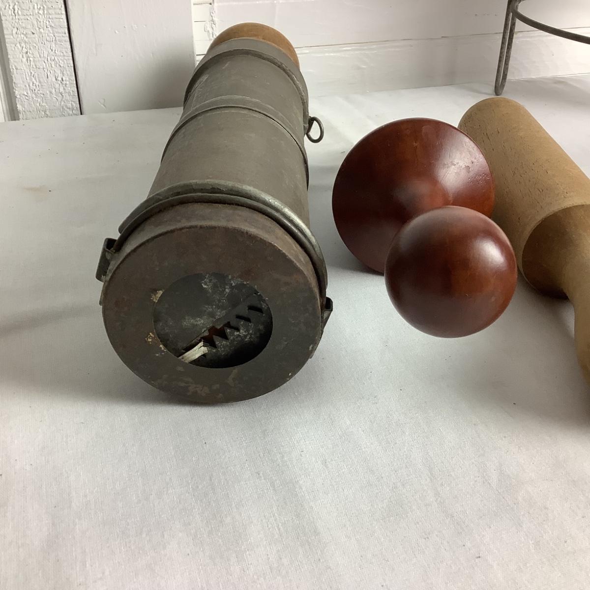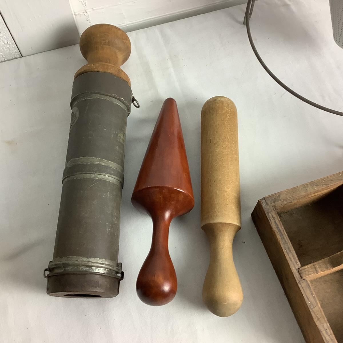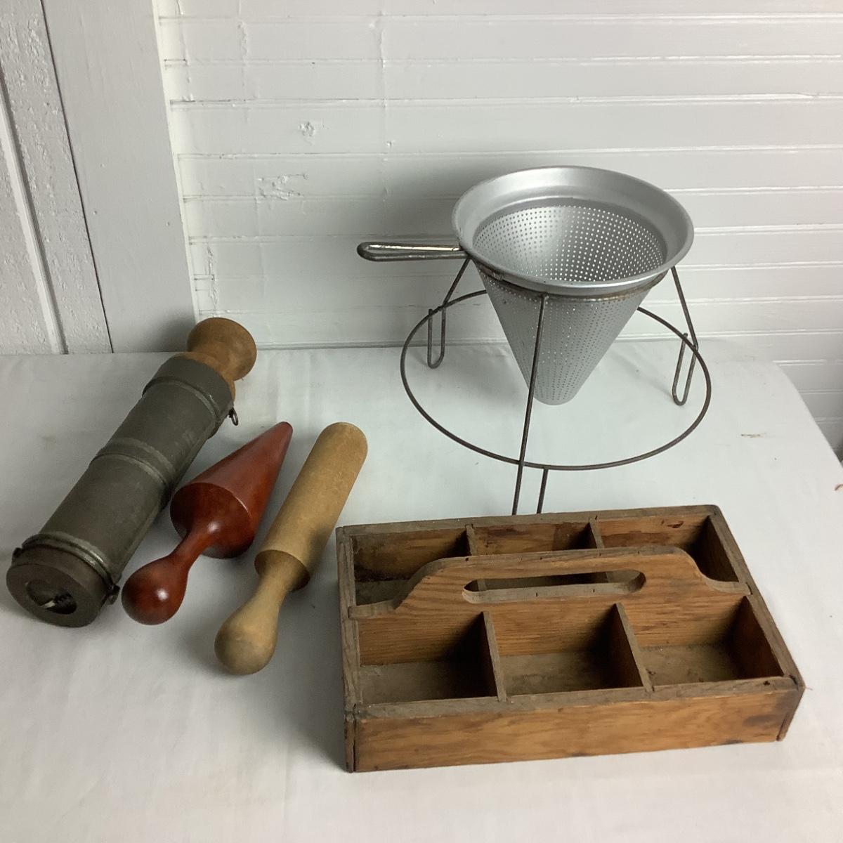 The lot contains strainer, tools, wood and metal cookie press and tray.