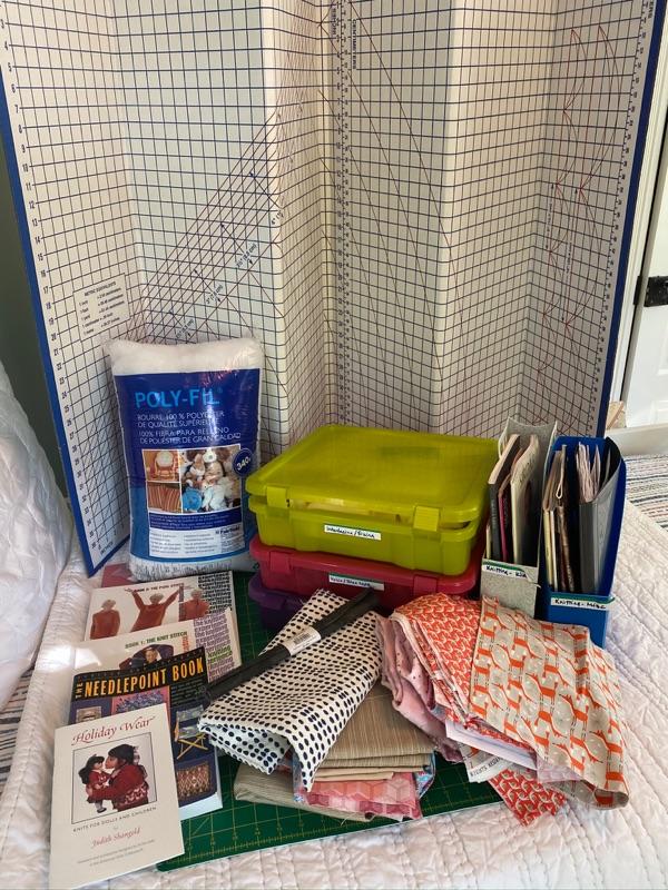 Miscellaneous sewing items, books, measuring board, material and more