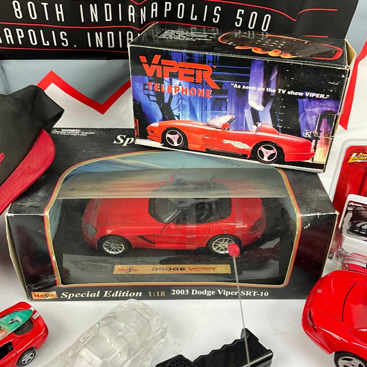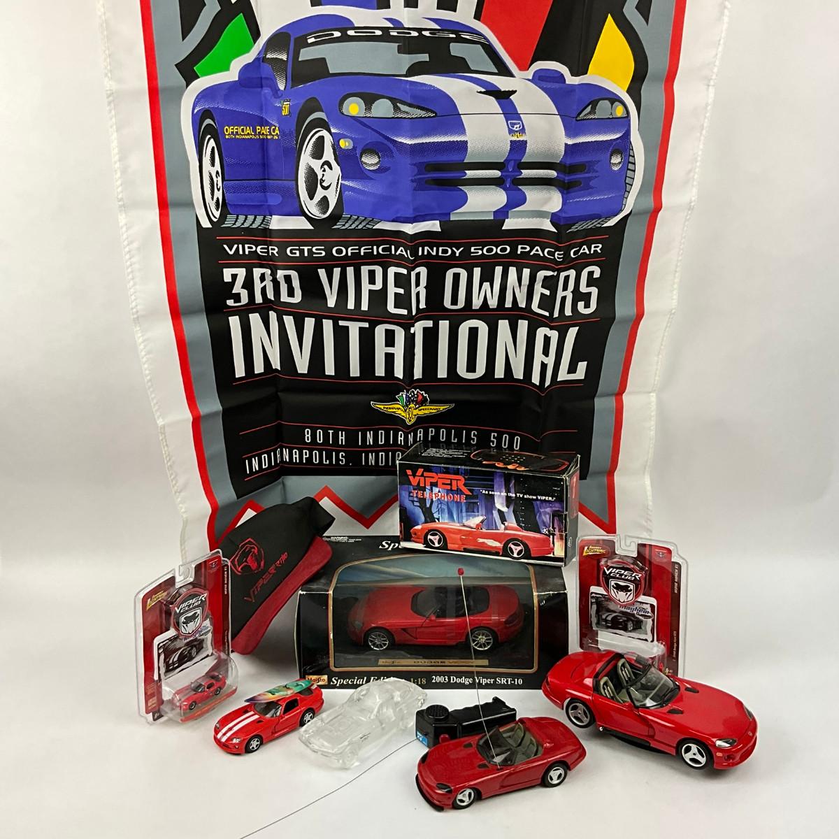 Comes with Indianapolis 500 Banner Of Blue Viper, R/C viper, two sealed matchbox vipers, 1:18 ratio 2003 dodge ciper, viper phone, glass viper