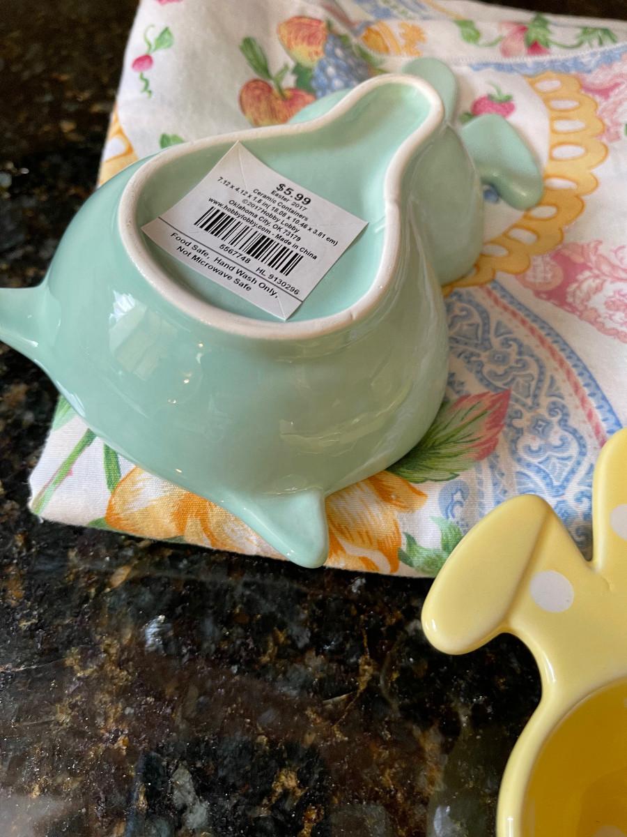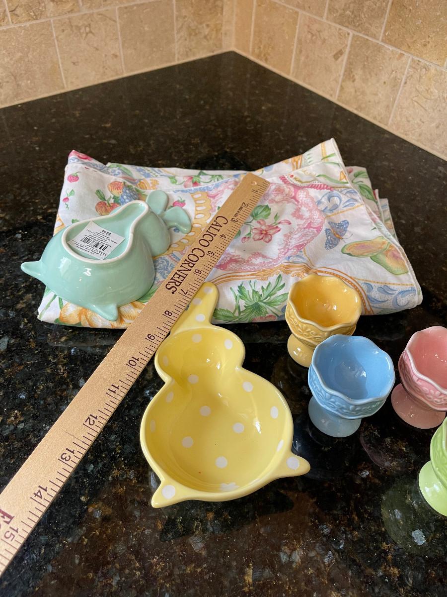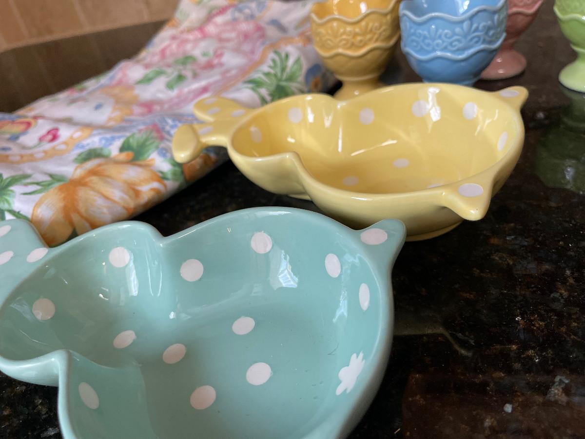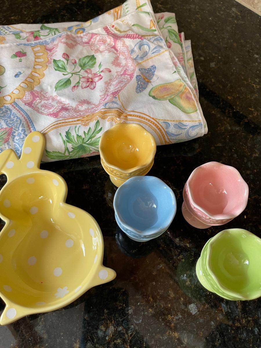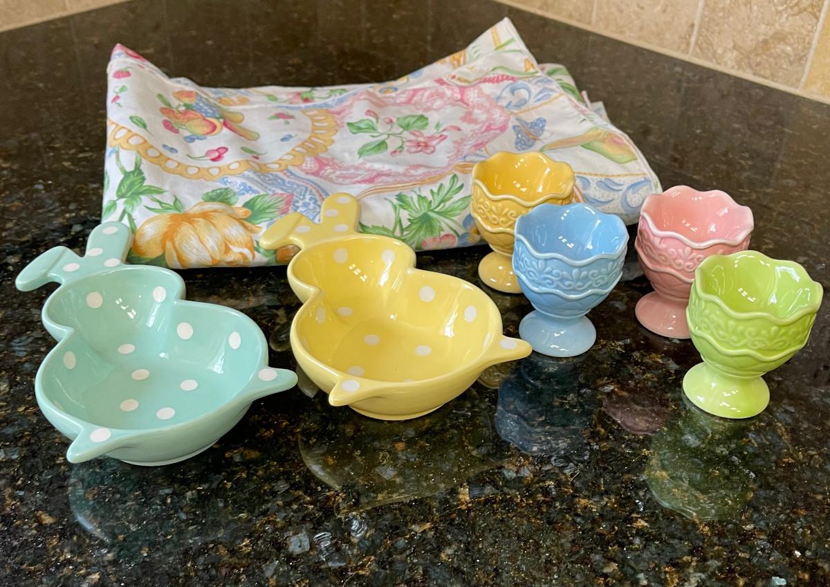 #696 Easter table Cloth, Egg holders and rabbit dishes.