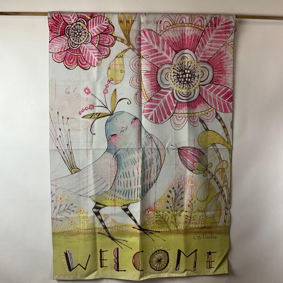 697 Welcome Floral Bird Silkscreen House Flag by Cori Cantini