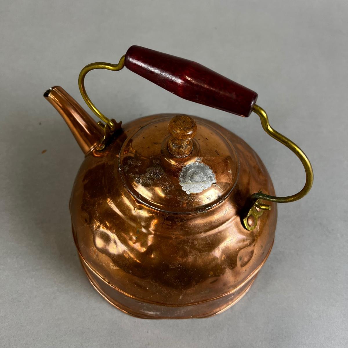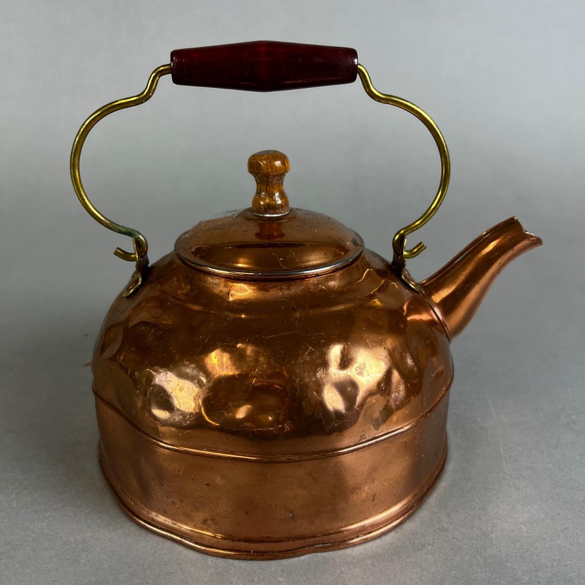 Revere copper tea pot has brass & wood handle. Measuring 8" H x 8.5" D