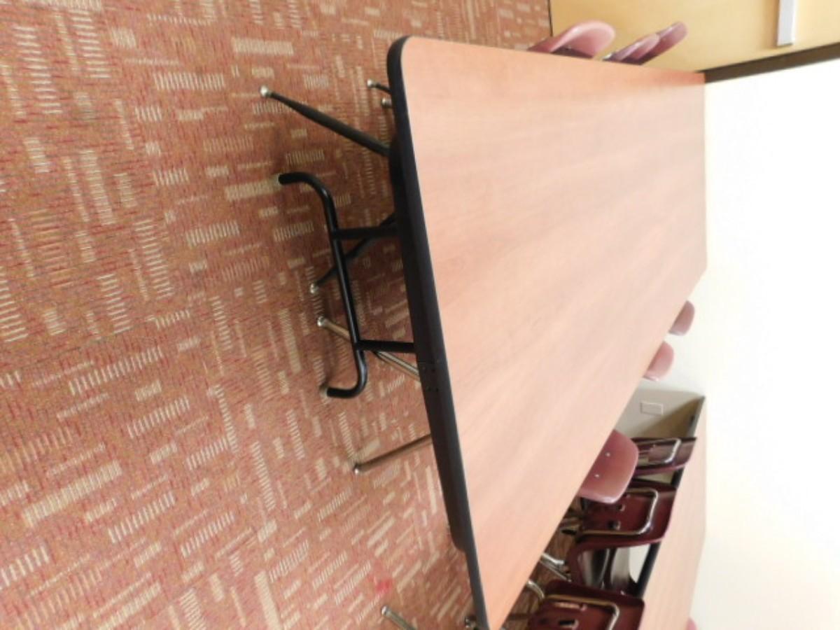 6ct Cherry Finish Folding Leg 8' Table Chairs not Included (NSB2) Expect some wear or scratches to finish. Shipping option available via freight or local mover at Buyer's expense. Buyer must have all shipping scheduled within the stated dates and times of pickup. Recommended local mover is Beaty Bros. Moving 828-201-2982