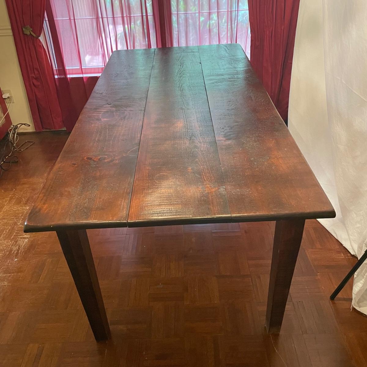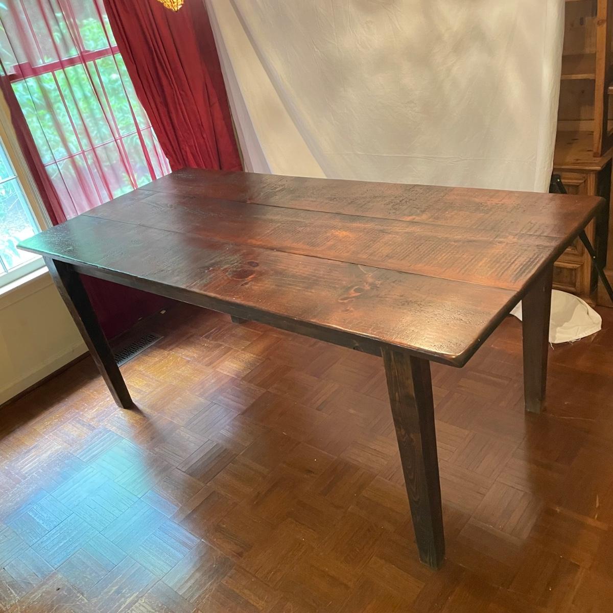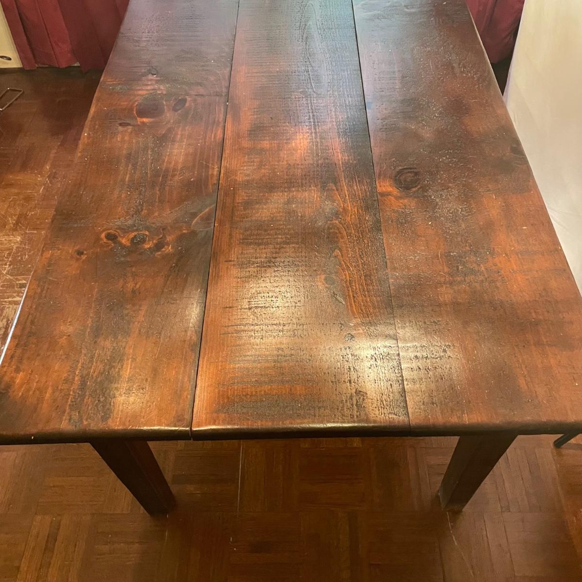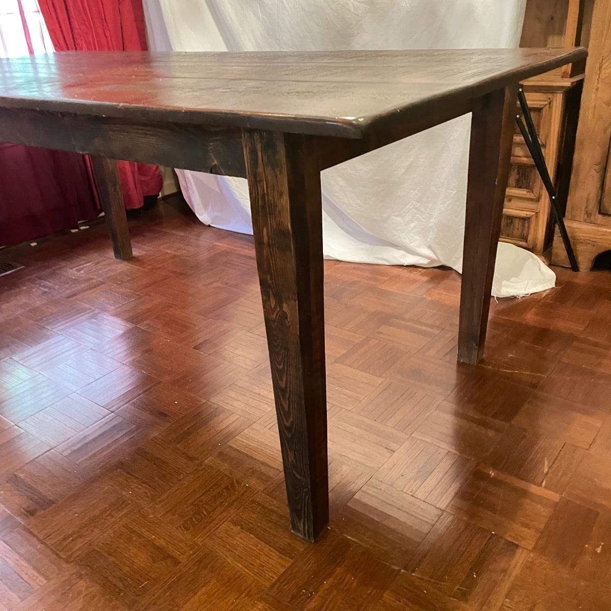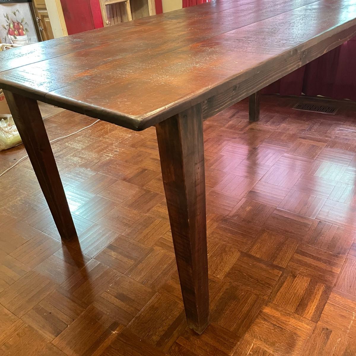 Stunning dark stained farm table. Table does not have extension abilities. Seller states table is Hickory wood. Piece measures 33.75” x 72” x 30”H. Local pick up only. Winning bidder must bring assistance to help move and load this item due to its weight and/or size.