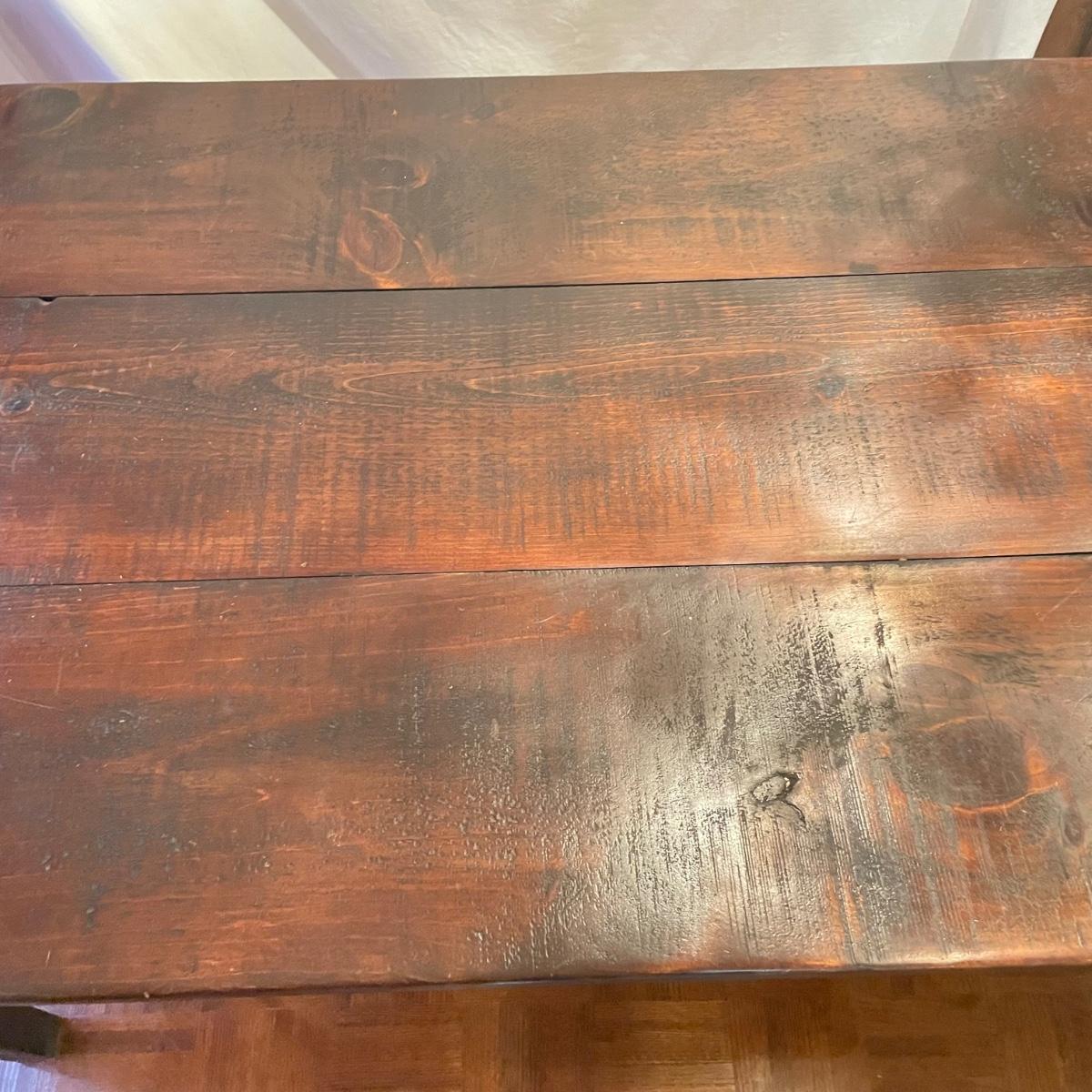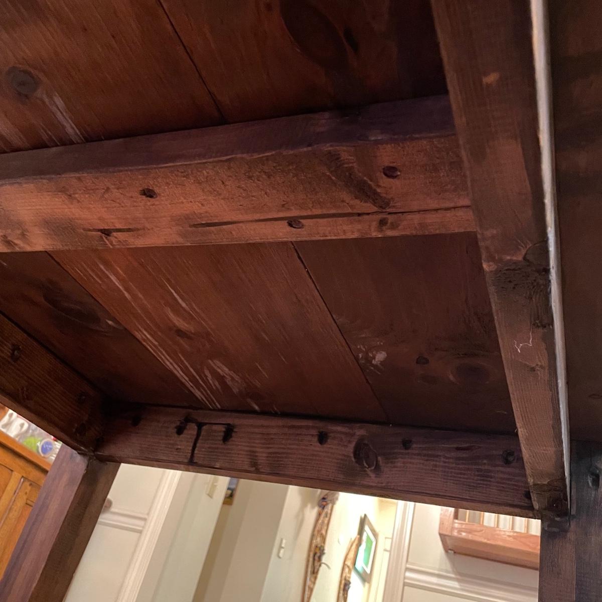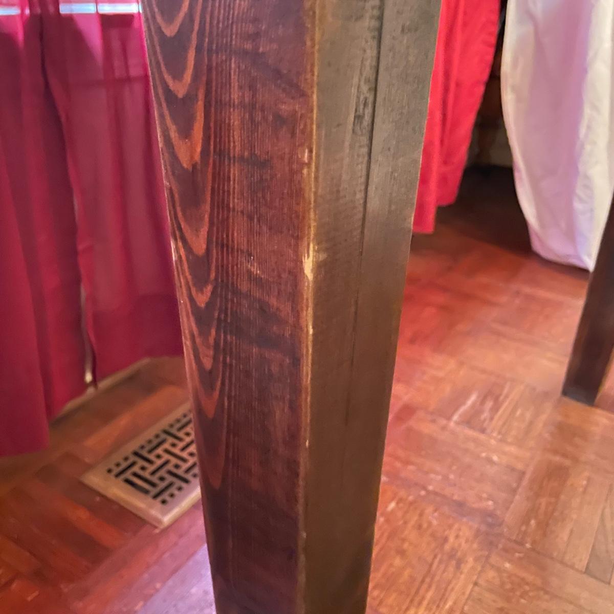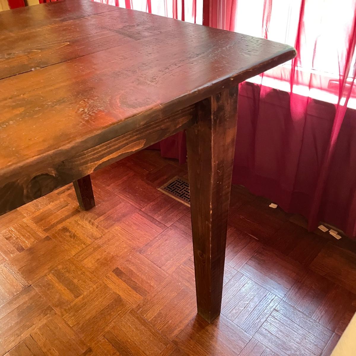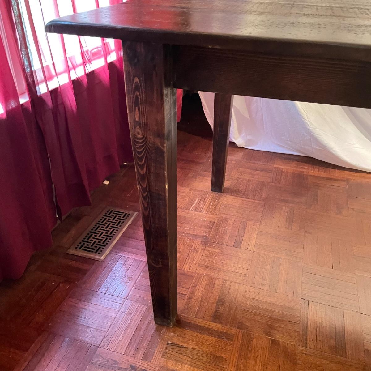 Stunning dark stained farm table. Table does not have extension abilities. Seller states table is Hickory wood. Piece measures 33.75” x 72” x 30”H. Local pick up only. Winning bidder must bring assistance to help move and load this item due to its weight and/or size.