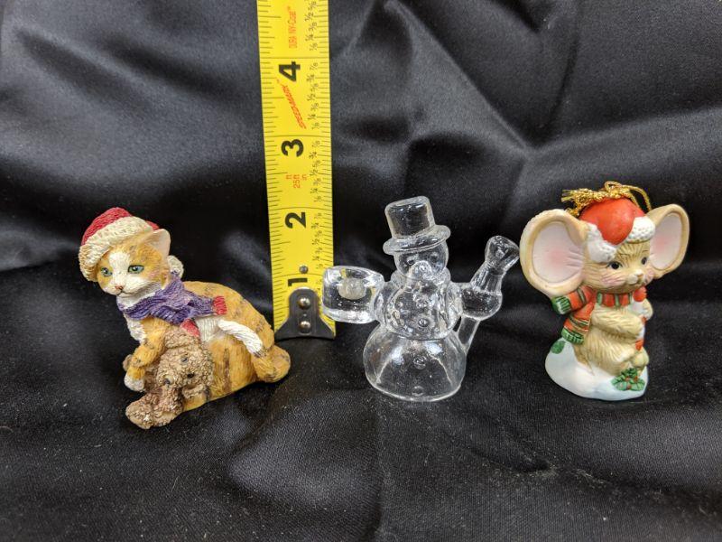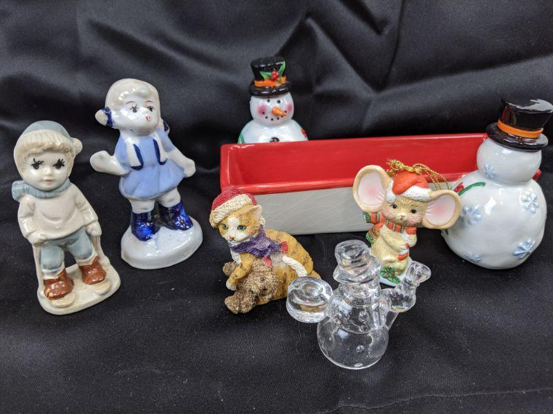 6 Piece Various Christmas Glass Decor - Snowman Tray, Mouse, Crystal Snowman, 2 Figurines, Cat