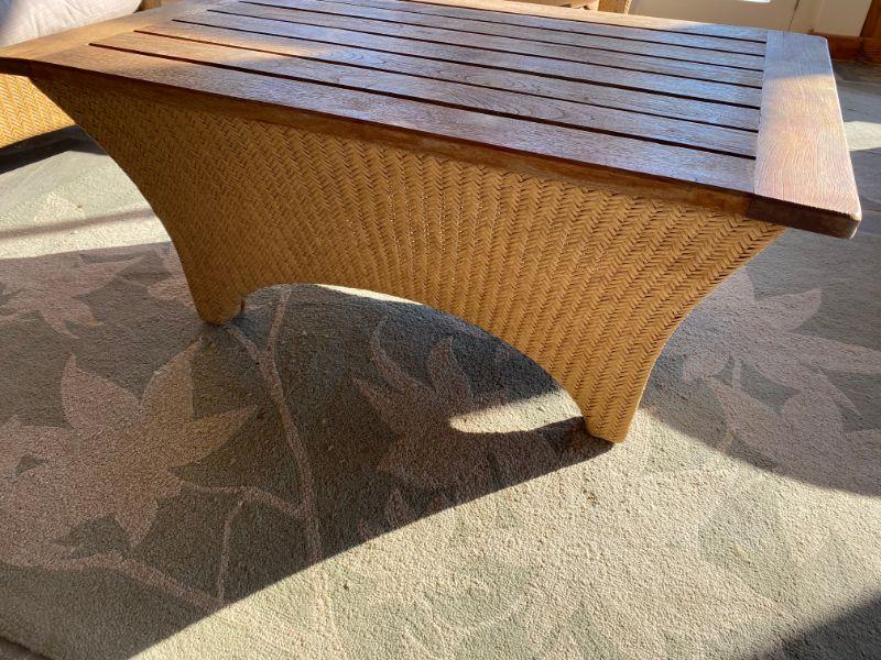 over all good condition may need touch up stain. coffee table measures 42" x 28" , triangular shaped tables measure 20"x 20"x 20"