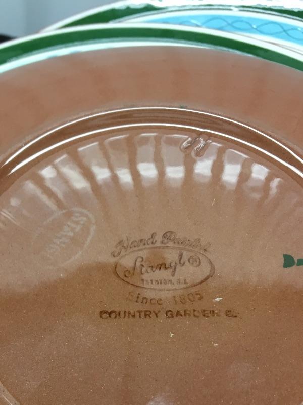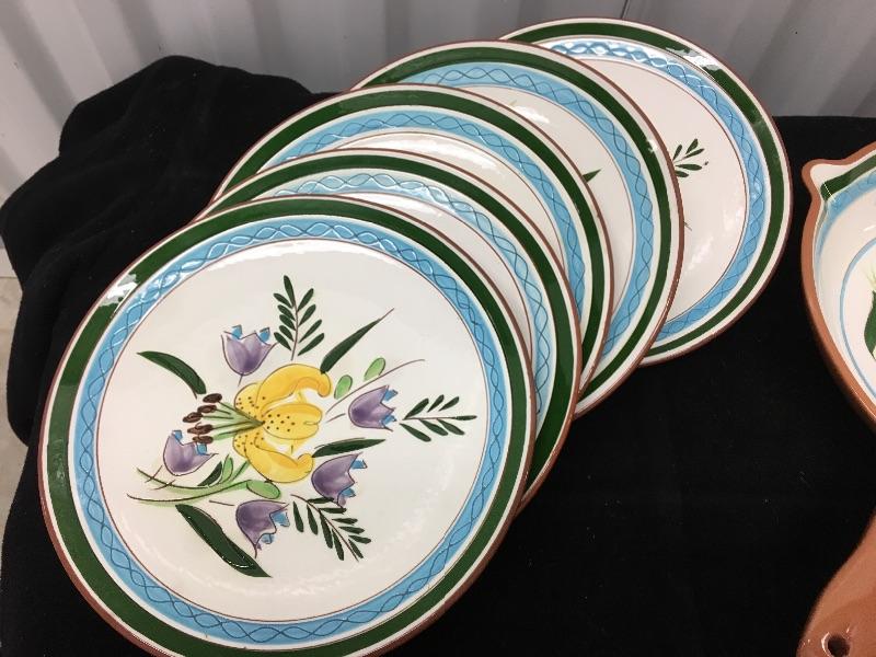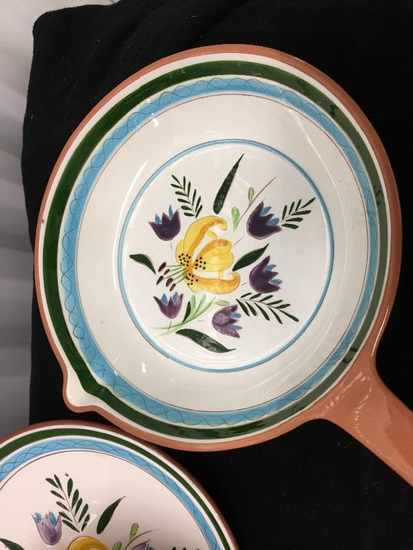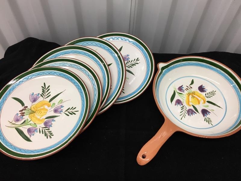 Includes five plates measuring 8” across and one skillet that measures 8.5” across.