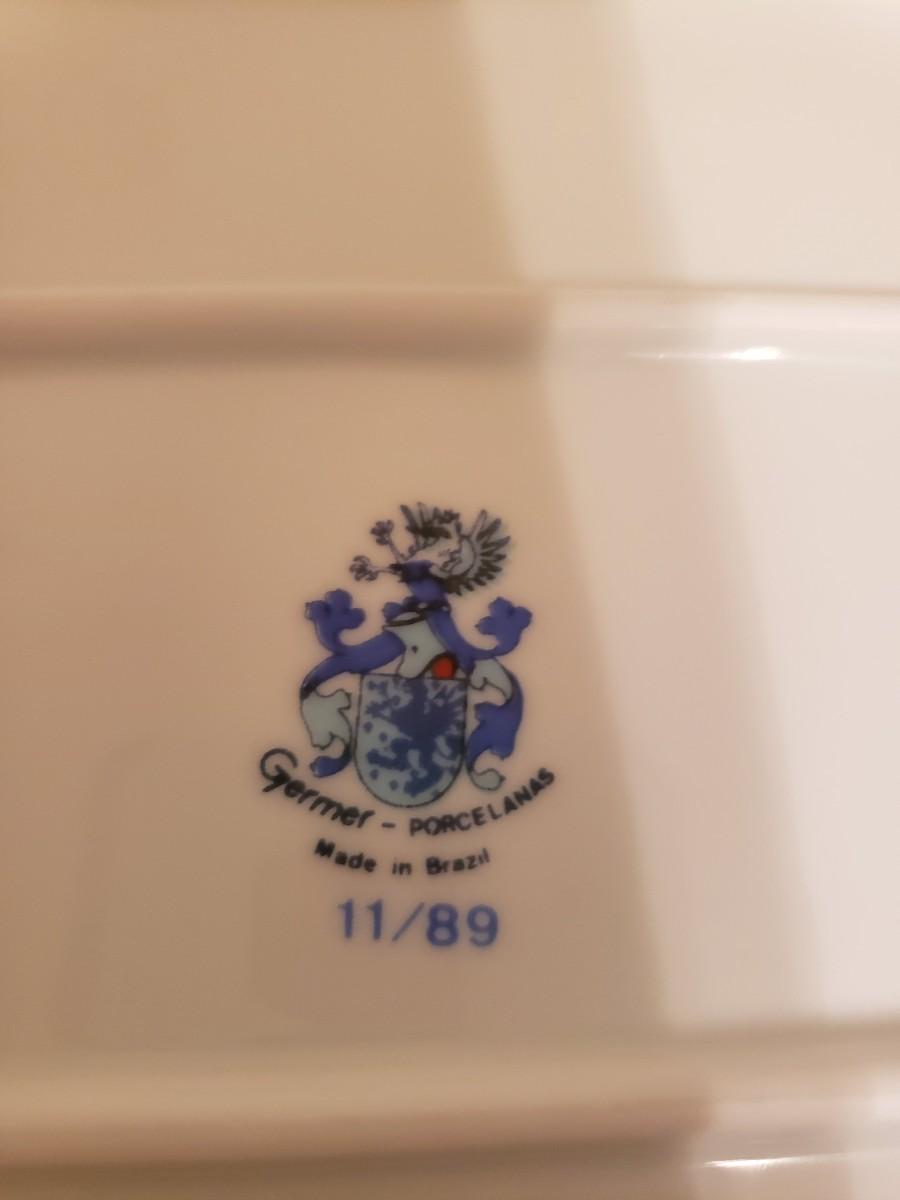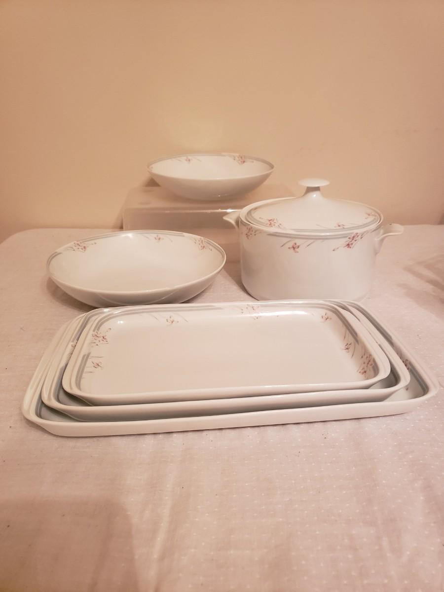 6-piece set of vintage porcelain dinnerware serving pieces made in Brazil. 3 rectangular platters, 1 covered casserole and 2 serving bowls. The large bowl has a small chip and there is slight pattern fading on some.