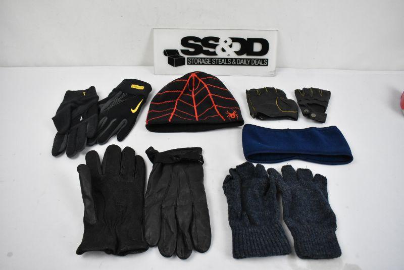 6x Cold Weather Wear: Nike Gloves, Spider Hat, Leather Gloves, Fingerless Gloves, Ear Warmer, Motorcycle Gloves