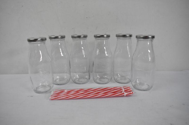6x Estilo Dairy Reusable Glass Milk Bottles w/ Straws & Lids, 10.5 oz - New