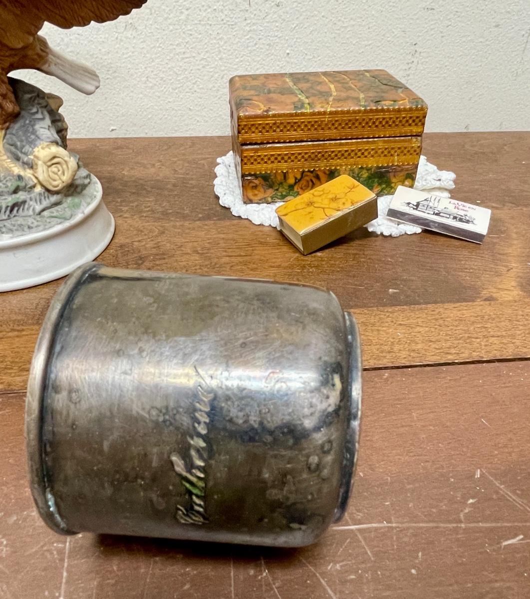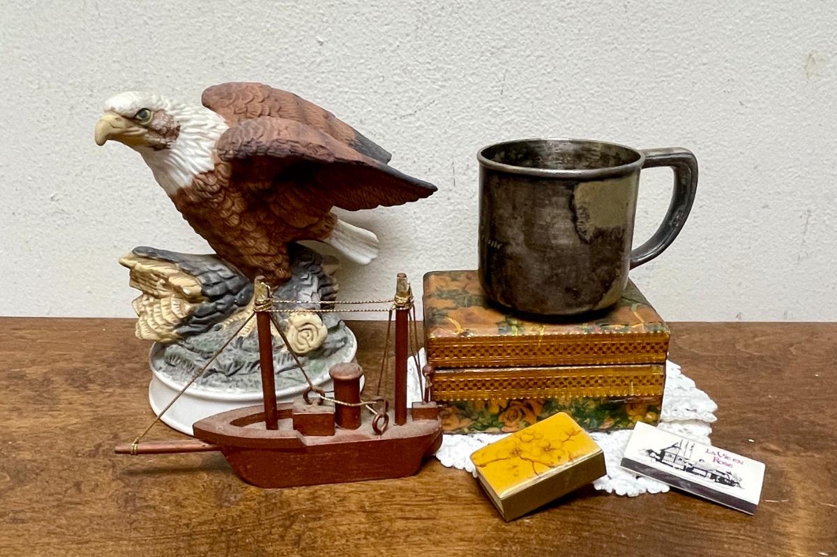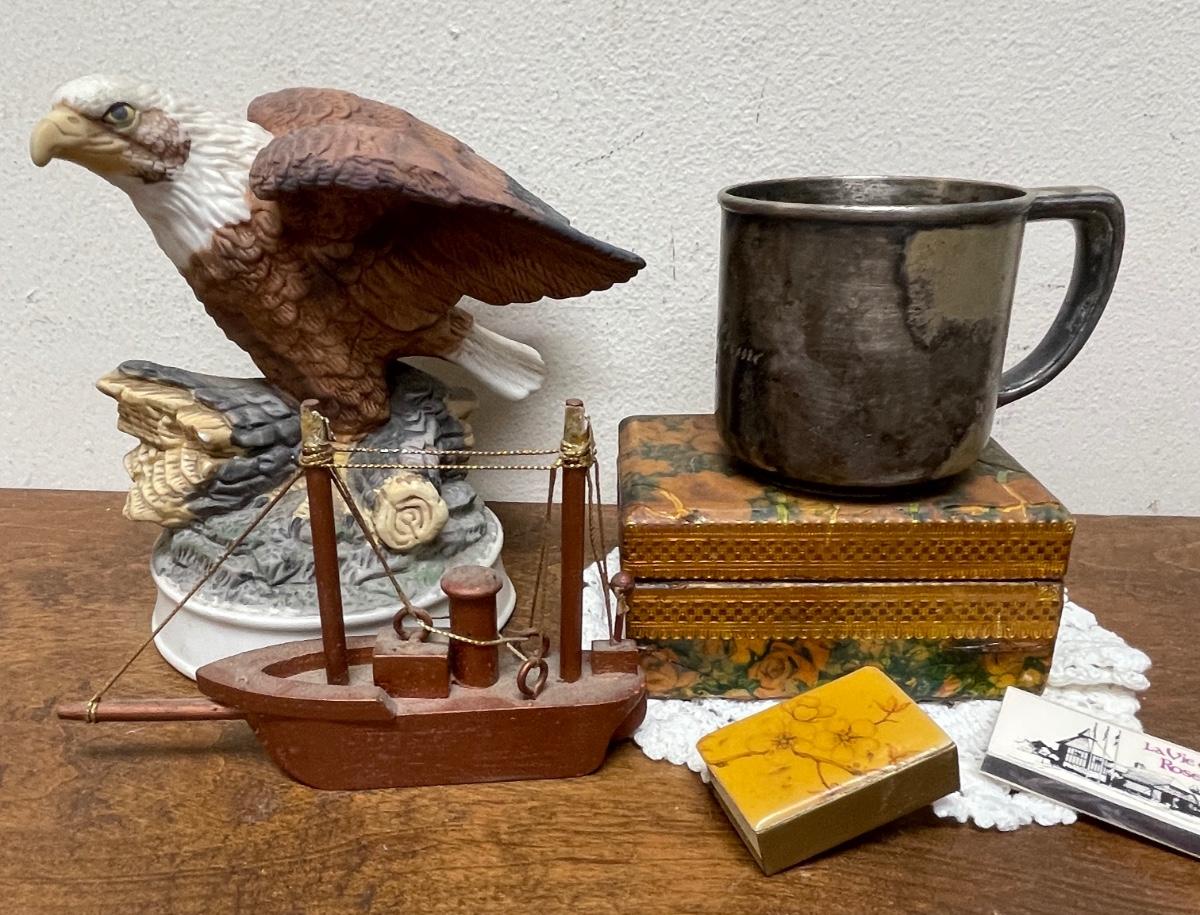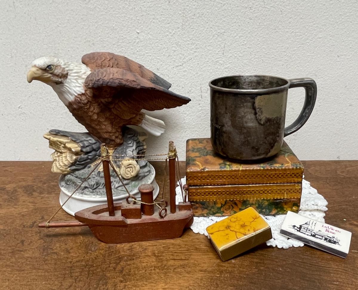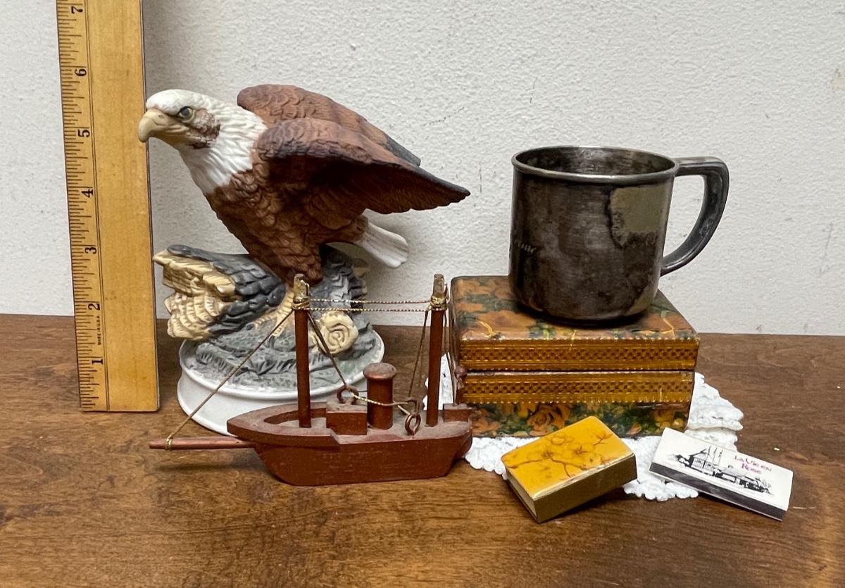 Random Misc Collector's Lot - Eagle Figurine, Silver-Plate Christening Cup, Wood Boat, Wood Trinket box, matches, etc