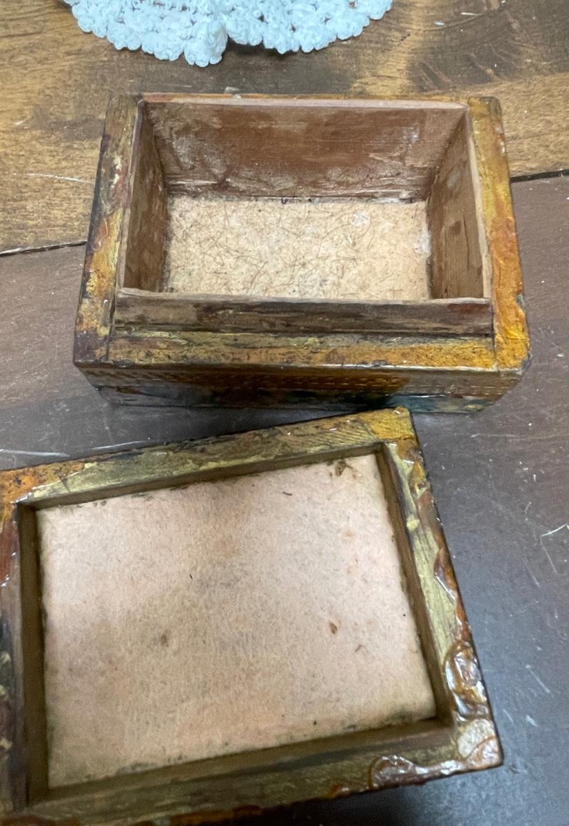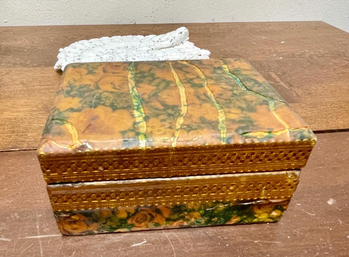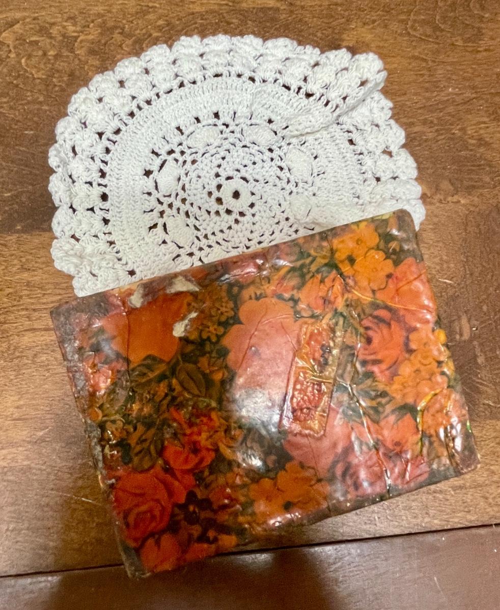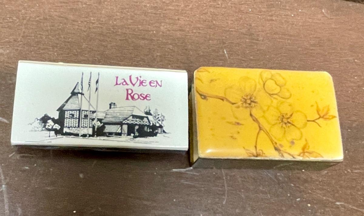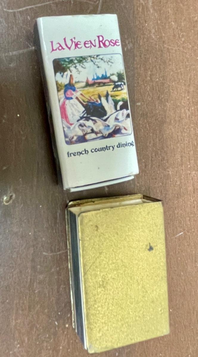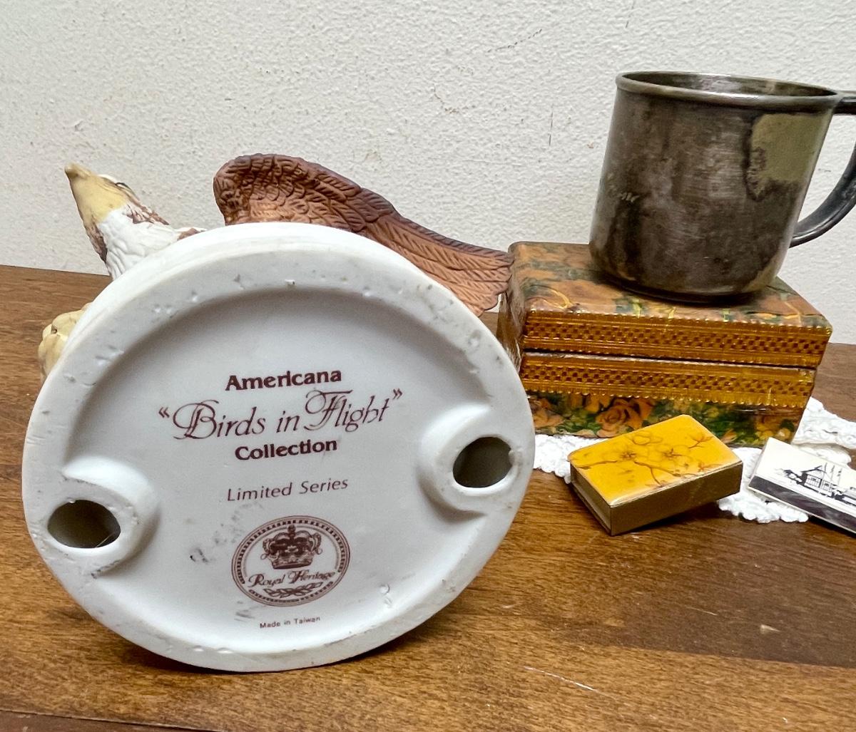 Royal Heritage Ceramic Eagle figurine approx. 5.5" tall, boat is approx. 5" long, cup is 2.5" tall, round cotton 6" doilie, wood trinket box is approx. 4" x 3" x 2" with matching box of matches, matchbox from LaVie en Rose restaurant. In good vintage condition.