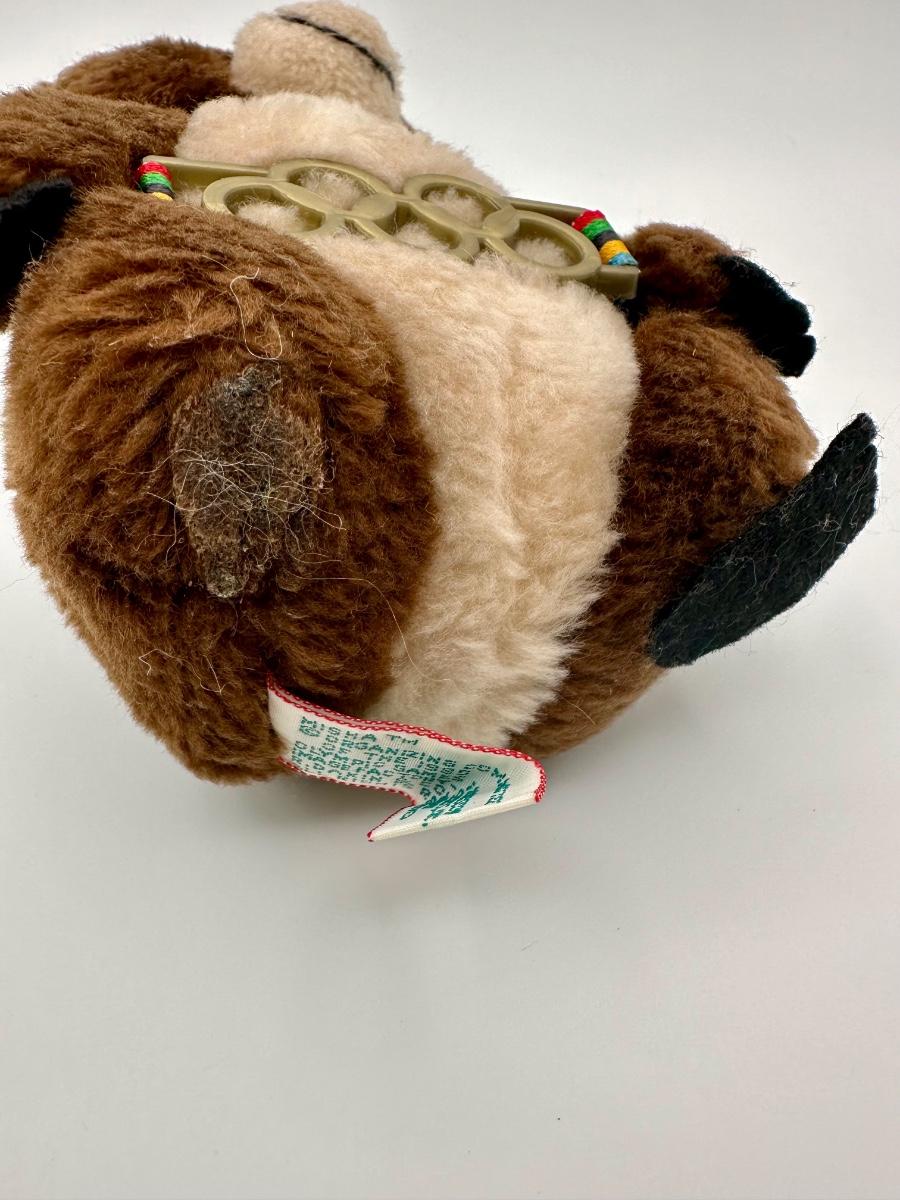 Original tags in place. Belt with Olympic rings and colors. Sadly he is missing his right felt foot (see pictures) shows normal signs of age. See larger sister versions (2) also in auction.