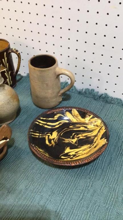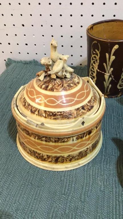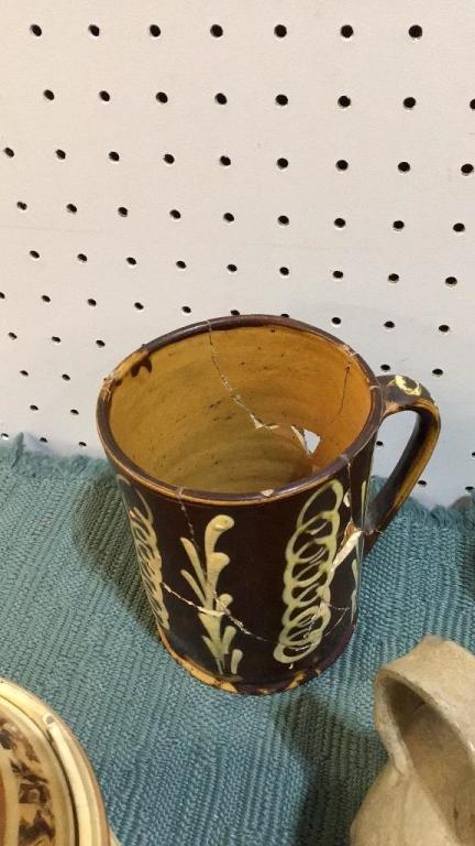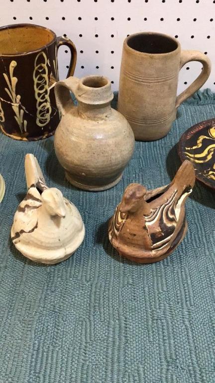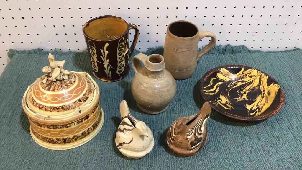 2 mugs (1 has been broken/reassembled), bowl, 2 chickens, small handled jug, lidded bowl (loss to edge and birds on lid)