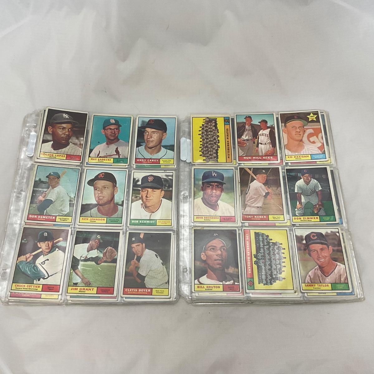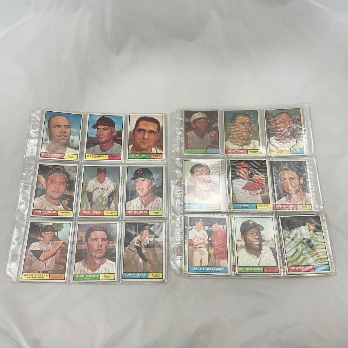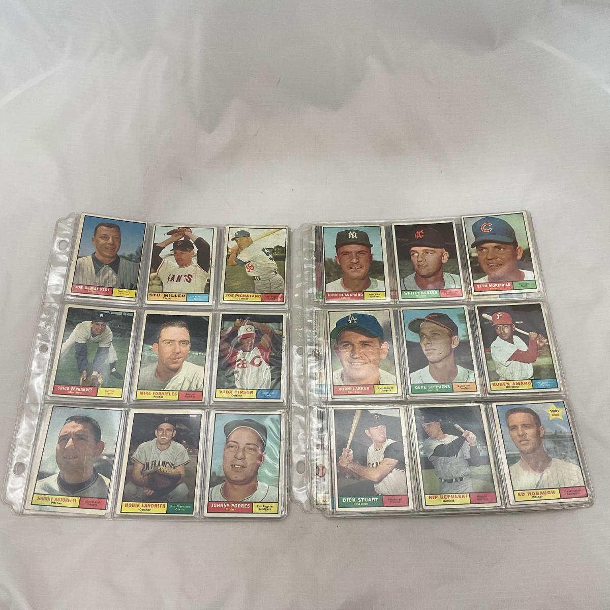 Collection of 1961 TOPPS vintage baseball cards. Nine pages of cards. There does seem to be some imperfections on some of the cards, as pictured. The nine pages of cards will come with a binder to transport. Please see photos for details and condition. ::: Shipping is available on this lot. If you require shipping you must let us know at the close of the auction. We will coordinate with you after the item has been won. Shipping fees will include insurance up to or exceeding the value of all items being mailed. If you have any questions regarding this lot please contact the auctioneer either via this website, by direct email or by phone. PICK UP TIMES and other important information can be found in the TERMS and DESCRIPTION of the auction. Please take a look for pertinent information. Thanks!