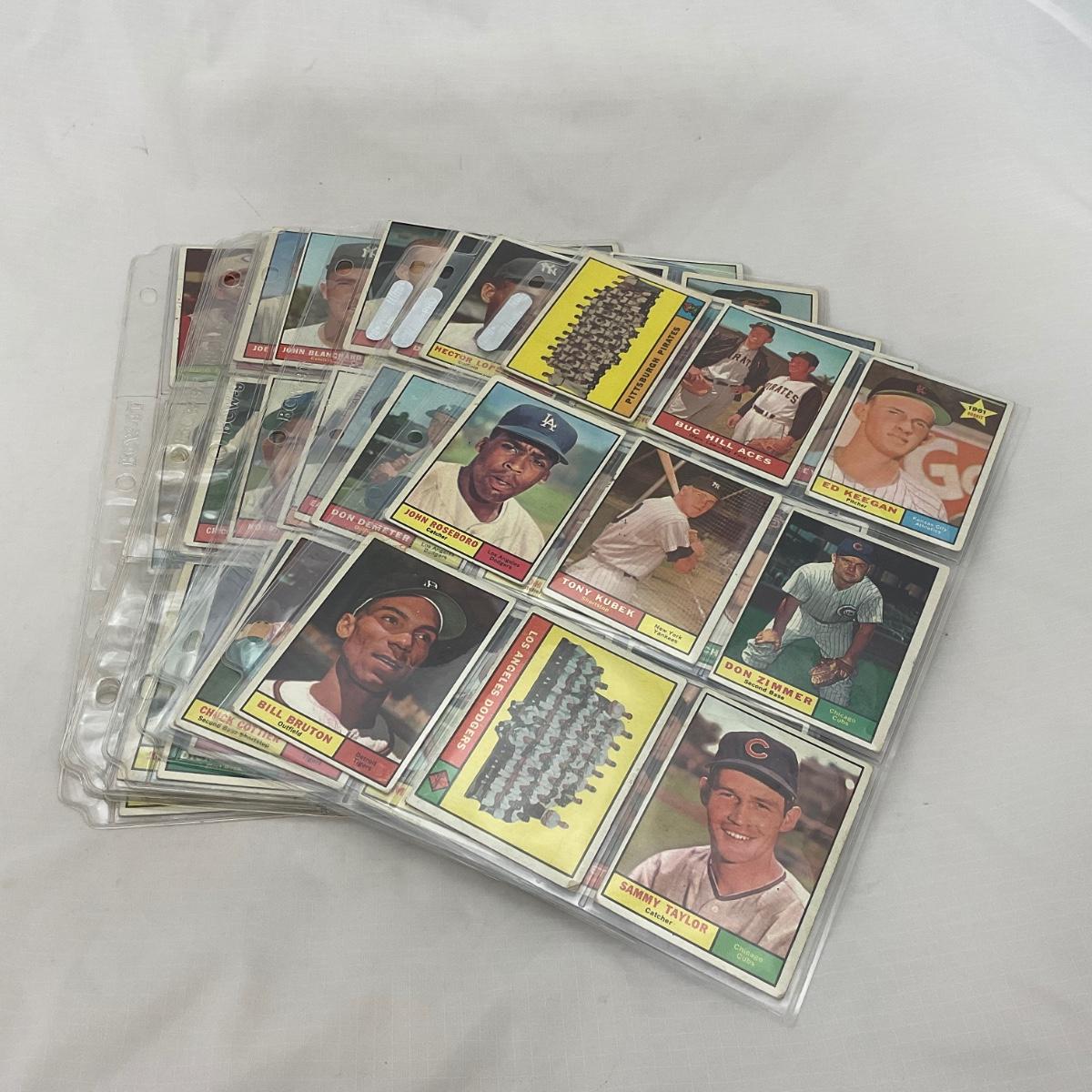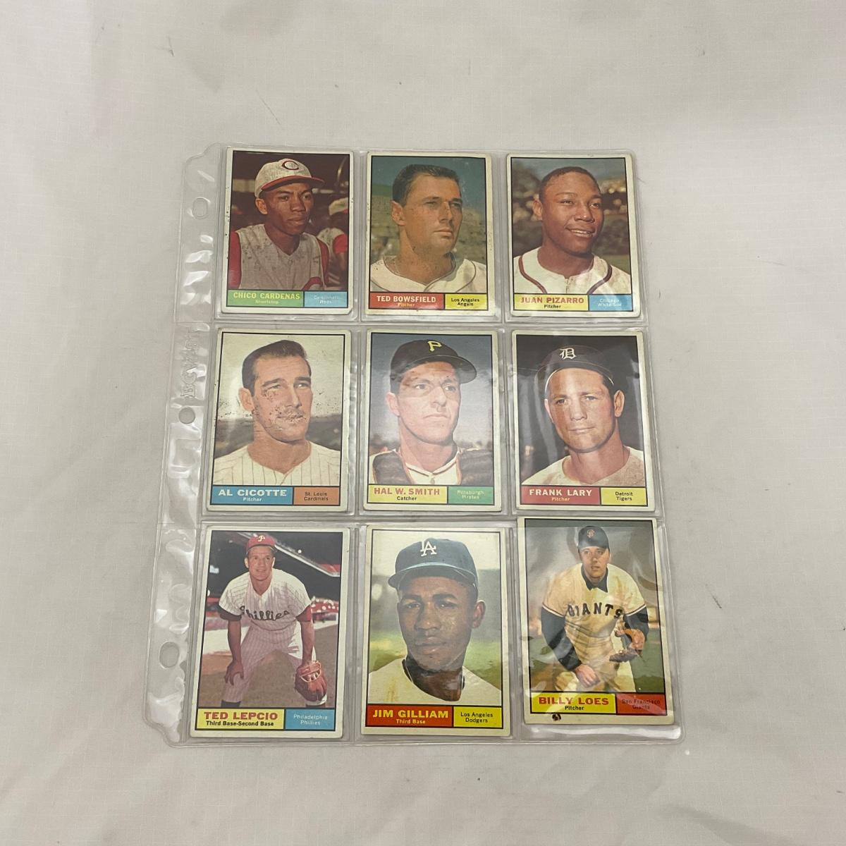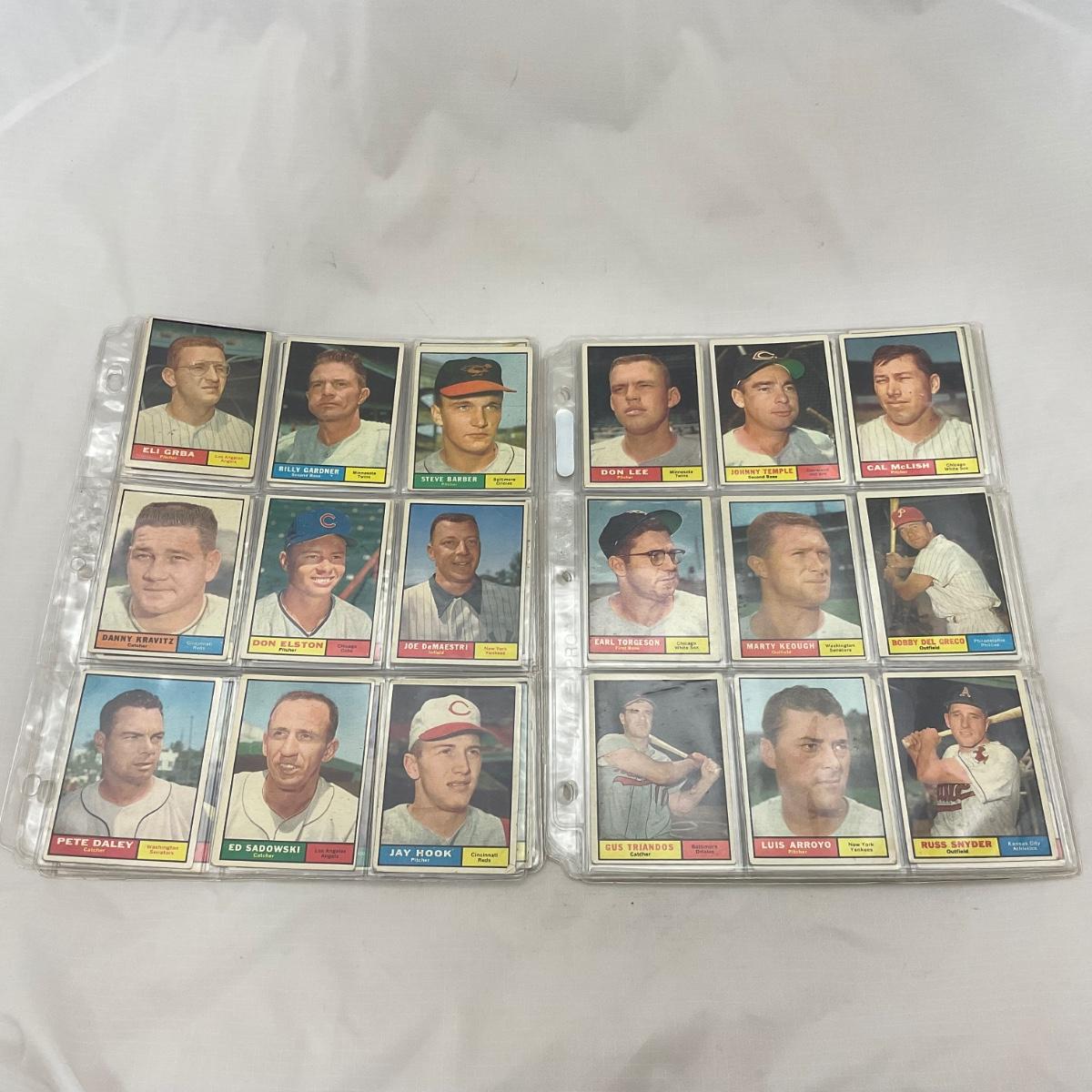 Collection of 1961 TOPPS vintage baseball cards. Nine pages of cards. There does seem to be some imperfections on some of the cards, as pictured. The nine pages of cards will come with a binder to transport. Please see photos for details and condition. ::: Shipping is available on this lot. If you require shipping you must let us know at the close of the auction. We will coordinate with you after the item has been won. Shipping fees will include insurance up to or exceeding the value of all items being mailed. If you have any questions regarding this lot please contact the auctioneer either via this website, by direct email or by phone. PICK UP TIMES and other important information can be found in the TERMS and DESCRIPTION of the auction. Please take a look for pertinent information. Thanks!