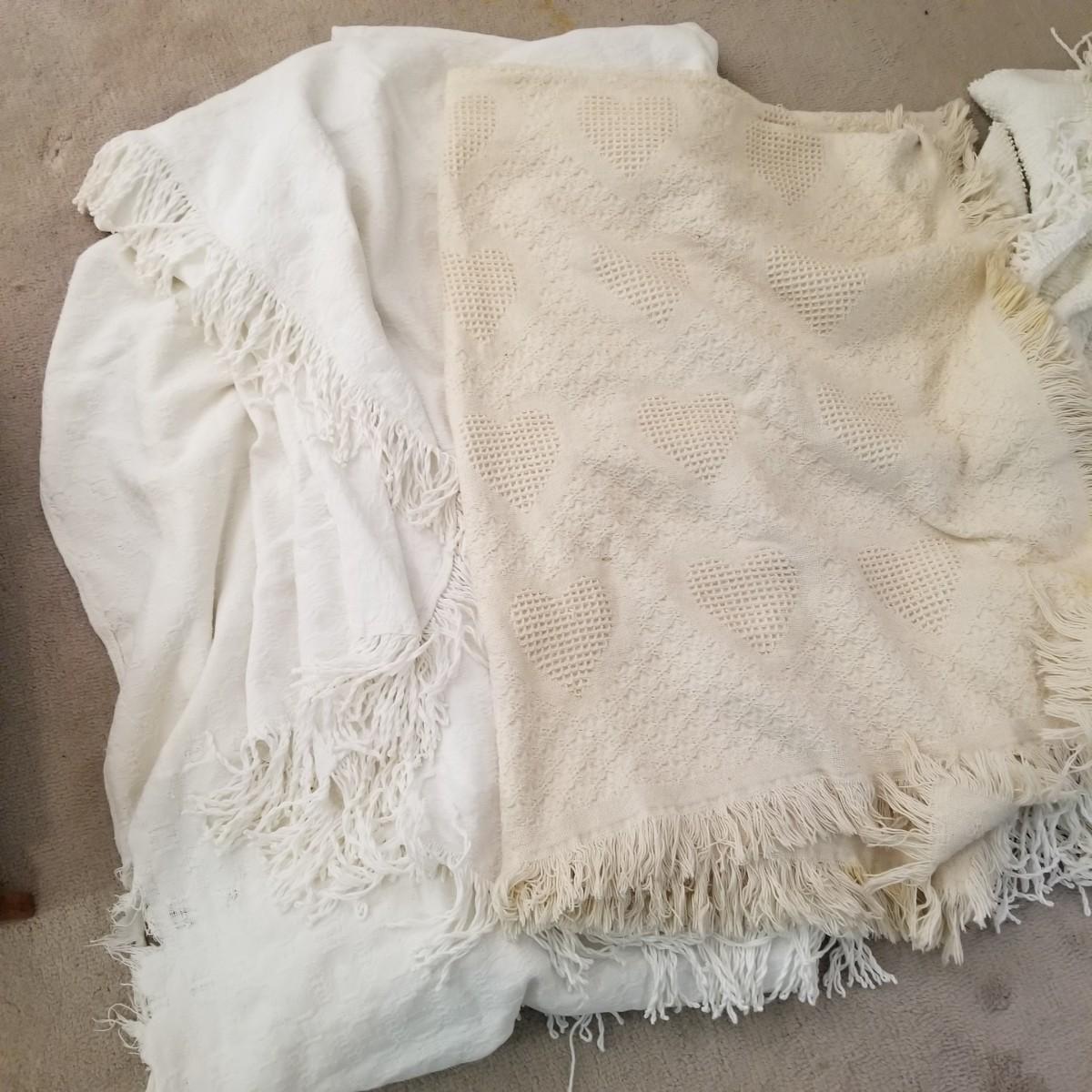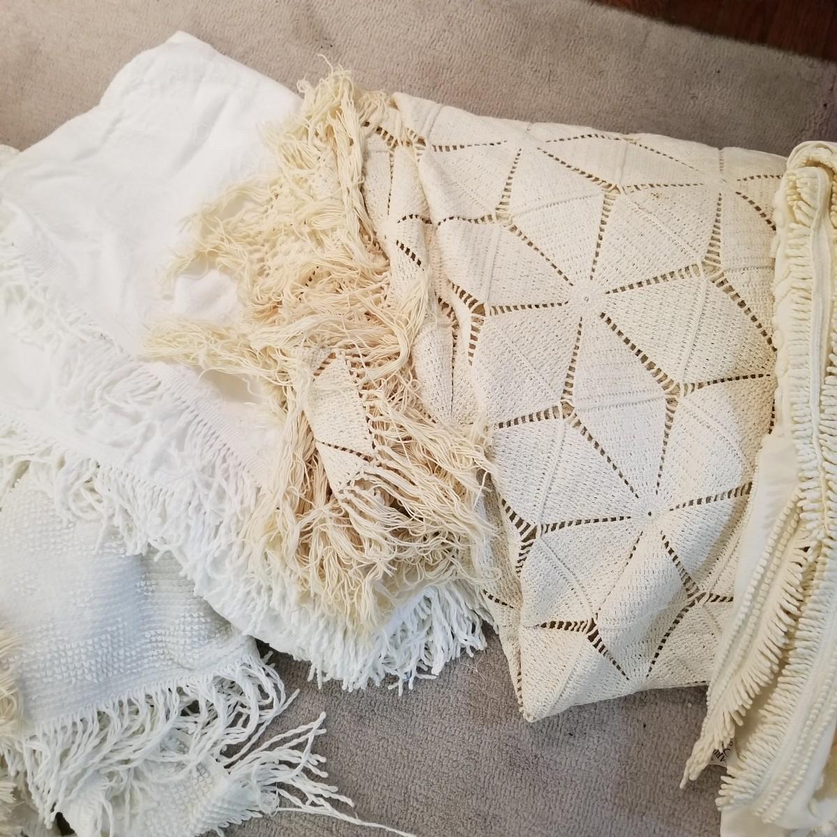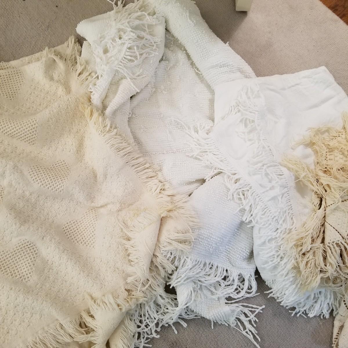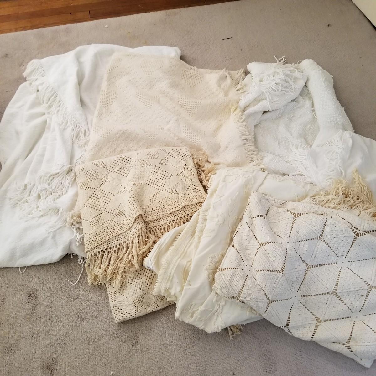 A mixture of bed toppers, white and ivory colors. Patterns, weaves, cotton, chenille. Most items in fair to good condition. Sizes range from 60"x96" to 84"x102". See photos for detail. Local pickup only.