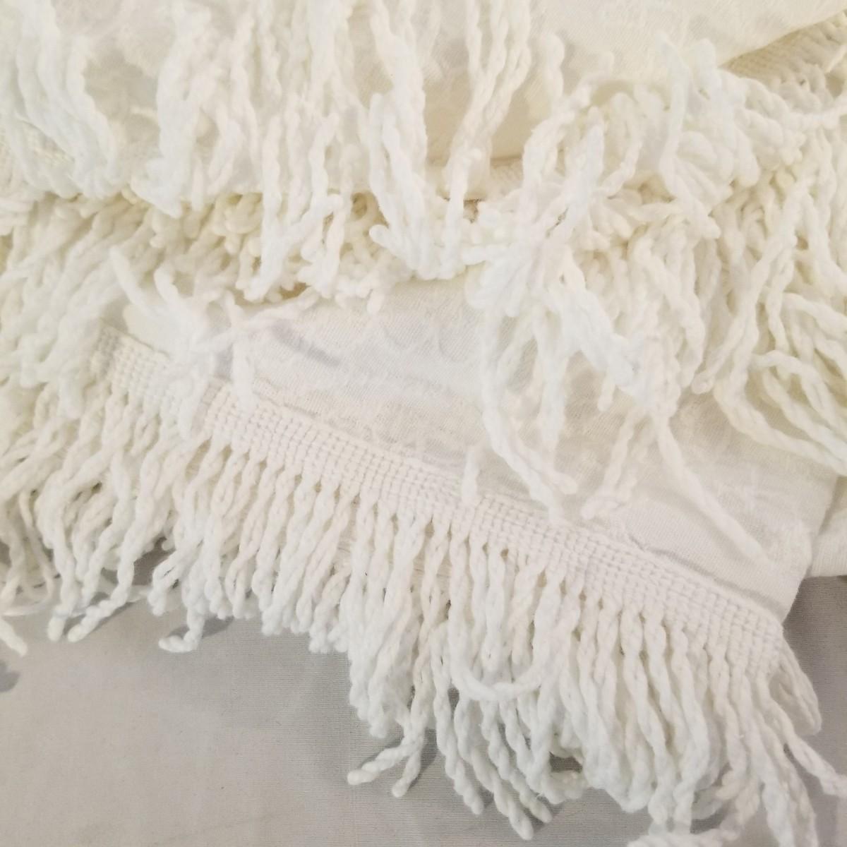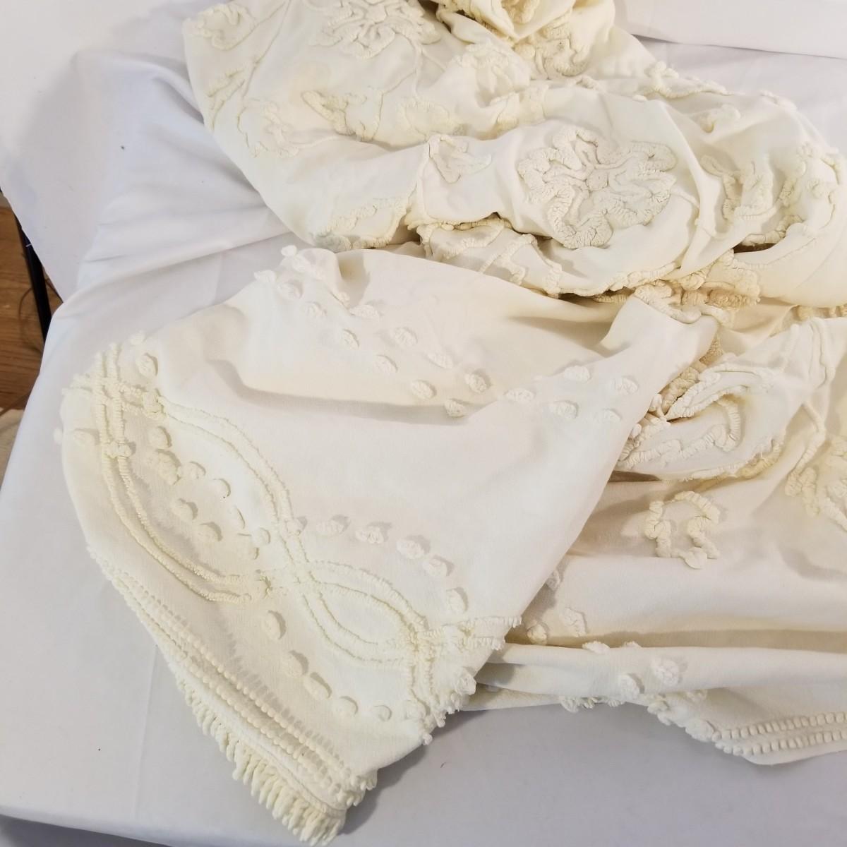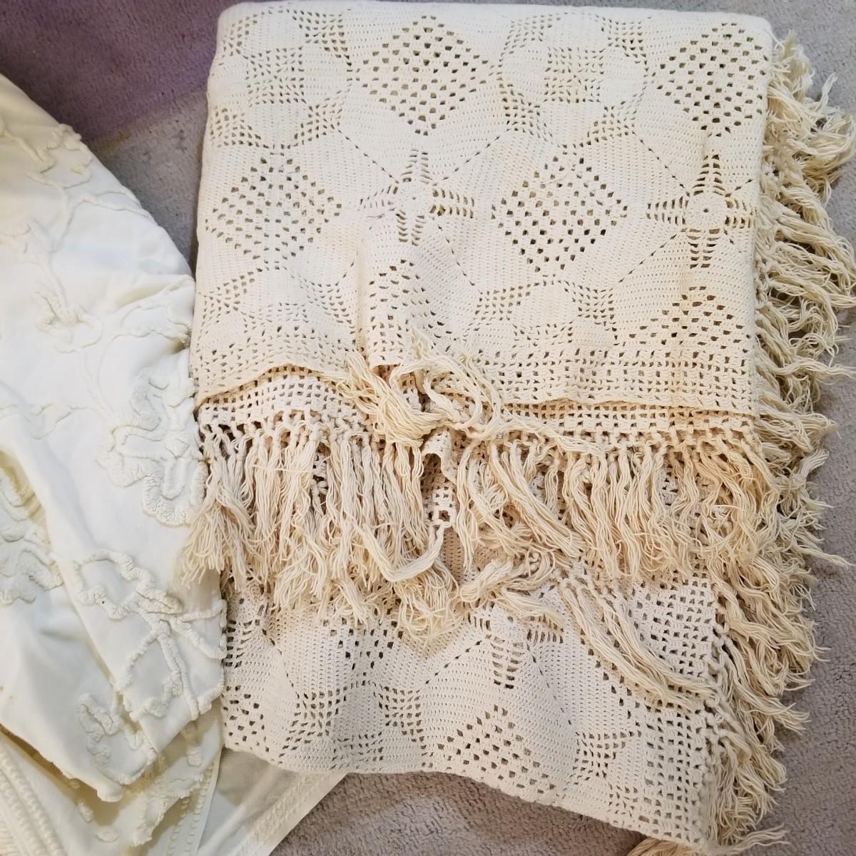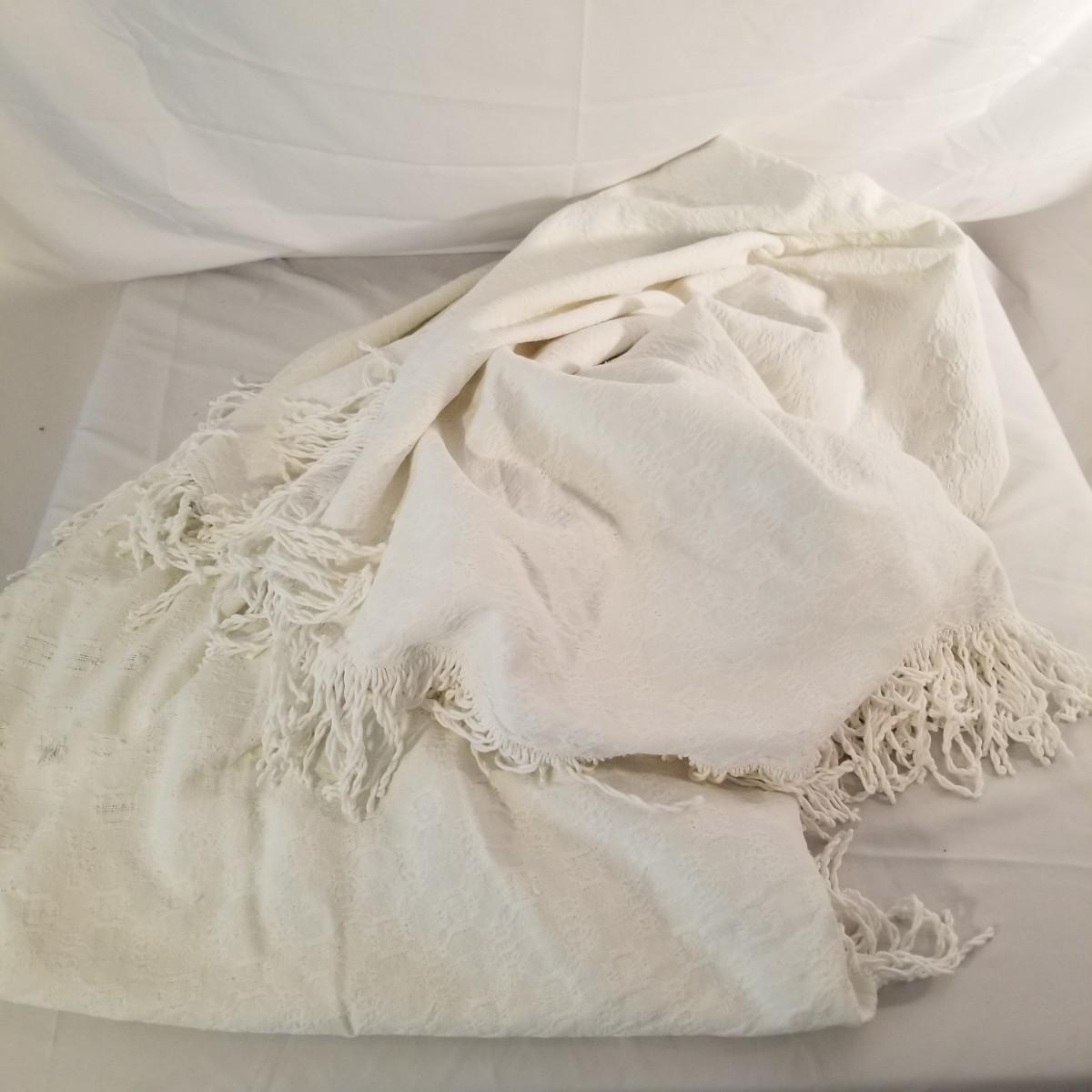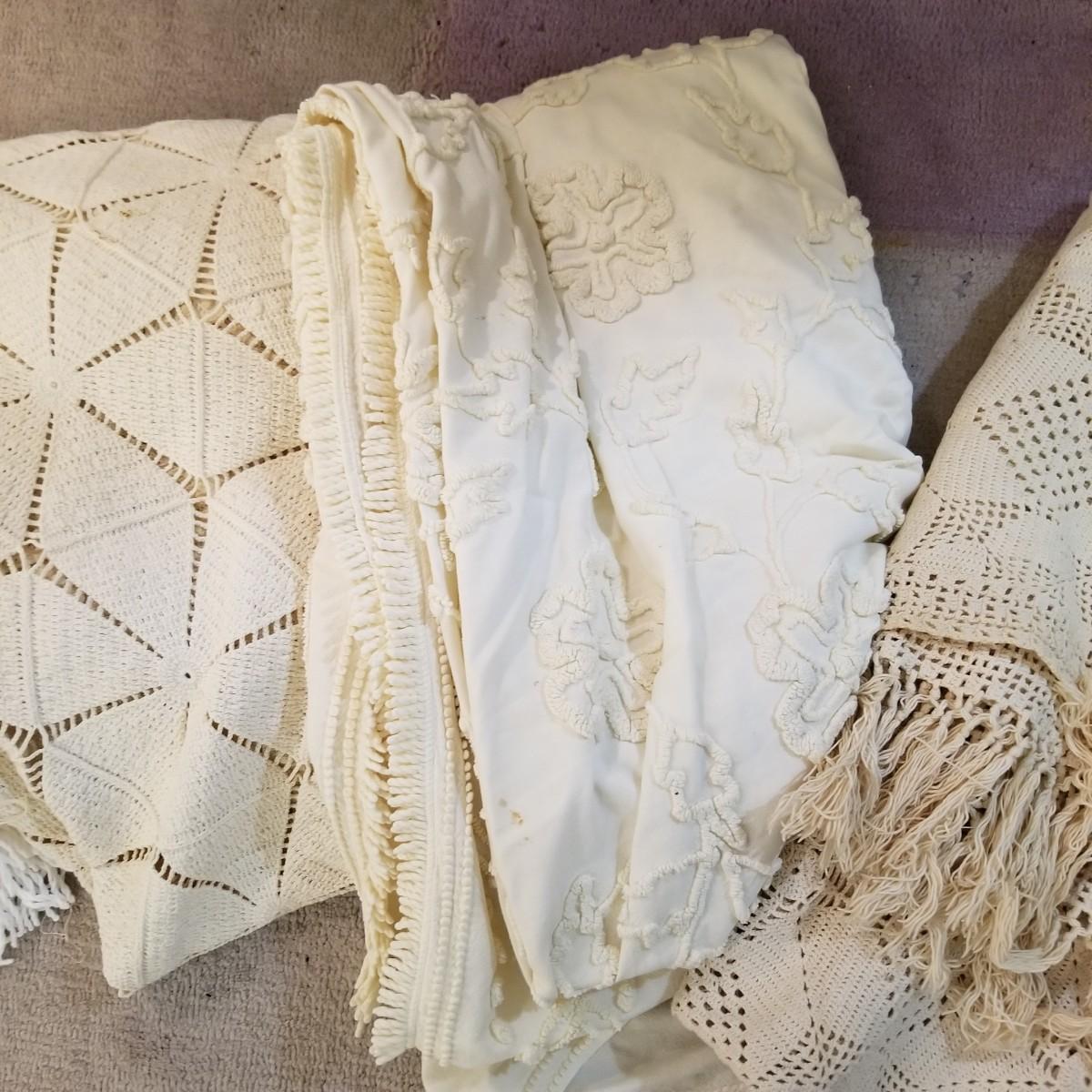 A mixture of bed toppers, white and ivory colors. Patterns, weaves, cotton, chenille. Most items in fair to good condition. Sizes range from 60"x96" to 84"x102". See photos for detail. Local pickup only.
