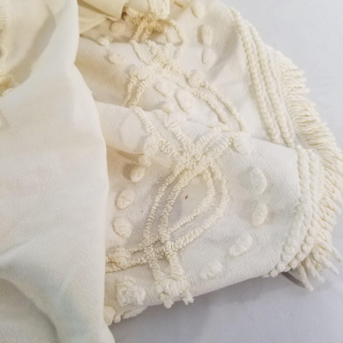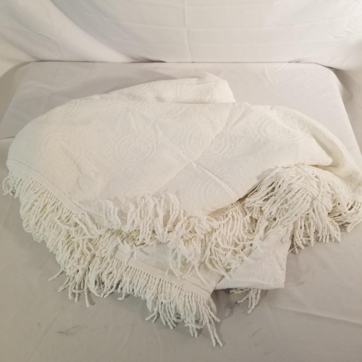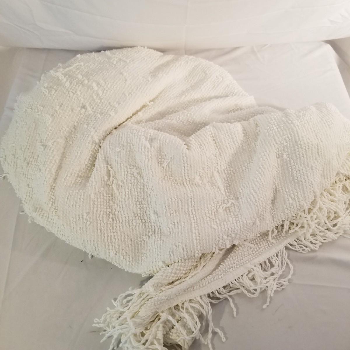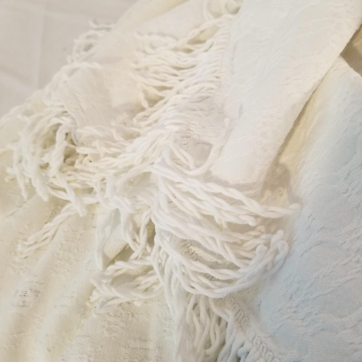 A mixture of bed toppers, white and ivory colors. Patterns, weaves, cotton, chenille. Most items in fair to good condition. Sizes range from 60"x96" to 84"x102". See photos for detail. Local pickup only.