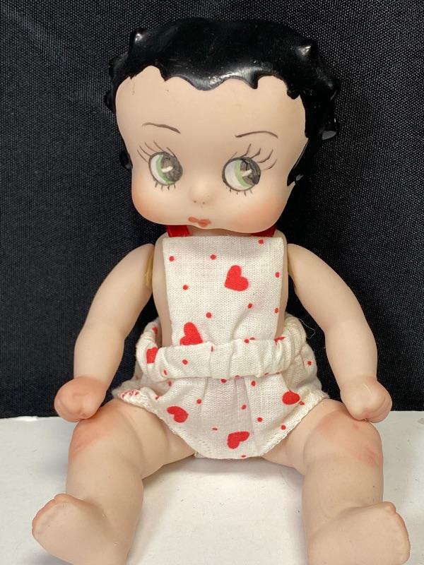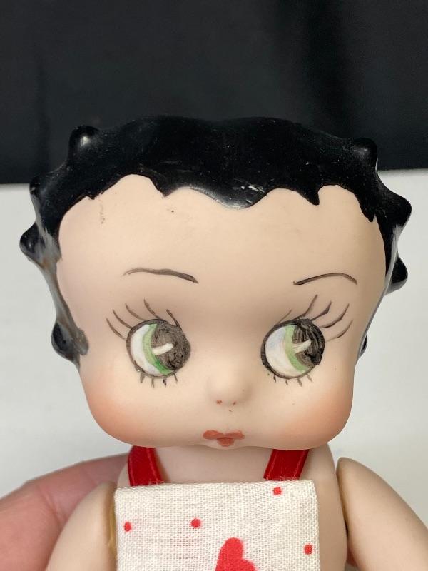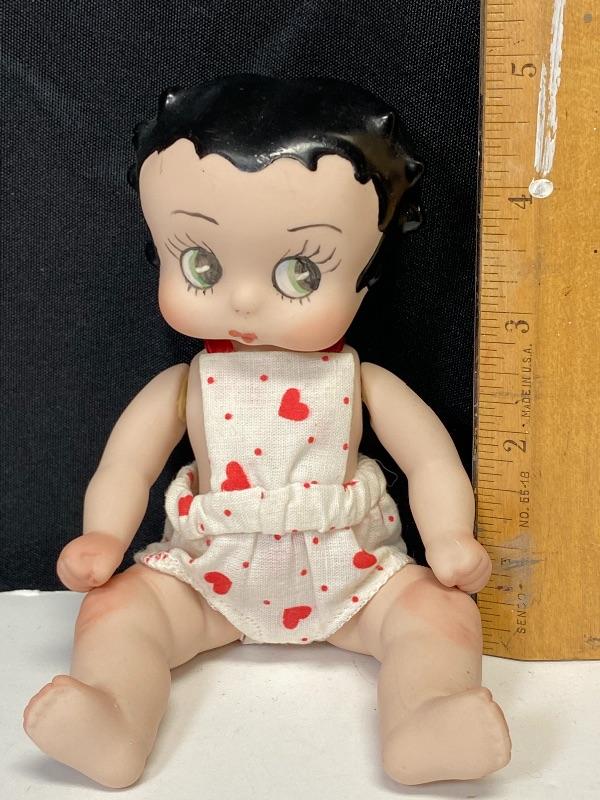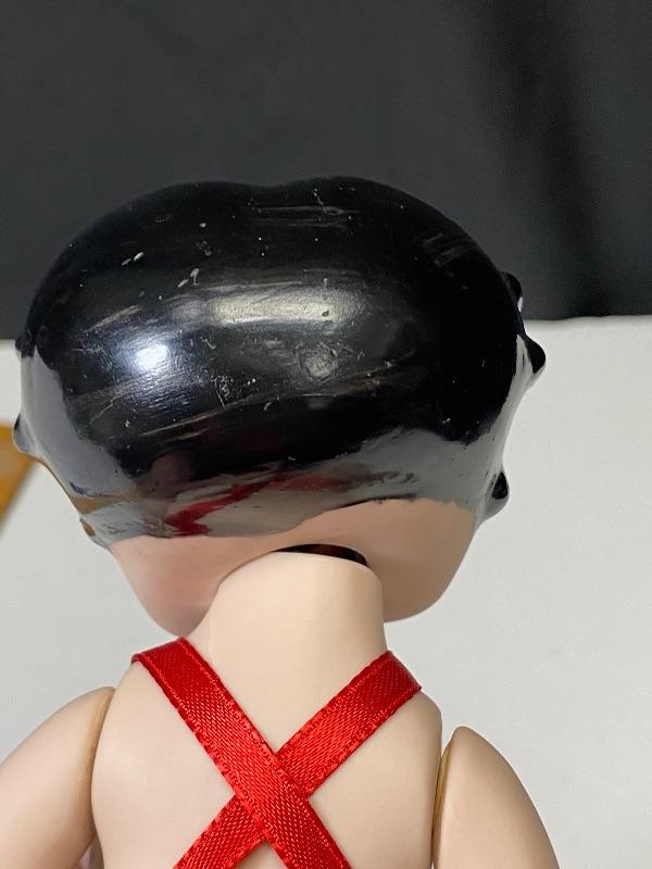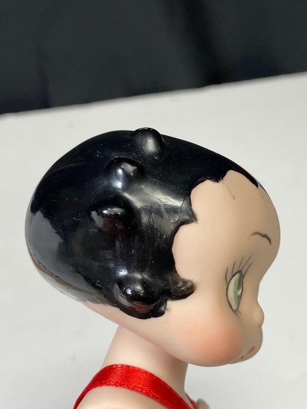 Cute 7" bisque Betty Boop doll. Jointed body, sits well. Wearing a red heart bathing suit. Looks like she may have been repainted or touched up. Unmarked. There is a chip out of her, only noticed when head is pulled up a bit. Head and neck do not fit quite right.