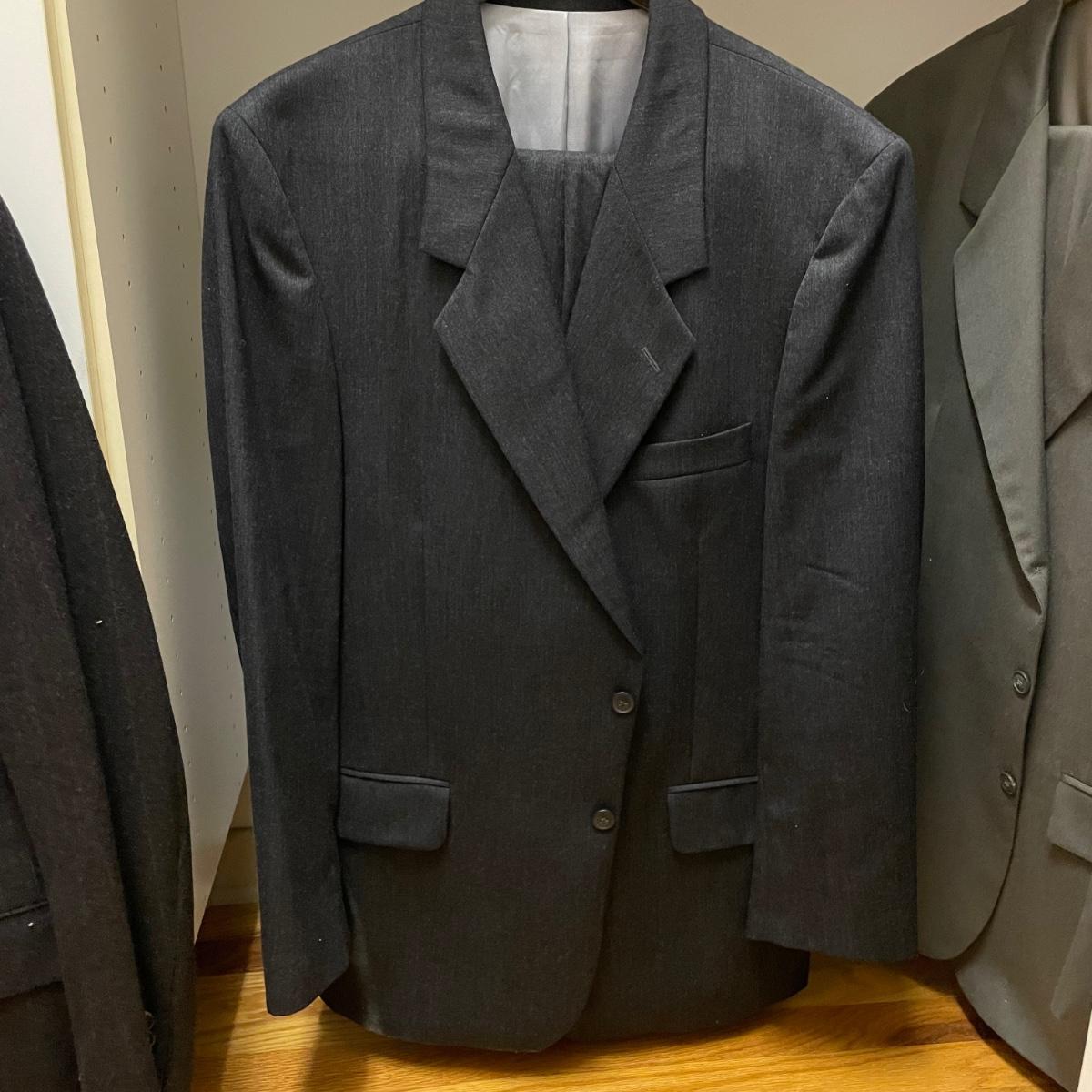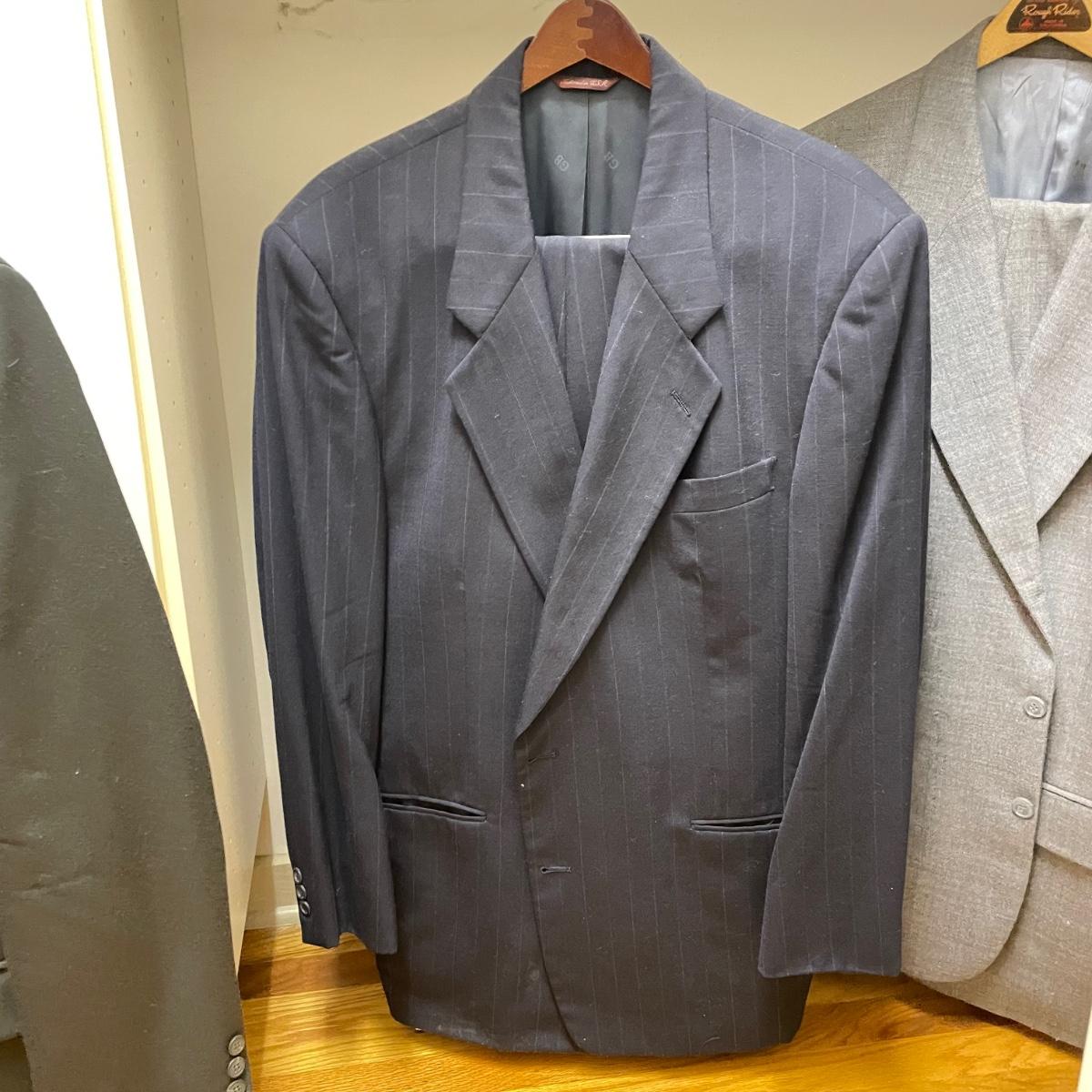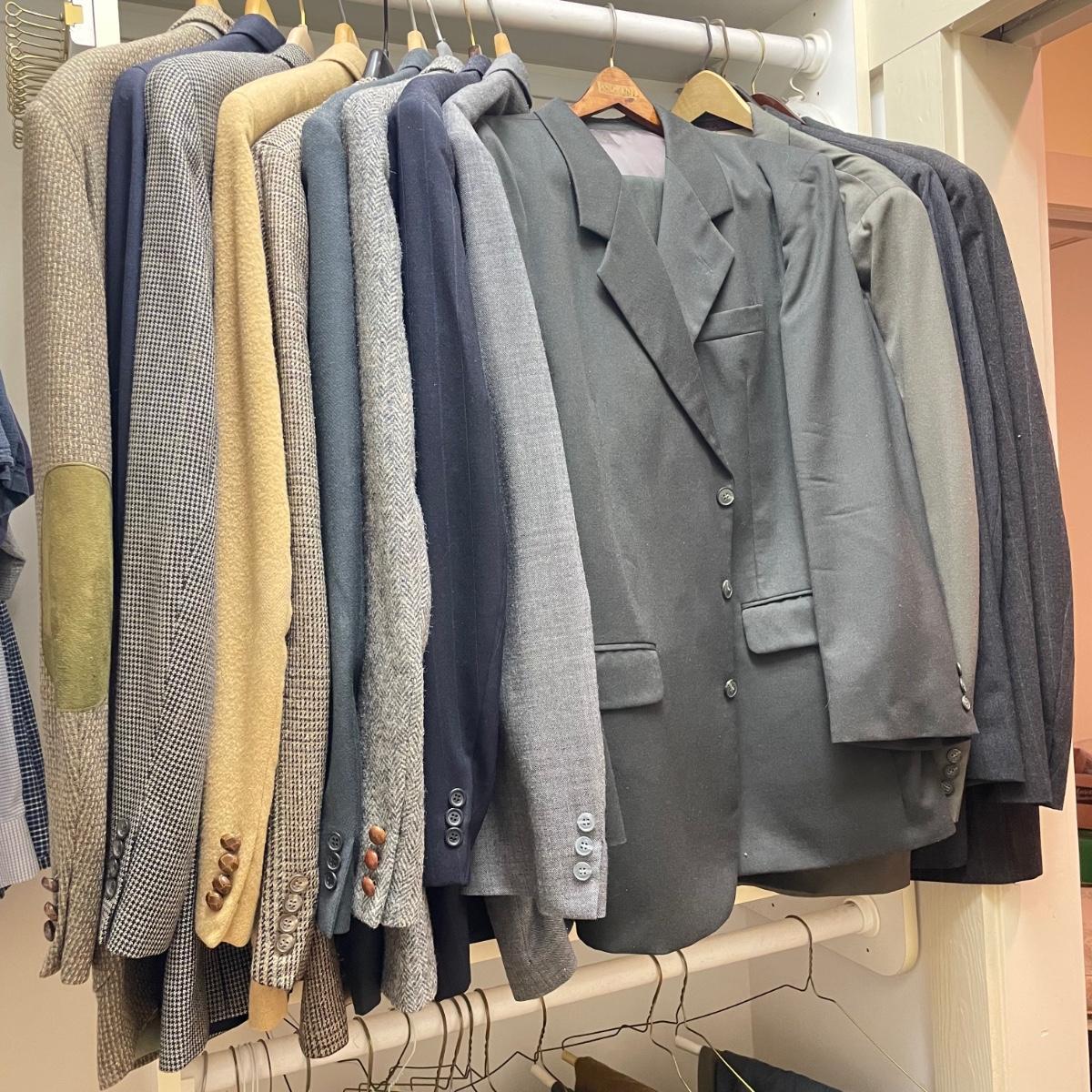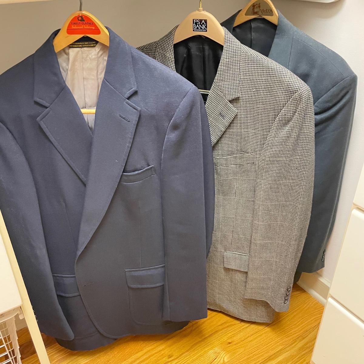 Six jacket/pants suits plus seven blazers all tailor made. A few tweed blazers, a camel hair blazer and six suits. The Atwood Tailoured for Raleighs Washington blazer measures 19” shoulder width and 32” from next to bottom, sleeves are about 24.25”. Blazer brands include Land’s End Charter, Jos A Banks, Profilo, Raleighs, Ralph Lauren. Some pants have a 44-L label. Pants found in another lot in this sale are sized 30x40. Most suits appear to be wool and all could use a nice clean- dust is found on some shoulders and a couple spots are noted in photos. See images. Shipping available. Shipping can be costly. We suggest contacting our preferred local shipping provider, Postage Express, with lot description and getting an estimate before bidding: (828) 670-5501 or postageexpress@yahoo.com.