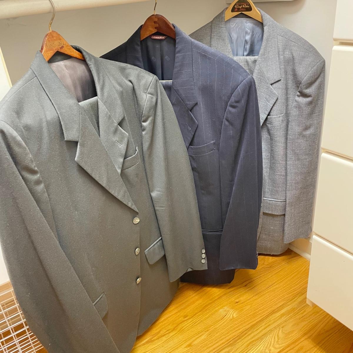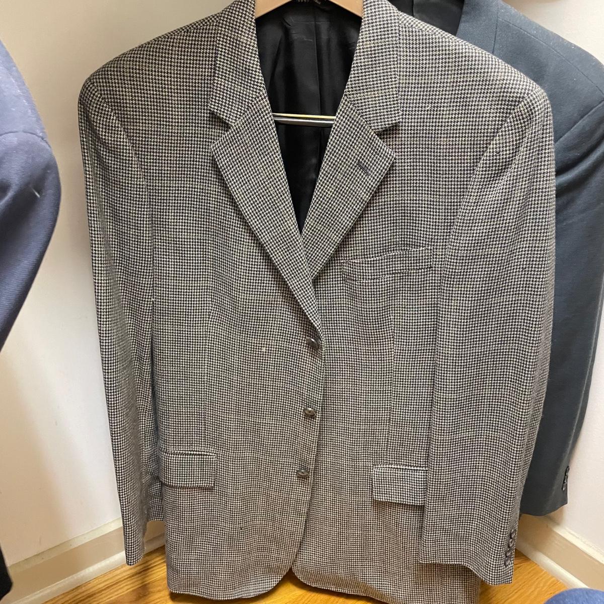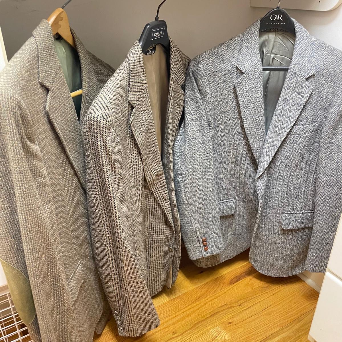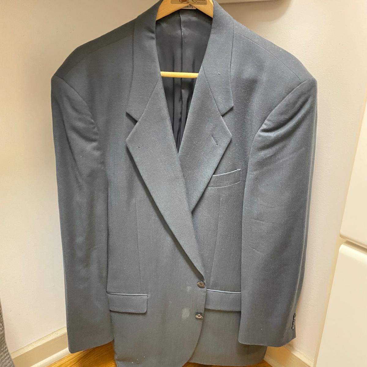 Six jacket/pants suits plus seven blazers all tailor made. A few tweed blazers, a camel hair blazer and six suits. The Atwood Tailoured for Raleighs Washington blazer measures 19” shoulder width and 32” from next to bottom, sleeves are about 24.25”. Blazer brands include Land’s End Charter, Jos A Banks, Profilo, Raleighs, Ralph Lauren. Some pants have a 44-L label. Pants found in another lot in this sale are sized 30x40. Most suits appear to be wool and all could use a nice clean- dust is found on some shoulders and a couple spots are noted in photos. See images. Shipping available. Shipping can be costly. We suggest contacting our preferred local shipping provider, Postage Express, with lot description and getting an estimate before bidding: (828) 670-5501 or postageexpress@yahoo.com.