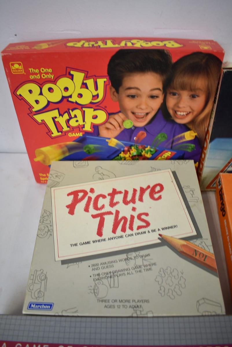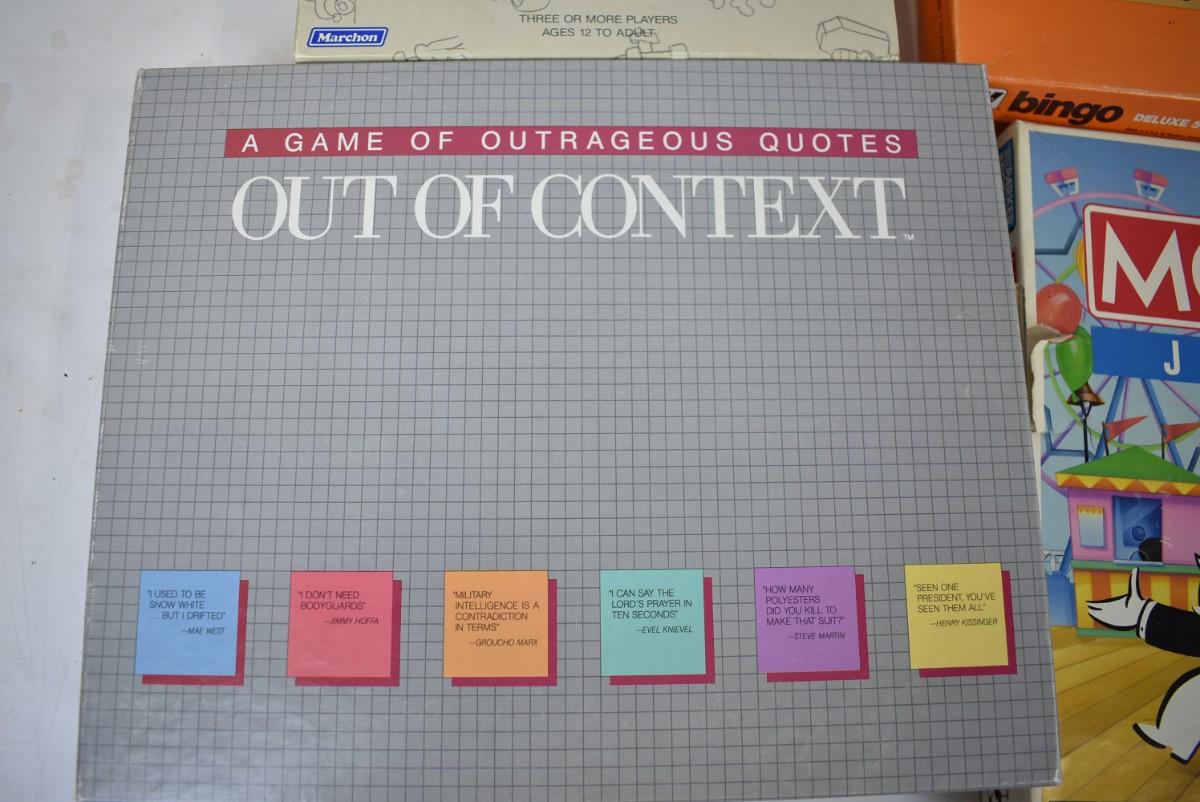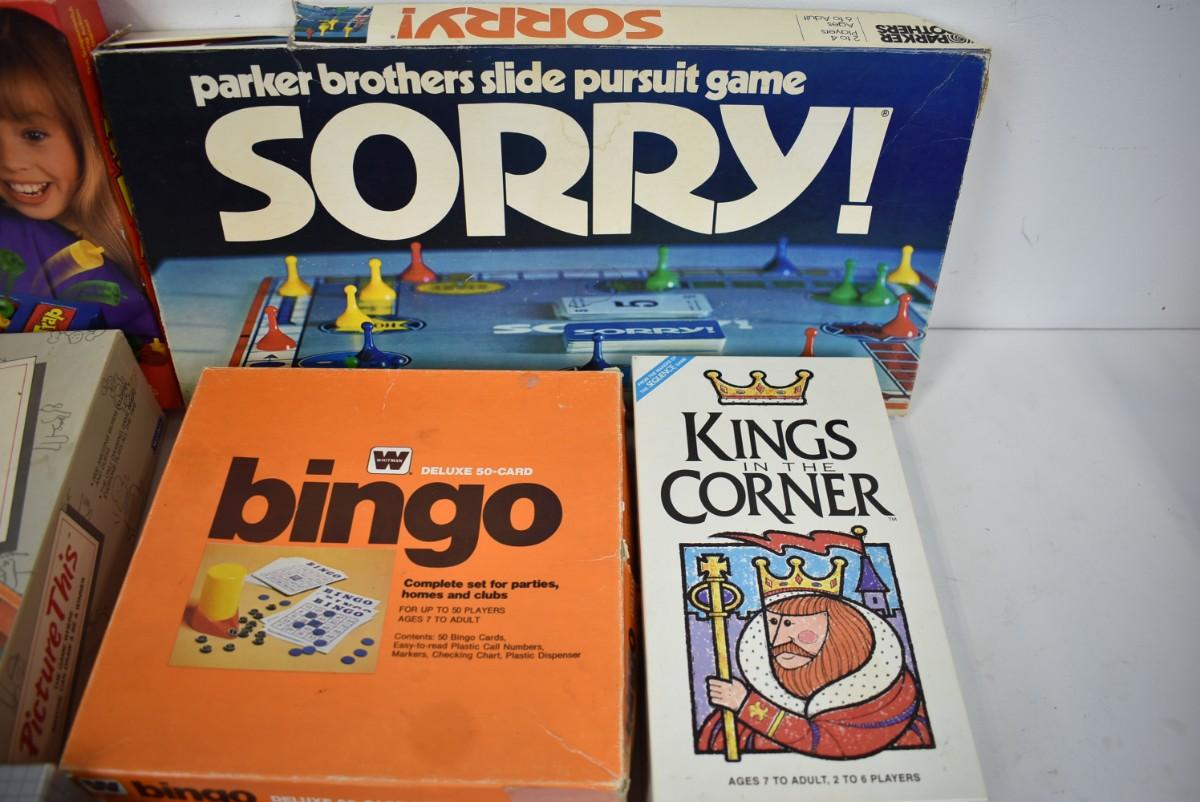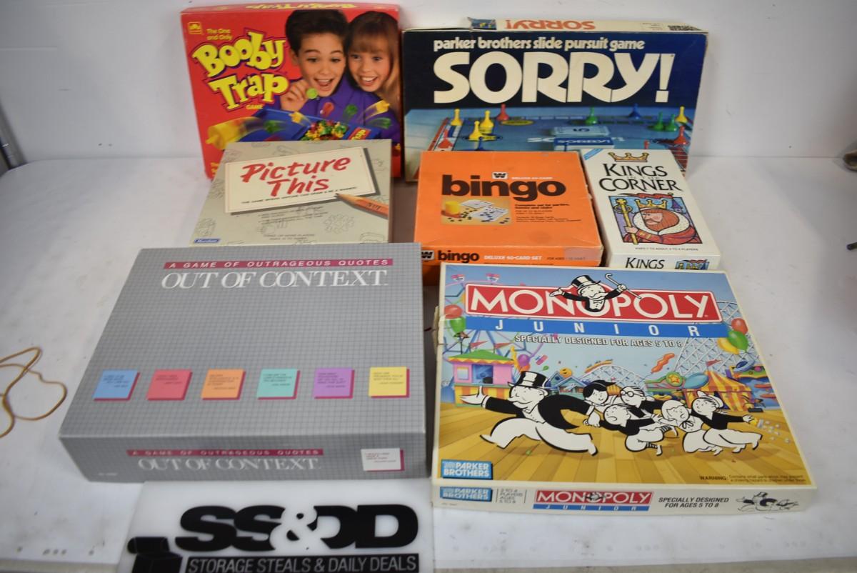 7 Board Games, Sorry, Monopoly Junior, Out of Context, Kings in the Corner, Bingo, Booby Trap, Piece Count Not Verified,