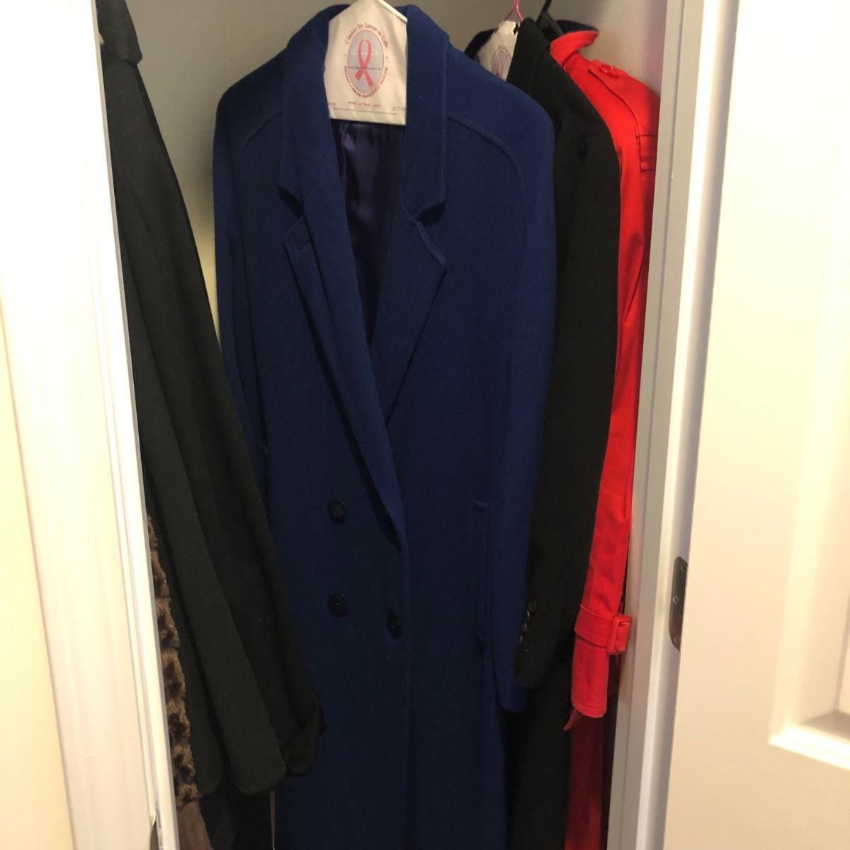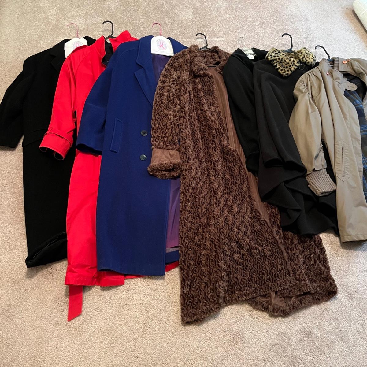 This lot includes seven coats and a pair of size 10 Rampage rubber boots. Coats are mid-length and long in sizes ranging from medium to large. Brands include London Fog, Lindsey Blake, LeMode, Preston & York, Beau Brem and Lands End. All coats are odor and stain free. The London Fog (red coat) has a liner in it and belt around the waist. The Land’s End coat is lined and made in Italy. The coat with the leopard collar is a shawl. Shipping Available.