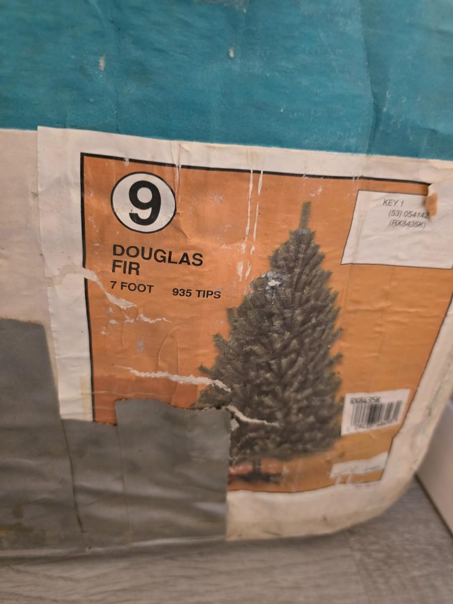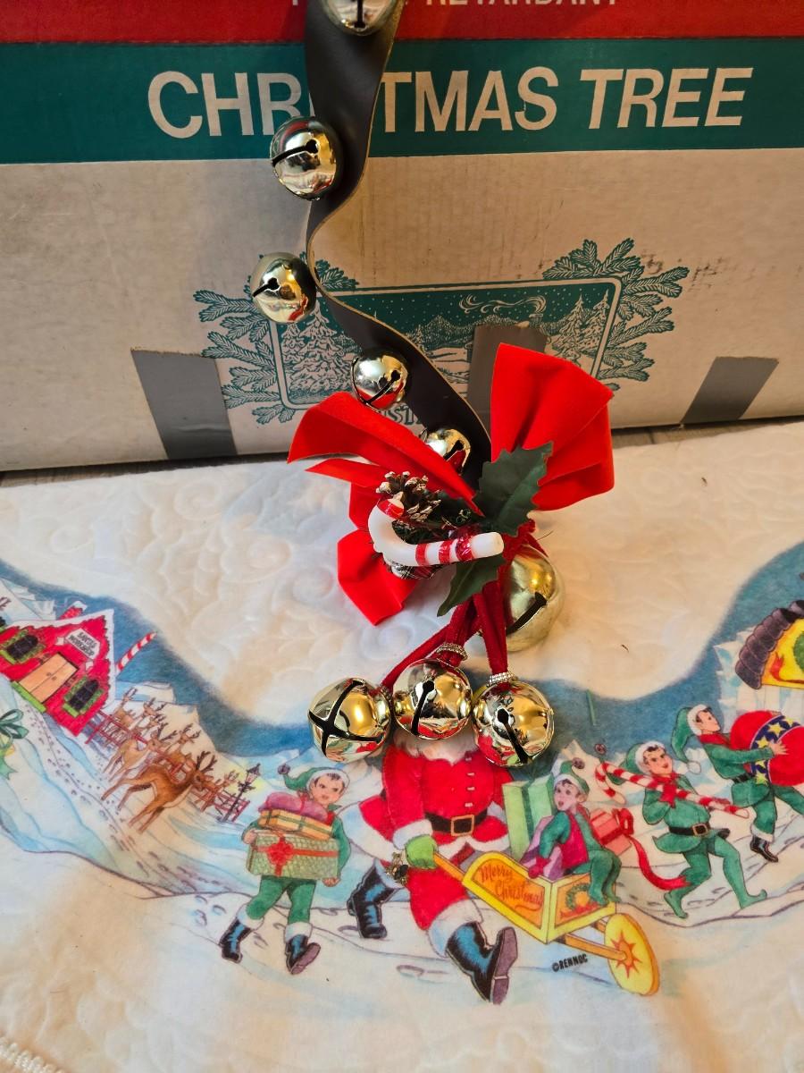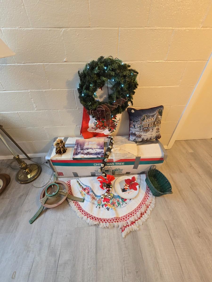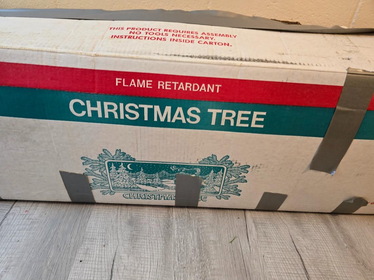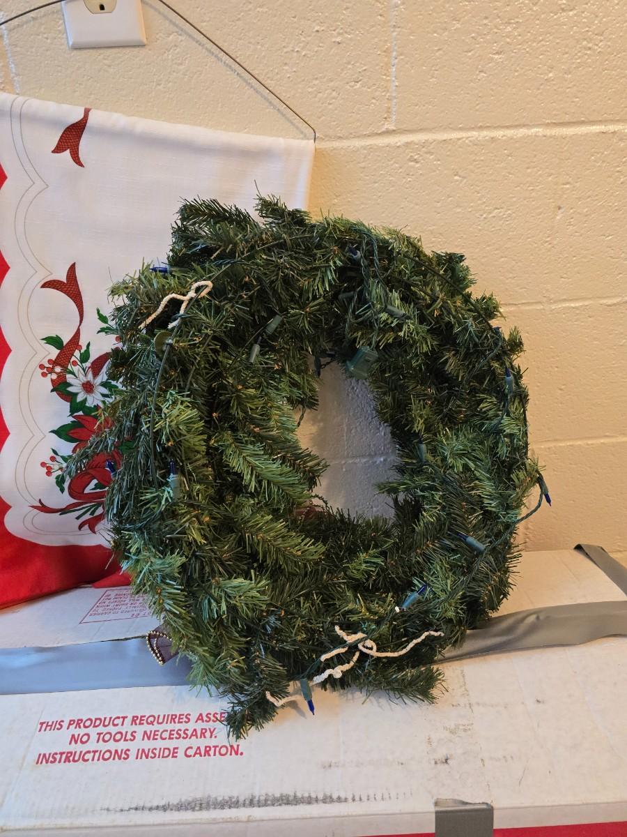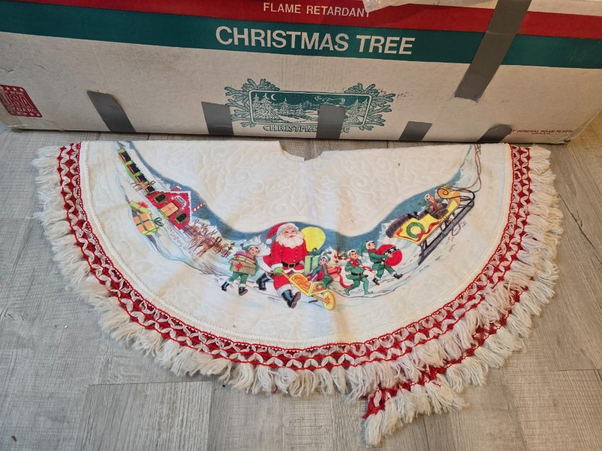 7 foot Douglas fir tree with Wreath, tree stand, vintage tablecloth, tree skirt, Jingle bells, Angel tree topper and more