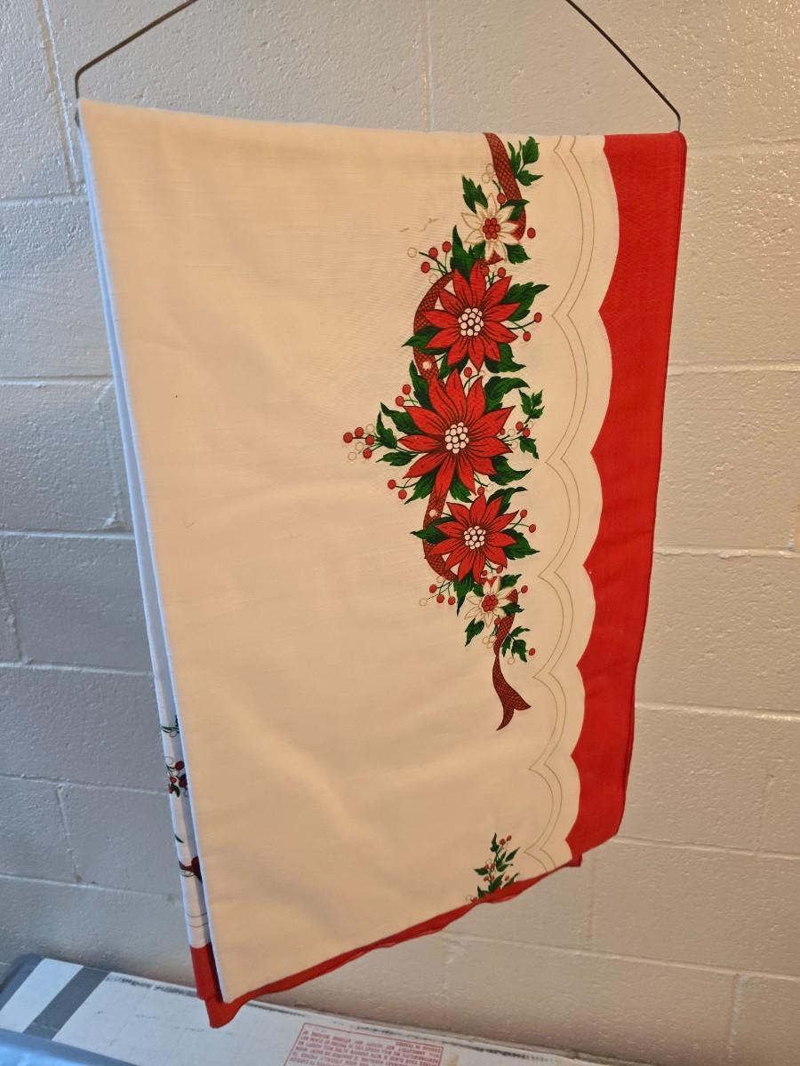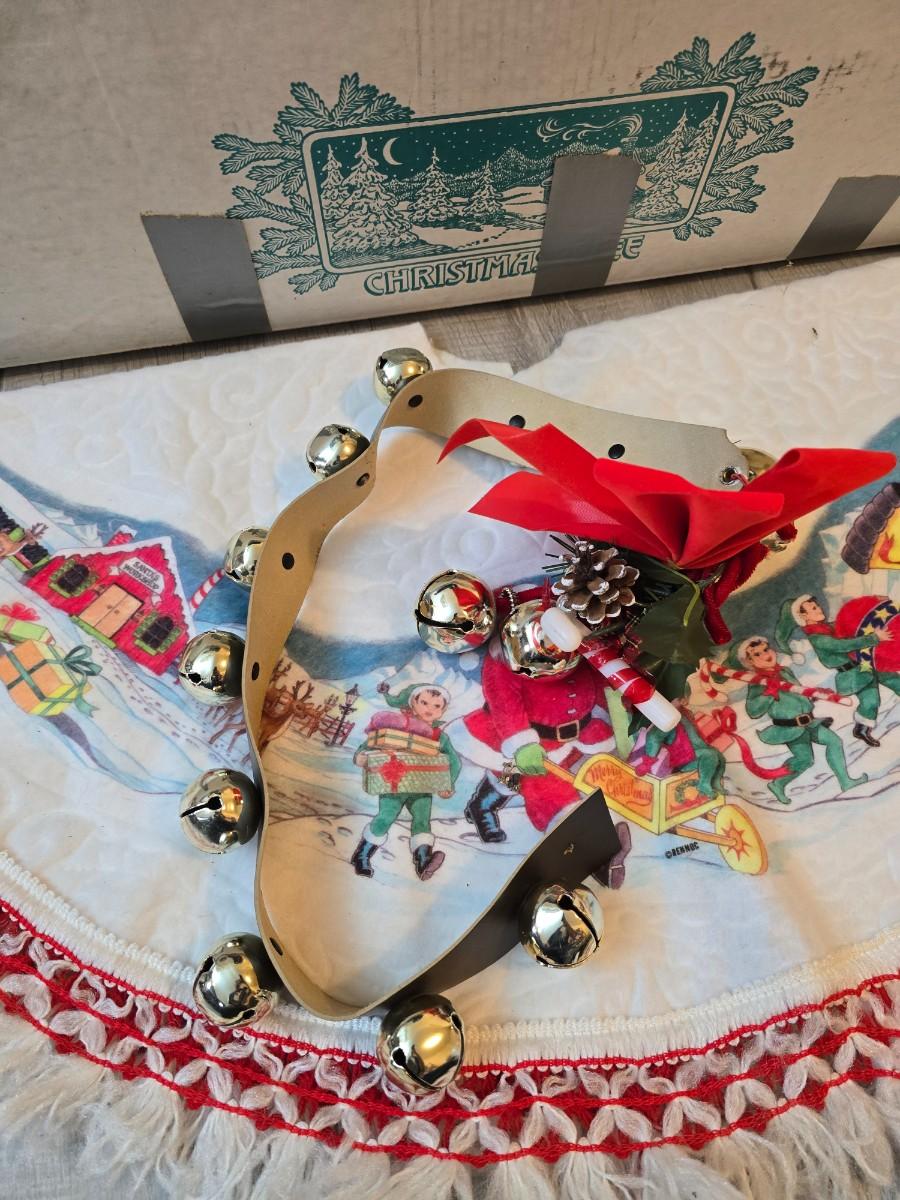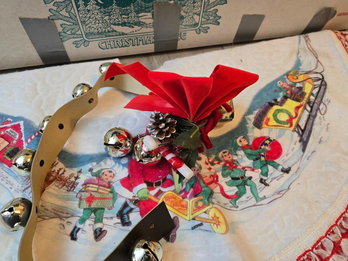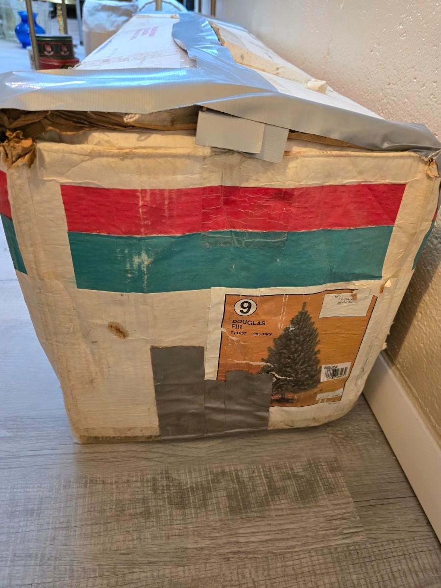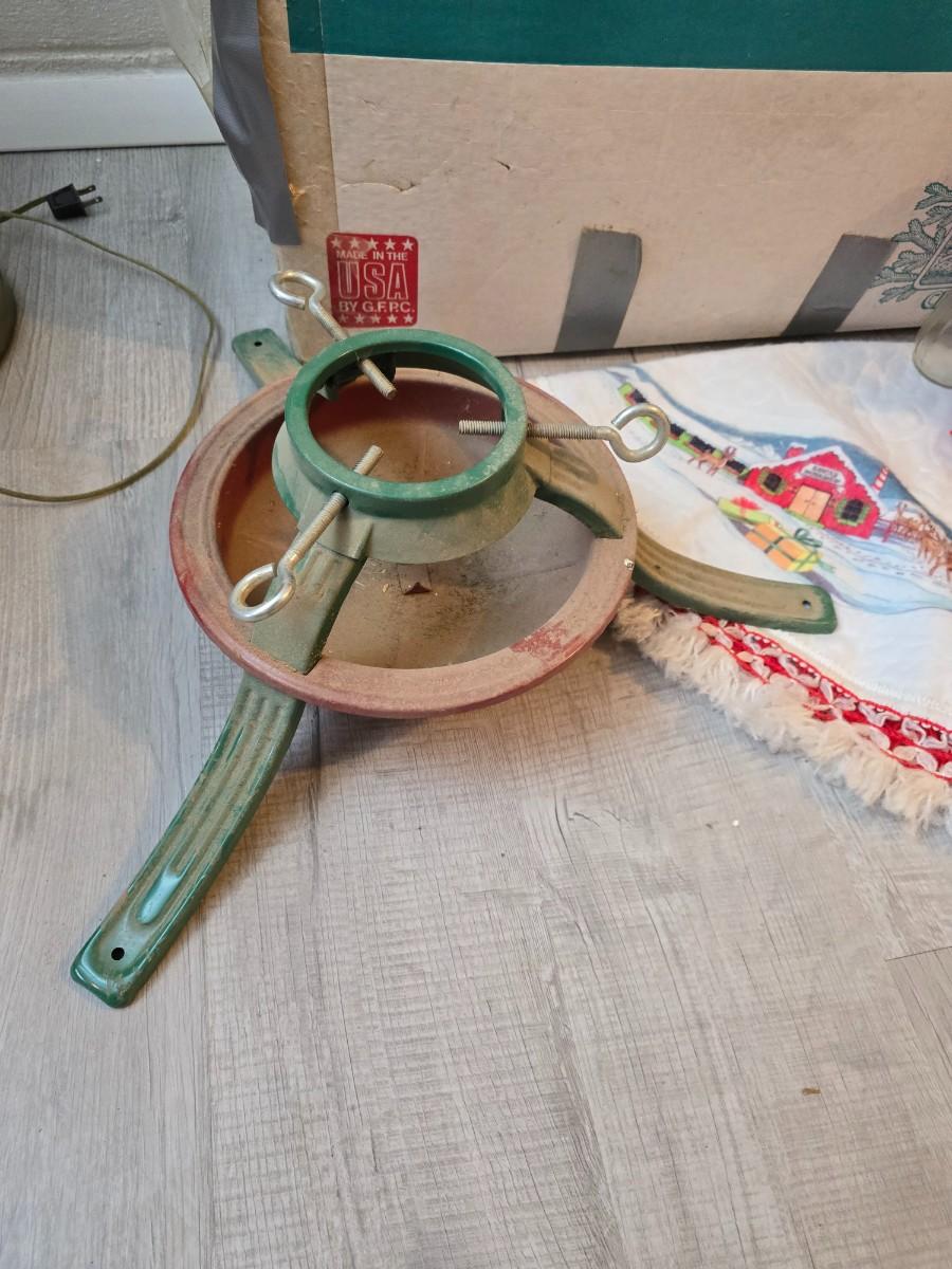 7 foot Douglas fir tree with Wreath, tree stand, vintage tablecloth, tree skirt, Jingle bells, Angel tree topper and more