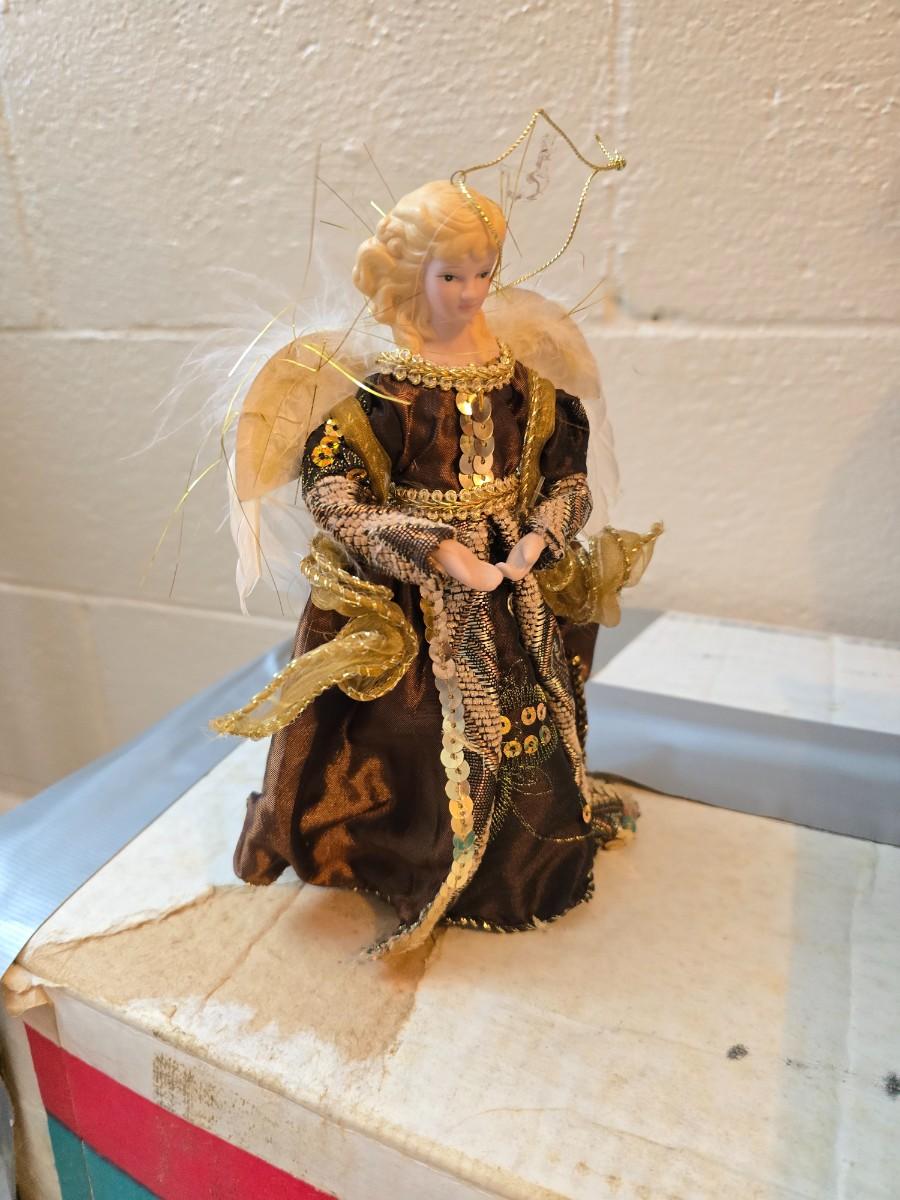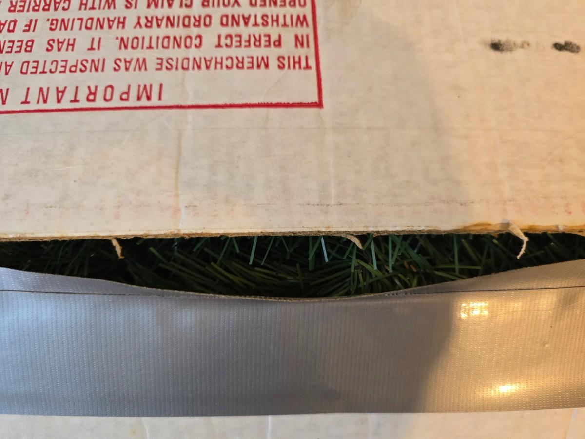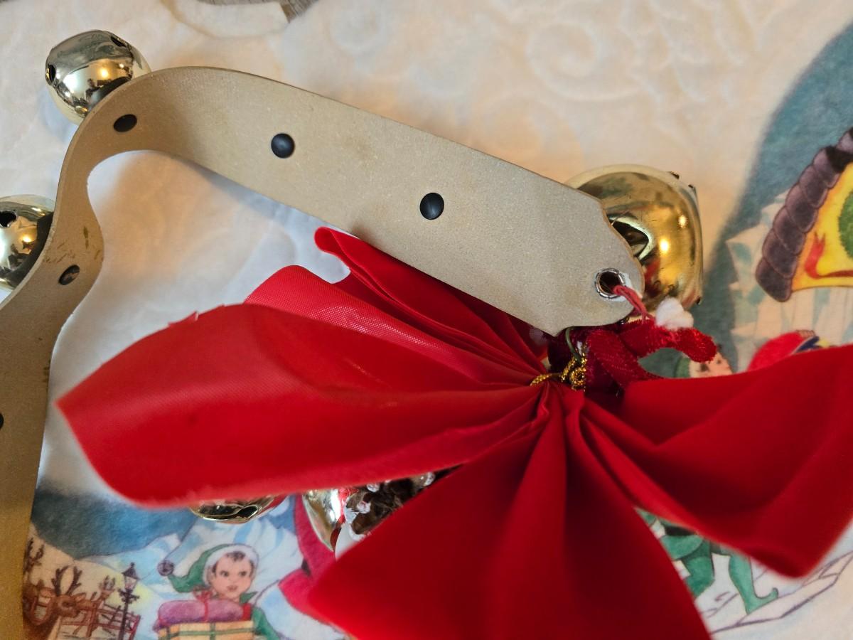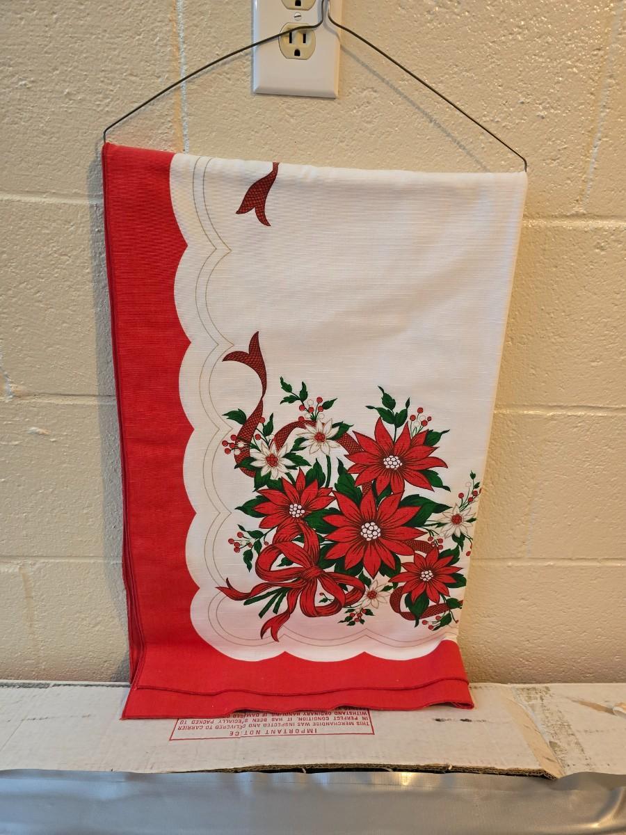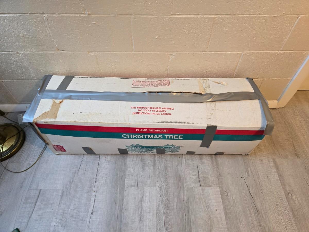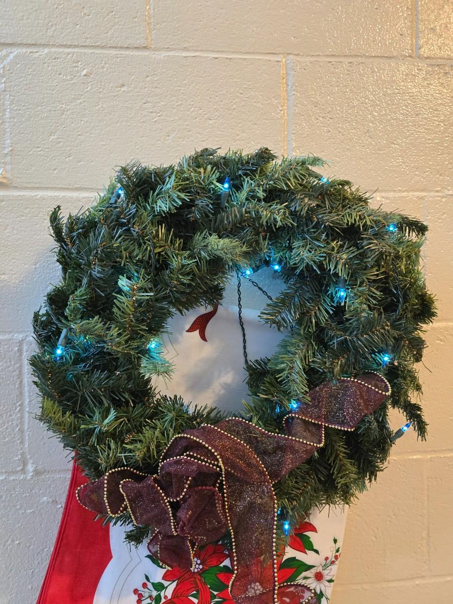7 foot Douglas fir tree with Wreath, tree stand, vintage tablecloth, tree skirt, Jingle bells, Angel tree topper and more