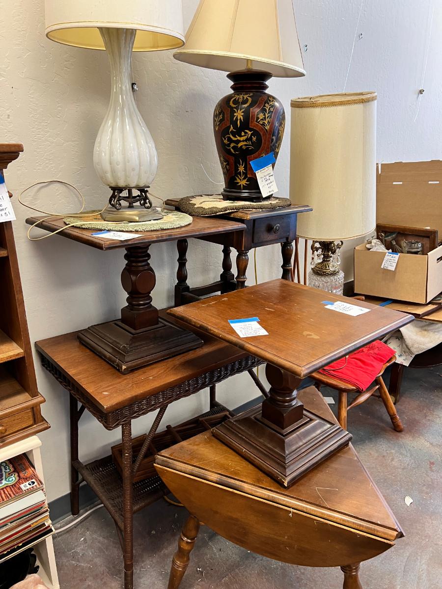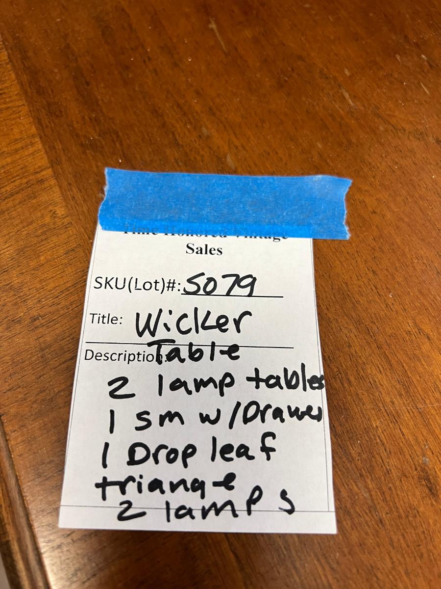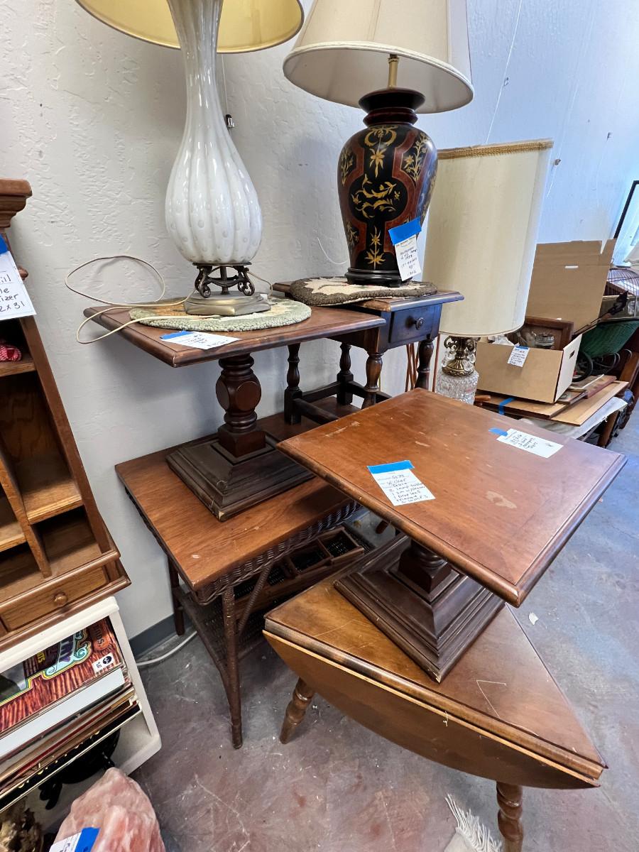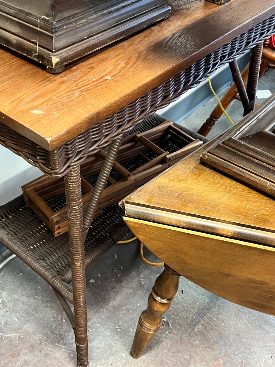 2 working Mid-century Table Lamps, 2 Lamp tables, Wicker table with shelve, Small lamp table with drawer, Triangle drop leaf table. The lamp and chair, slightly pictured on right are NOT part of this lot. pictures