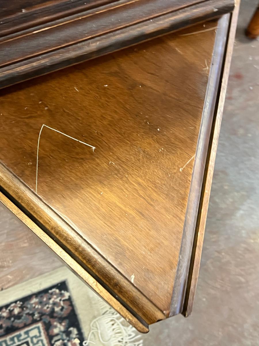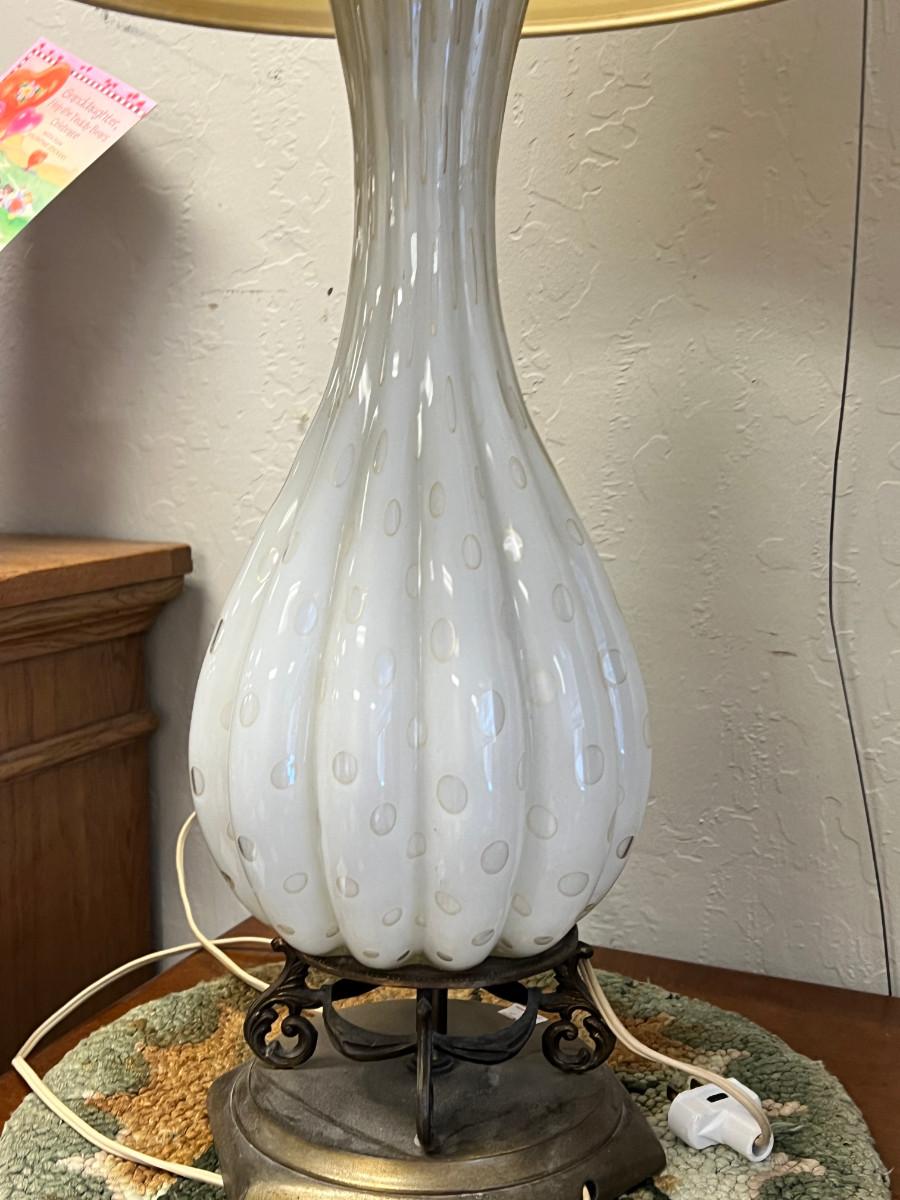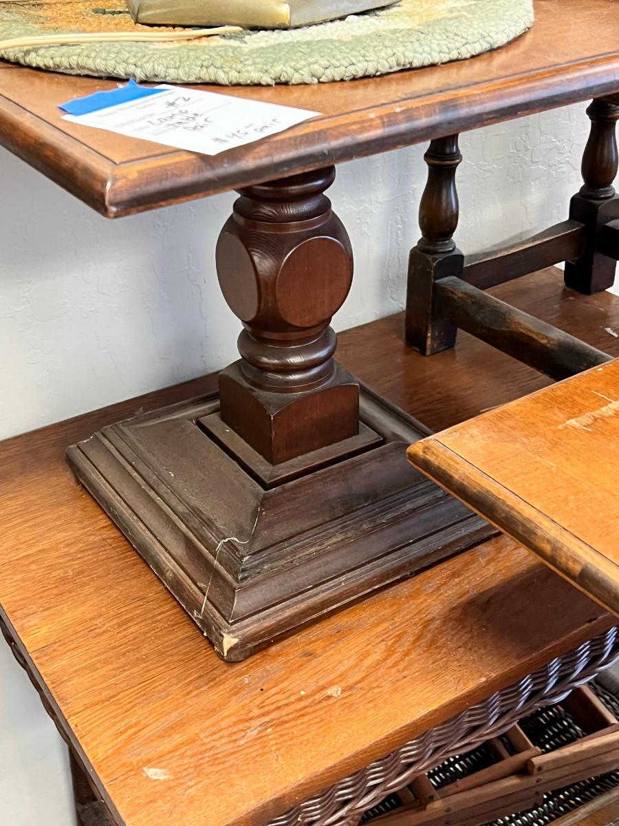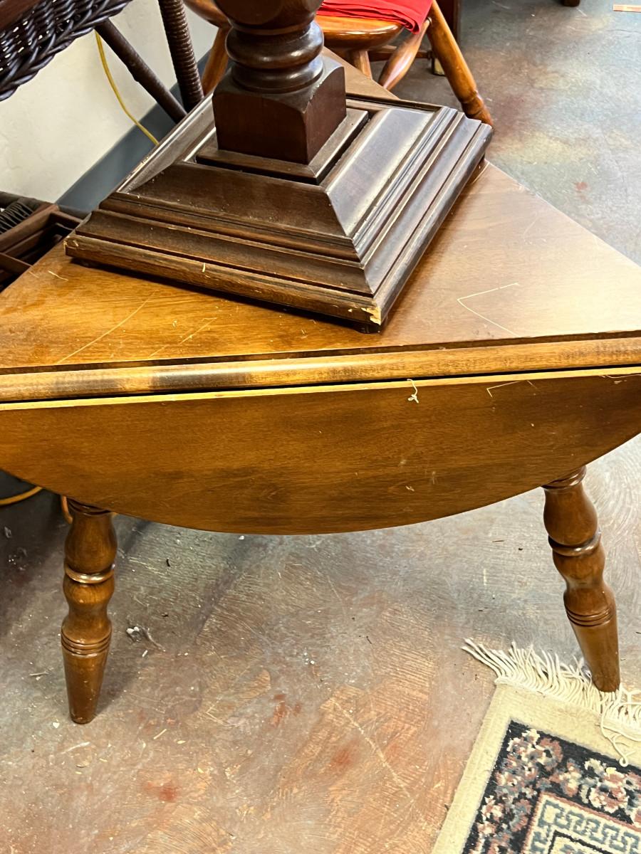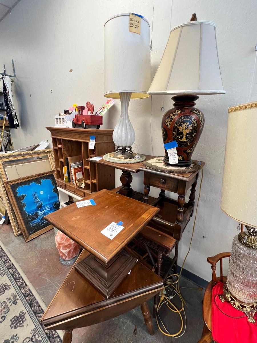 2 working Mid-century Table Lamps, 2 Lamp tables, Wicker table with shelve, Small lamp table with drawer, Triangle drop leaf table. The lamp and chair, slightly pictured on right are NOT part of this lot. pictures
